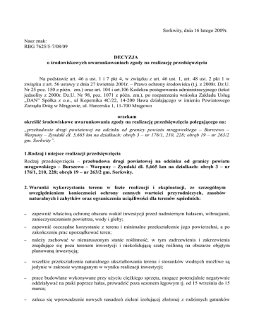 Sorkwity, dnia 16 lutego 2009r. Nasz znak: RBG 7625/5-7/08/09 DECYZJA o środowiskowych uwarunkowaniach zgody na realizację przedsięwzięcia Na podstawie art. 46 a ust. 1 i 7 pkt 4, w związku z art. 46 ust. 1, art. 48 ust. 2 pkt 1 w związku z art. 56 ustawy z dnia 27 kwietnia 2001r. – Prawo ochrony środowiska (t.j. z 2008r. Dz.U. Nr 25 poz. 150 z późn. zm.) oraz art. 104 i art.106 Kodeksu postępowania administracyjnego (tekst jednolity z 2000r. Dz.U. Nr 98, poz. 1071 z późn. zm.), po rozpatrzeniu wniosku Zakładu Usług „DAN” Spółka z o.o., ul Kopernika 4C/22, 14-200 Iława działającego w imieniu Powiatowego Zarządu Dróg w Mrągowie, ul. Harcerska 1, 11-700 Mrągowo orzekam określić środowiskowe uwarunkowania zgody na realizację przedsięwzięcia polegającego na: „przebudowie drogi powiatowej na odcinku od granicy powiatu mrągowskiego – Burszewo – Warpuny – Zyndaki dł. 5,665 km na działkach: obręb 3 – nr 176/1, 210, 228; obręb 19 – nr 263/2 gm. Sorkwity”. 1.Rodzaj i miejsce realizacji przedsięwzięcia Rodzaj przedsięwzięcia – przebudowa drogi powiatowej na odcinku od granicy powiatu mrągowskiego – Burszewo – Warpuny – Zyndaki dł. 5,665 km na działkach: obręb 3 – nr 176/1, 210, 228; obręb 19 – nr 263/2 gm. Sorkwity. 2. Warunki wykorzystania terenu w fazie realizacji i eksploatacji, ze szczególnym uwzględnieniem konieczności ochrony cennych wartości przyrodniczych, zasobów naturalnych i zabytków oraz ograniczenia uciążliwości dla terenów sąsiednich: – zapewnić właściwą ochronę obszaru wokół inwestycji przed nadmiernym hałasem, wibracjami, zanieczyszczeniem powietrza, wody i gleby; – zapewnić oszczędne korzystanie z terenu i minimalne przekształcenie jego powierzchni, a po zakończeniu prac uporządkować teren; – należy zachować w nienaruszonym stanie roślinność, w tym zadrzewienia i zakrzewienia znajdujące się poza terenem inwestycji i niekolidującą szatę roślinną na obszarze objętym planowaną inwestycją; – wszelkie przekształcenia naturalnego ukształtowania terenu i stosunków wodnych możliwe są jedynie w zakresie wymaganym w wyniku realizacji inwestycji; – prace budowlane wykonywane przy użyciu ciężkiego sprzętu, mogące potencjalnie negatywnie oddziaływać na ptaki poprzez hałas, prowadzić poza sezonem lęgowym tj. od 15 września do 15 marca; – zaleca się wprowadzenie nowych nasadzeń zieleni izolującej złożonej z rodzimych gatunków drzew i krzewów w celu uzupełnienia luk w przydrożnych alejach powstałych po wyciętych obiektach dendroflory; – nie składować odpadów i innych materiałów oraz środków chemicznych pod konarami drzew; – place manewrowe i składowiska oraz zaplecze administracyjno-socjalne zorganizować w sposób nie stwarzający zagrożenia dla środowiska, bez konieczności usuwania drzew; – drzewa znajdujące się w obrębie placu budowy, nieprzeznaczone do wycinki zabezpieczyć przed uszkodzeniami mechanicznymi; – prace ziemne i prace związane z wykorzystaniem sprzętu mechanicznego lub urządzeń technicznych, prowadzone w obrębie bryły korzeniowej drzew i krzewów wykonywać w sposób najmniej szkodzący drzewom lub krzewom zgodnie z ustawą z dnia 16 kwietnia 2004 r. o ochronie przyrody (Dz. U. Nr 92, poz. 880, ze zm.); – po wykonaniu robót ziemnych teren uporządkować; – niezbędną wycinkę drzew prowadzić tylko w celu poprawy widoczności na łukach poziomych czy ze względu na zbyt bliskie usytuowanie drzew w stosunku do krawędzi nawierzchni; – na usunięcie drzew i krzewów należy uzyskać zezwolenie na podstawie przepisów ustawy z dnia 16 kwietnia 2004 r. o ochronie przyrody (Dz. U. Nr 92, poz. 880 z późn. zm.); – grunty rolne pozostałe po realizacji inwestycji należy zrekultywować w kierunku rolnym, inne grunty zajęte na czas realizacji inwestycji należy przywrócić do stanu sprzed ich zajęcia; – odpady z terenu budowy powinny być zagospodarowane w sposób zgodny z obowiązującymi przepisami prawnymi, w pierwszej kolejności odpady należy poddać odzyskowi, a jeśli z przyczyn technologicznych jest on niemożliwy lub nie uzasadniony z przyczyn ekologicznych lub ekonomicznych, to odpady należy przekazać do unieszkodliwienia, zmagazynowane odpady z rozbiórki, przede wszystkim odpady bitumiczne oraz tłuczeń i gruz betonowy zagospodarować zgodnie z ustawa z dnia 27 kwietnia 2001 r. o odpadach (Dz. U. Nr 62, poz. 628 z późn. zm.); – należy wyznaczyć miejsca do gromadzenia odpadów powstających w trakcie realizacji inwestycji; – poziom hałasu emitowanego z planowanego przedsięwzięcia nie może przekraczać dopuszczalnych, określonych w Rozporządzeniu Ministra Środowiska z dnia 19 lipca 2004 r. w sprawie dopuszczalnych poziomów hałasu w środowisku (Dz. U. Nr 178, poz. 1841 z późn. zm.); – w przypadku podjęcia prac polegających na rozbiórce – odbudowie istniejących rowów przydrożnych, dla takiego przedsięwzięcia należy uzyskać pozwolenie wodno-prawne. 3. Wymagania dotyczące ochrony środowiska konieczne do uwzględnienia w projekcie budowlanym: – tereny objęte inwestycją, jak również teren po zapleczu budowy i parku maszynowym, należy przywrócić do stanu pierwotnego; – teren inwestycji należy odpowiednio oznakować i zabezpieczyć przed osobami niepowołanymi; – należy zapewnić odpowiednie, uregulowane odprowadzenie wód opadowych z terenu nawierzchni drogi; – przy planowanej inwestycji należy stosować urządzenia i technologie przyjazne środowisku. 4. Wymogi w zakresie przeciwdziałania skutkom awarii przemysłowych, w odniesieniu do przedsięwzięć zaliczanych do zakładów stwarzających zagrożenie wystąpienia poważnych awarii: – nie są wymagane w przedmiotowej sprawie 5. Wymogi w zakresie ograniczenia transgranicznego oddziaływania na środowisko w odniesieniu do przedsięwzięć, dla których przeprowadzono postępowa