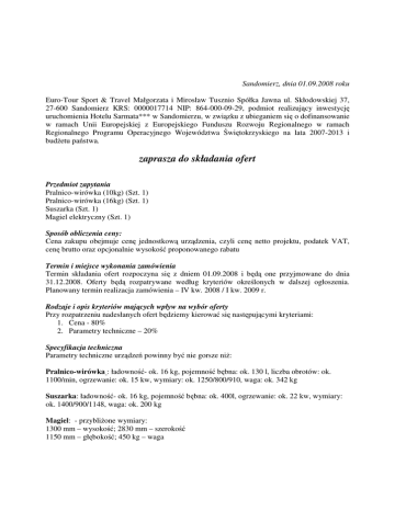 Sandomierz, dnia 01.09.2008 roku Euro-Tour Sport & Travel Małgorzata i Mirosław Tusznio Spółka Jawna ul. Skłodowskiej 37, 27-600 Sandomierz KRS: 0000017714 NIP: 864-000-09-29, podmiot realizujący inwestycję uruchomienia Hotelu Sarmata*** w Sandomierzu, w związku z ubieganiem się o dofinansowanie w ramach Unii Europejskiej z Europejskiego Funduszu Rozwoju Regionalnego w ramach Regionalnego Programu Operacyjnego Województwa Świętokrzyskiego na lata 2007-2013 i budżetu państwa. zaprasza do składania ofert Przedmiot zapytania Pralnico-wirówka (10kg) (Szt. 1) Pralnico-wirówka (16kg) (Szt. 1) Suszarka (Szt. 1) Magiel elektryczny (Szt. 1) Sposób obliczenia ceny: Cena zakupu obejmuje cenę jednostkową urządzenia, czyli cenę netto projektu, podatek VAT, cenę brutto oraz opcjonalnie wysokość proponowanego rabatu Termin i miejsce wykonania zamówienia Termin składania ofert rozpoczyna się z dniem 01.09.2008 i będą one przyjmowane do dnia 31.12.2008. Oferty będą rozpatrywane według kryteriów określonych w dalszej ogłoszenia. Planowany termin realizacja zamówienia – IV kw. 2008 / I kw. 2009 r. Rodzaje i opis kryteriów mających wpływ na wybór oferty Przy rozpatrzeniu nadesłanych ofert będziemy kierować się następującymi kryteriami: 1. Cena - 80% 2. Parametry techniczne – 20% Specyfikacja techniczna Parametry techniczne urządzeń powinny być nie gorsze niż: Pralnico-wirówka : ładowność- ok. 16 kg, pojemność bębna: ok. 130 l, liczba obrotów: ok. 1100/min, ogrzewanie: ok. 15 kw, wymiary: ok. 1250/800/910, waga: ok. 342 kg Suszarka: ładowność- ok. 16 kg, pojemność bębna: ok. 400l, ogrzewanie: ok. 22 kw, wymiary: ok. 1400/900/1148, waga: ok. 200 kg Magiel: - przybliżone wymiary: 1300 mm – wysokość; 2830 mm – szerokość 1150 mm – głębokość; 450 kg – waga ogrzewanie elektryczne – ok. 22 Kw całkowite podłączenie – ok. 24 Kw wydajność przy 25% wilgotności wprowadzanego prania – ok. 100 kg/h; wydajność przy 50% wilgotności wprowadzanego prania – ok. 60 kg/h Dopuszcza się składanie ofert na poszczególne pojedyncze urządzenia. Miejsce, sposób i termin składania ofert: Oferty prosimy składać osobiście lub pocztą na adres biura firmy: Biuro Podróży Euro-Tour ul. Opatowska 9, 27-600 Sandomierz lub drogą elektroniczną na adres [email protected] w terminie określonym w niniejszym zaproszeniu. Decyzja o wyborze dostawcy zostanie umieszczona na stronie internetowej firmy www.eurotour.com.pl w ciągu 21 dni od dnia zakończenia terminu składania ofert. Projekt inwestycyjny pt. "Uruchomienie zabytkowego zespołu dworskiego Hotel Sarmata*** w Sandomierzu - innowacyjnego regionalnego produktu turystycznego" ubiega się o dofinansowanie Unii Europejskiej z Europejskiego Funduszu Rozwoju Regionalnego w ramach Regionalnego Programu Operacyjnego Województwa Świętokrzyskiego na lata 2007-2013 i budżetu państwa.