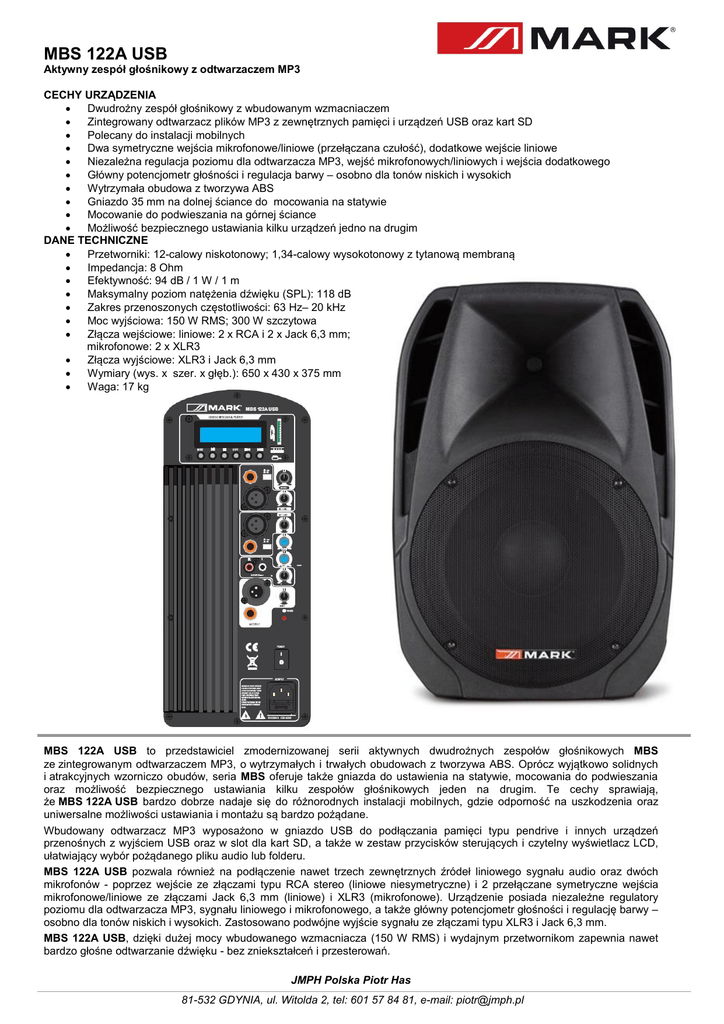MBS 122A USB Aktywny zespół głośnikowy z odtwarzaczem MP3 CECHY URZĄDZENIA Dwudrożny zespół głośnikowy z wbudowanym wzmacniaczem Zintegrowany odtwarzacz plików MP3 z zewnętrznych pamięci i urządzeń USB oraz kart SD Polecany do instalacji mobilnych Dwa symetryczne wejścia mikrofonowe/liniowe (przełączana czułość), dodatkowe wejście liniowe Niezależna regulacja poziomu dla odtwarzacza MP3, wejść mikrofonowych/liniowych i wejścia dodatkowego Główny potencjometr głośności i regulacja barwy – osobno dla tonów niskich i wysokich Wytrzymała obudowa z tworzywa ABS Gniazdo 35 mm na dolnej ściance do mocowania na statywie Mocowanie do podwieszania na górnej ściance Możliwość bezpiecznego ustawiania kilku urządzeń jedno na drugim DANE TECHNICZNE Przetworniki: 12-calowy niskotonowy; 1,34-calowy wysokotonowy z tytanową membraną Impedancja: 8 Ohm Efektywność: 94 dB / 1 W / 1 m Maksymalny poziom natężenia dźwięku (SPL): 118 dB Zakres przenoszonych częstotliwości: 63 Hz– 20 kHz Moc wyjściowa: 150 W RMS; 300 W szczytowa Złącza wejściowe: liniowe: 2 x RCA i 2 x Jack 6,3 mm; mikrofonowe: 2 x XLR3 Złącza wyjściowe: XLR3 i Jack 6,3 mm Wymiary (wys. x szer. x głęb.): 650 x 430 x 375 mm Waga: 17 kg MBS 122A USB to przedstawiciel zmodernizowanej serii aktywnych dwudrożnych zespołów głośnikowych MBS ze zintegrowanym odtwarzaczem MP3, o wytrzymałych i trwałych obudowach z tworzywa ABS. Oprócz wyjątkowo solidnych i atrakcyjnych wzorniczo obudów, seria MBS oferuje także gniazda do ustawienia na statywie, mocowania do podwieszania oraz możliwość bezpiecznego ustawiania kilku zespołów głośnikowych jeden na drugim. Te cechy sprawiają, że MBS 122A USB bardzo dobrze nadaje się do różnorodnych instalacji mobilnych, gdzie odporność na uszkodzenia oraz uniwersalne możliwości ustawiania i montażu są bardzo pożądane. Wbudowany odtwarzacz MP3 wyposażono w gniazdo USB do podłączania pamięci typu pendrive i innych urządzeń przenośnych z wyjściem USB oraz w slot dla kart SD, a także w zestaw przycisków sterujących i czytelny wyświetlacz LCD, ułatwiający wybór pożądanego pliku audio lub folderu. MBS 122A USB pozwala również na podłączenie nawet trzech zewnętrznych źródeł liniowego sygnału audio oraz dwóch mikrofonów - poprzez wejście ze złączami typu RCA stereo (liniowe niesymetryczne) i 2 przełączane symetryczne wejścia mikrofonowe/liniowe ze złączami Jack 6,3 mm (liniowe) i XLR3 (mikrofonowe). Urządzenie posiada niezależne regulatory poziomu dla odtwarzacza MP3, sygnału liniowego i mikrofonowego, a także główny potencjometr głośności i regulację barwy – osobno dla tonów niskich i wysokich. Zastosowano podwójne wyjście sygnału ze złączami typu XLR3 i Jack 6,3 mm. MBS 122A USB, dzięki dużej mocy wbudowanego wzmacniacza (150 W RMS) i wydajnym przetwornikom zapewnia nawet bardzo głośne odtwarzanie dźwięku - bez zniekształceń i przesterowań. JMPH Polska Piotr Has 81-532 GDYNIA, ul. Witolda 2, tel: 601 57 84 81, e-mail: [email protected]