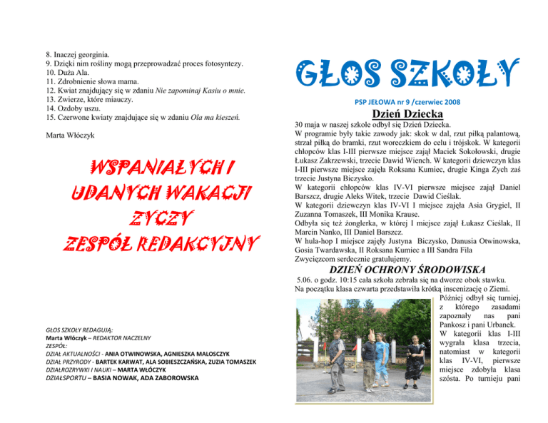 8. Inaczej georginia. 9. Dzięki nim rośliny mogą przeprowadzać proces fotosyntezy. 10. DuŜa Ala. 11. Zdrobnienie słowa mama. 12. Kwiat znajdujący się w zdaniu Nie zapominaj Kasiu o mnie. 13. Zwierze, które miauczy. 14. Ozdoby uszu. 15. Czerwone kwiaty znajdujące się w zdaniu Ola ma kieszeń. Marta Włóczyk WSPANIAŁYCH WSPANIAŁ YCH I UDANYCH WAKACJI ZYCZY ZESPÓŁ REDAKCYJNY GŁOS SZKOŁY PSP JEŁOWA nr 9 /czerwiec 2008 Dzień Dziecka 30 maja w naszej szkole odbył się Dzień Dziecka. W programie były takie zawody jak: skok w dal, rzut piłką palantową, strzał piłką do bramki, rzut woreczkiem do celu i trójskok. W kategorii chłopców klas I-III pierwsze miejsce zajął Maciek Sokołowski, drugie Łukasz Zakrzewski, trzecie Dawid Wiench. W kategorii dziewczyn klas I-III pierwsze miejsce zajęła Roksana Kumiec, drugie Kinga Zych zaś trzecie Justyna Biczysko. W kategorii chłopców klas IV-VI pierwsze miejsce zajął Daniel Barszcz, drugie Aleks Witek, trzecie Dawid Cieślak. W kategorii dziewczyn klas IV-VI I miejsce zajęła Asia Grygiel, II Zuzanna Tomaszek, III Monika Krause. Odbyła się teŜ Ŝonglerka, w której I miejsce zajął Łukasz Cieślak, II Marcin Nanko, III Daniel Barszcz. W hula-hop I miejsce zajęły Justyna Biczysko, Danusia Otwinowska, Gosia Twardawska, II Roksana Kumiec a III Sandra Fila Zwycięzcom serdecznie gratulujemy. DZIEŃ OCHRONY ŚRODOWISKA GŁOS SZKOŁY REDAGUJĄ: Marta Włóczyk – REDAKTOR NACZELNY ZESPÓŁ: DZIAŁ AKTUALNOŚCI - ANIA OTWINOWSKA, AGNIESZKA MALOSCZYK DZIAŁ PRZYRODY - BARTEK KARWAT, ALA SOBIESZCZAŃSKA, ZUZIA TOMASZEK DZIAŁROZRYWKI I NAUKI – MARTA WŁÓCZYK DZIAŁSPORTU – BASIA NOWAK, ADA ZABOROWSKA 5.06. o godz. 10:15 cała szkoła zebrała się na dworze obok stawku. Na początku klasa czwarta przedstawiła krótką inscenizację o Ziemi. Później odbył się turniej, z którego zasadami zapoznały nas pani Pankosz i pani Urbanek. W kategorii klas I-III wygrała klasa trzecia, natomiast w kategorii klas IV-VI, pierwsze miejsce zdobyła klasa szósta. Po turnieju pani Urbanek podała wyniki konkursu fotograficznego „Jełowa Majowa’’. Laureatom gratulujemy . A o godz. 12:00 odbył się „Dzień Szkoły Bez Przemocy’’ – wypuszczenie balonów w świat. Balony wyglądały przepięknie, chociaŜ niektóre odleciały wcześniej . Po powrocie z boiska była przerwa obiadowa i powrót na lekcje . Ale nie licząc lekcji, było super ☺☺☺☺ Basia Nowak i Daria Kumiec Rozrywka 1 2 3 4 FESTYN 2008 14.czerwca odbył się kolejny, wspaniały festyn rodzinny. W tym roku inaczej niŜ zawsze, poniewaŜ zorganizowano go w sobotę, (zazwyczaj był w niedzielę). Wszystkich zachwycały przeróŜne konkursy, wspaniałe stoiska no i … dobra zabawa!!! Na początku klasa V zaprezentowała inscenizację pt. ,,Europo, witaj nam”. Występowało w nim duŜo postaci z bajek, ale nie tylko. Zatańczyły dla nas teŜ dwie tancerki. UwaŜamy, Ŝe przedstawienie było naprawdę bardzo udane. Klasa V dziękuje pani Mróz za jego przygotowanie! Następnie wystąpiła grupa uczniów wybranych przez panią Tomaszek, która przekazała nam wraŜenia z Londynu. Przekonali waszyskich, Ŝe rzeczywiście w Londynie było wspaniale!!! Następnie uczniowie klas IV-VI zaprezentowali w skrócie, co robiliśmy podczas zajęć z ,,British 5 6 7 8 9 10 11 12 13 14 15 1. Majowy kwiat (trujący). 2. Wijąca się roślina o dzwonkowatych (często fioletowych) kwiatach. 3. Maj to ... . 4. Imię Ŝeńskie, kwiat z kolcami. 5. Jeden z rodziców. 6. Noszą ją Szkoci w święta, jest zieloną rośliną. 7. Obchodzi imieniny 15.05. Najlepsi uczniowie w tym roku szkolnym kl. I Sebastian Segiet Paulina Buchta Weronika Kartuz Karina Zaborowska Zuzanna Karwat Julia Wiench kl. II Julia Dorosz Łukasz Zakrzewski Izabela Błach Paulina Wiench Szymon Wosznik kl. III Patrycja Langner Justyna Biczysko Roksana Kumiec Małgorzata Twardowska Kinga Zych kl. IV Edyta Michalska-4,85 kl. V Zuzanna Tomaszek-5,73 Marta Włóczyk Wojciech Głuszek Karwat Bartek Alicja Sobieszczańska kl. VI Marek Solga—4,92 Daniel Zych-4,92 Paweł Zaba-4,82 Club’’. Opowiadali bardzo ciekawie, a my słuchaliśmy ich z otwartymi ustami. Były to opowieści między innymi o: ,,Dniu Naleśnika’’, ,,Dniu św. Patryka’’ oraz ,,Hallowen’’ . Wszystkie postacie były bardzo przekonujące! Jak co roku nie zabrakło sportu, były teŜ przepiękne medale. Wśród konkurencji był bieg przełajowy, rzut piłeczką palantową oraz mecze siatkówki i piłki noŜnej. Trzej uczniów oraz pani Cyrys zgłosili się do quizu o Londynie i jego historii. Nagrodą główną na tegorocznym festynie był piękny namiot, a zwycięzcą został Paweł śaba. Nasz zabawny pan Dreier zaŜartował, Ŝe Paweł nie musi juŜ mieszkać w domu, gdyŜ moŜe w swoim nowym namiocie. W tym roku puchar dyrektora szkoły otrzymała rodzina Kukurowskich. Gratulujemy! Tancerki, które pilnie uczyły się tańców w tym roku szkolnym, wreszcie zatańczyły na festynie. Oprócz tych wszystkich atrakcji wszyscy uczniowie bawili się naprawdę wspaniale i nie moŜemy doczekać się następnej takiej imprezy! Agnieszka Malosczyk i Anna Otwinowska Konkurs na gazetkę szkolną 29 maja nasza szkoła otrzymała dyplom za udział w konkursie na najlepszą gazetkę szkolną. Dyplom zaistniał równieŜ w gazecie NTO w Opolu. Do konkursu przystąpiły szkoły z całego województwa opolskiego. O wszystko zadbała pani Reguła, która opiekuje się kółkiem redakcyjnym (oczywiście byliśmy pewni, Ŝe go dostaniemy). Bardzo jesteśmy z niego dumni. Anna Otwinowska i Adrianna Zaborowska Zawody w Turawie Niedawno w sobotę odbyły się zawody w biegach przełajowych w Turawie. Uczniowie musieli pokonać dystans 600m. Z naszej szkoły pojechało 27 osób. Na podium stanęły dwie dziewczyny z naszej szkoły: Asia Grygiel z klasy VI i Dagmara Murzowska. Obie wysiliły się bardzo i naprawdę zasłuŜyły na brawa. Na a