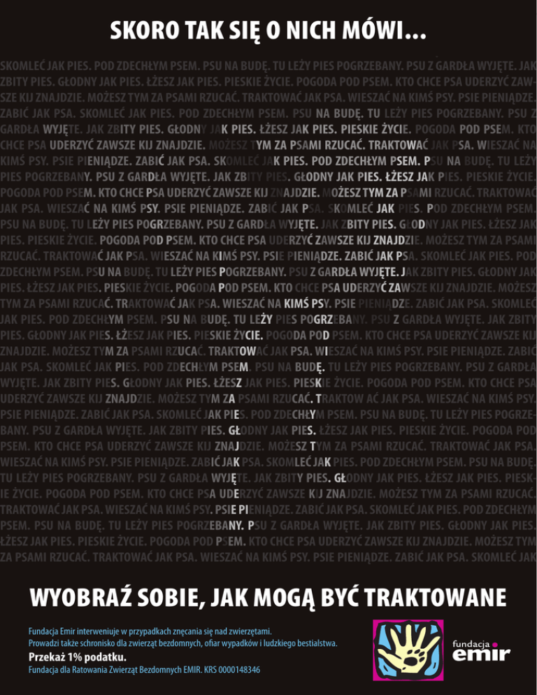 POD ZDECHŁYM PSEM. PSU NA BUDĘ. TU LEŻY PIES POGRZEBANY. PSU Z GARDŁA WYJĘTE. JAK ZBITY PIES. GŁODNY JAK PIES. ŁŻESZ JAK PIES. PIESKIE ŻYCIE. POGODA POD PSEM. KTO CHCE PSA UDERZYĆ ZAWSZE KIJ ZNAJDZIE. MOŻESZ TYM ZA PSAMI RZUCAĆ. TRAKTOWAĆ JAK PSA. WIESZAĆ NA KIMŚ PSY. PSIE PIENIĄDZE. ZABIĆ JAK PSA. SKOMLEĆ JAK PIES. POD ZDECHŁYM PSEM. PSU NA BUDĘ. TU LEŻY PIES POGRZEBANY. PSU Z GARDŁA WYJĘTE. JAK ZBITY PIES. GŁODNY JAK PIES. ŁŻESZ JAK PIES. PIESKIE ŻYCIE. POGODA POD PSEM. KTO CHCE PSA UDERZYĆ ZAWSZE KIJ ZNAJDZIE. MOŻESZ TYM ZA PSAMI RZUCAĆ. TRAKTOWAĆ JAK PSA. WIESZAĆ NA KIMŚ PSY. PSIE PIENIĄDZE. ZABIĆ JAK PSA. SKOMLEĆ JAK PIES. POD ZDECHŁYM PSEM. PSU NA BUDĘ. TU LEŻY PIES POGRZEBANY. PSU Z GARDŁA WYJĘTE. JAK ZBITY PIES. GŁODNY JAK PIES. ŁŻESZ JAK PIES. PIESKIE ŻYCIE. POGODA POD PSEM. KTO CHCE PSA UDERZYĆ ZAWSZE KIJ ZNAJDZIE. MOŻESZ TYM ZA PSAMI RZUCAĆ. TRAKTOWAĆ JAK PSA. WIESZAĆ NA KIMŚ PSY. PSIE PIENIĄDZE. ZABIĆ JAK PSA. SKOMLEĆ JAK PIES. POD ZDECHŁYM PSEM. PSU NA BUDĘ. TU LEŻY PIES POGRZEBANY. PSU Z GARDŁA WYJĘTE. JAK ZBITY PIES. GŁODNY JAK PIES. ŁŻESZ JAK PIES. PIESKIE ŻYCIE. POGODA POD PSEM. KTO CHCE PSA UDERZYĆ ZAWSZE KIJ ZNAJDZIE. MOŻESZ TYM ZA PSAMI RZUCAĆ. TRAKTOWAĆ JAK PSA. WIESZAĆ NA KIMŚ PSY. PSIE PIENIĄDZE. ZABIĆ JAK PSA. SKOMLEĆ JAK PIES. POD ZDECHŁYM PSEM. PSU NA BUDĘ. TU LEŻY PIES POGRZEBANY. PSU Z GARDŁA WYJĘTE. JAK ZBITY PIES. GŁODNY JAK PIES. ŁŻESZ JAK PIES. PIESKIE ŻYCIE. POGODA POD PSEM. KTO CHCE PSA UDERZYĆ ZAWSZE KIJ ZNAJDZIE. MOŻESZ TYM ZA PSAMI RZUCAĆ. TRAKTOWAĆ JAK PSA. WIESZAĆ NA KIMŚ PSY. PSIE PIENIĄDZE. ZABIĆ JAK PSA. SKOMLEĆ JAK PIES. POD ZDECHŁYM PSEM. PSU NA BUDĘ. TU LEŻY PIES POGRZEBANY. PSU Z GARDŁA WYJĘTE. JAK ZBITY PIES. GŁODNY JAK PIES. ŁŻESZ JAK PIES. PIESKIE ŻYCIE. POGODA POD PSEM. KTO CHCE PSA UDERZYĆ ZAWSZE KIJ ZNAJDZIE. MOŻESZ TYM ZA PSAMI RZUCAĆ. TRAKTOWAĆ JAK PSA. WIESZAĆ NA KIMŚ PSY. PSIE PIENIĄDZE. ZABIĆ JAK PSA. SKOMLEĆ JAK PIES. POD ZDECHŁYM PSEM. PSU NA BUDĘ. TU LEŻY PIES POGRZEBANY. PSU Z GARDŁA WYJĘTE. JAK ZBITY PIES. GŁODNY JAK PIES. ŁŻESZ JAK PIES. PIESKIE ŻYCIE. POGODA POD PSEM. KTO CHCE PSA UDERZYĆ ZAWSZE KIJ ZNAJDZIE. MOŻESZ TYM ZA PSAMI RZUCAĆ. TRAKTOWAĆ JAK PSA. WIESZAĆ NA KIMŚ PSY. PSIE PIENIĄDZE. ZABIĆ JAK PSA. SKOMLEĆ JAK PIES. POD ZDECHŁYM PSEM. PSU NA BUDĘ. TU LEŻY PIES POGRZEBANY. PSU Z GARDŁA WYJĘTE. JAK ZBITY PIES. GŁODNY JAK PIES. ŁŻESZ JAK PIES. PIESKIE ŻYCIE. POGODA POD PSEM. KTO CHCE PSA UDERZYĆ ZAWSZE KIJ ZNAJDZIE. MOŻESZ TYM ZA PSAMI RZUCAĆ. TRAKTOW AĆ JAK PSA. WIESZAĆ NA KIMŚ PSY. PSIE PIENIĄDZE. ZABIĆ JAK PSA. SKOMLEĆ JAK PIES. POD ZDECHŁYM PSEM. PSU NA BUDĘ. TU LEŻY PIES POGRZEBANY. PSU Z GARDŁA WYJĘTE. JAK ZBITY PIES. GŁODNY JAK PIES. ŁŻESZ JAK PIES. PIESKIE ŻYCIE. POGODA POD PSEM. KTO CHCE PSA UDERZYĆ ZAWSZE KIJ ZNAJDZIE. MOŻESZ TYM ZA PSAMI RZUCAĆ. TRAKTOWAĆ JAK PSA. WIESZAĆ NA KIMŚ PSY. PSIE PIENIĄDZE. ZABIĆ JAK PSA. SKOMLEĆ JAK PIES. POD ZDECHŁYM PSEM. PSU NA BUDĘ. TU LEŻY PIES POGRZEBANY. PSU Z GARDŁA WYJĘTE. JAK ZBITY PIES. GŁODNY JAK PIES. ŁŻESZ JAK PIES. PIESKIE ŻYCIE. POGODA POD PSEM. KTO CHCE PSA UDERZYĆ ZAWSZE KIJ ZNAJDZIE. MOŻESZ TYM ZA PSAMI RZUCAĆ. TRAKTOWAĆ JAK PSA. WIESZAĆ NA KIMŚ PSY. PSIE PIENIĄDZE. ZABIĆ JAK PSA. SKOMLEĆ JAK PIES. POD ZDECHŁYM PSEM. PSU NA BUDĘ. TU LEŻY PIES POGRZEBANY. PSU Z GARDŁA WYJĘTE. JAK ZBITY PIES. GŁODNY JAK PIES. ŁŻESZ JAK PIES. PIESKIE ŻYCIE. POGODA POD PSEM. KTO CHCE PSA UDERZYĆ ZAWSZE KIJ ZNAJDZIE. MOŻESZ TYM ZA PSAMI RZUCAĆ. TRAKTOWAĆ JAK PSA. WIESZAĆ NA KIMŚ PSY. PSIE PIENIĄDZE. ZABIĆ JAK PSA. SKOMLEĆ JAK PIES. POD ZDECHŁYM PSEM. PSU NA BUDĘ. TU LEŻY PIES POGRZEBANY. PSU Z GARDŁA WYJĘTE. JAK ZBITY PIES. GŁODNY JAK PIES. ŁŻESZ JAK PIES. PIESKIE ŻYCIE. POGODA POD PSEM. KTO CHCE PSA UDERZYĆ ZAWSZE KIJ ZNAJDZIE. MOŻESZ TYM ZA PSAMI RZUCAĆ. TRAKTOWAĆ JAK PSA. WIESZAĆ NA KIMŚ PSY. PSIE PIENIĄDZE. ZABIĆ JAK PSA. SKOMLEĆ JAK PIES. SKORO TAK SIĘ O NICH MÓWI... WYOBRAŹ SOBIE, JAK MOGĄ BYĆ TRAKTOWANE Fundacja Emir interweniuje w przypadkach znęcania się nad zwierzętami. Prowadzi także schronisko dla zwierząt bezdomnych, ofiar wypadków i ludzkiego bestialstwa. Przekaż 1% podatku. Fundacja dla Ratowania Zwierząt Bezdomnych EMIR. KRS 0000148346 POD ZDECHŁYM PSEM. PSU NA BUDĘ. TU LEŻY PIES POGRZEBANY. PSU Z GARDŁA WYJĘTE. JAK ZBITY PIES. GŁODNY JAK PIES. ŁŻESZ JAK PIES. PIESKIE ŻYCIE. POGODA POD PSEM. KTO CHCE PSA UDERZYĆ ZAWSZE KIJ ZNAJDZIE. MOŻESZ TYM ZA PSAMI RZUCAĆ. TRAKTOWAĆ JAK PSA. WIESZAĆ NA KIMŚ PSY. PSIE PIENIĄDZE. ZABIĆ JAK PSA. SKOMLEĆ JAK PIES. POD ZDECHŁYM PSEM. PSU NA BUDĘ. TU LEŻY PIES POGRZEBANY. PSU Z GARDŁA WYJĘTE. JAK ZBITY PIES. GŁODNY JAK PIES. ŁŻESZ JAK PIES. PIESKIE ŻYCIE. POGODA POD PSEM. KTO CHCE PSA UDERZYĆ ZAWSZE KIJ ZNAJDZIE. MOŻESZ TYM ZA PSAMI RZUCAĆ. TRAKTOWAĆ JAK PSA. WIESZAĆ NA KIMŚ PSY. PSIE PIENIĄDZE. ZABIĆ JAK PSA. SKOMLEĆ JAK PIES. POD ZDECHŁYM PSEM. PSU NA BUDĘ. TU LEŻY PIES POGRZEBANY. PSU Z GARDŁA WYJĘTE. JAK ZBITY PIES. GŁODNY JAK PIES. ŁŻESZ JAK PIES. PIESKIE ŻYCIE. POGODA POD PSEM. KTO CHCE PSA UDERZYĆ ZAWSZE KIJ ZNAJDZIE. MOŻESZ TYM ZA PSAMI RZUCAĆ. TRAKTOWAĆ JAK PSA. WIESZAĆ NA KIMŚ PSY. PSIE PIENIĄDZE. ZABIĆ JAK PSA. SKOMLEĆ JAK PIES. POD ZDECHŁYM PSEM. PSU NA BUDĘ. TU LEŻY PIES POGRZEBANY. PSU Z GARDŁA WYJĘTE. JAK ZBITY PIES. GŁODNY JAK PIES. ŁŻESZ JAK PIES. PIESKIE ŻYCIE. POGODA POD PSEM. KTO CHCE PSA UDERZYĆ ZAWSZE KIJ ZNAJDZIE. MOŻESZ TYM ZA PSAMI RZUCAĆ. TRAKTOWAĆ JAK PSA. WIESZAĆ NA KIMŚ PSY. PSIE PIENIĄDZE. ZABIĆ JAK PSA. SKOMLEĆ JAK PIES. POD ZDECHŁYM PSEM. PSU NA BUDĘ. TU LEŻY PIES POGRZEBANY. PSU Z GARDŁA WYJĘTE. JAK ZBITY PIES. GŁODNY JAK PIES. ŁŻESZ JAK PIES. PIESKIE ŻYCIE. POGODA POD PSEM. KTO CHCE PSA UDERZYĆ ZAWSZE KIJ ZNAJDZIE. MOŻESZ TYM ZA PSAMI RZUCAĆ. TRAKTOWAĆ JAK PSA. WIESZAĆ NA KIMŚ PSY. PSIE PIENIĄ