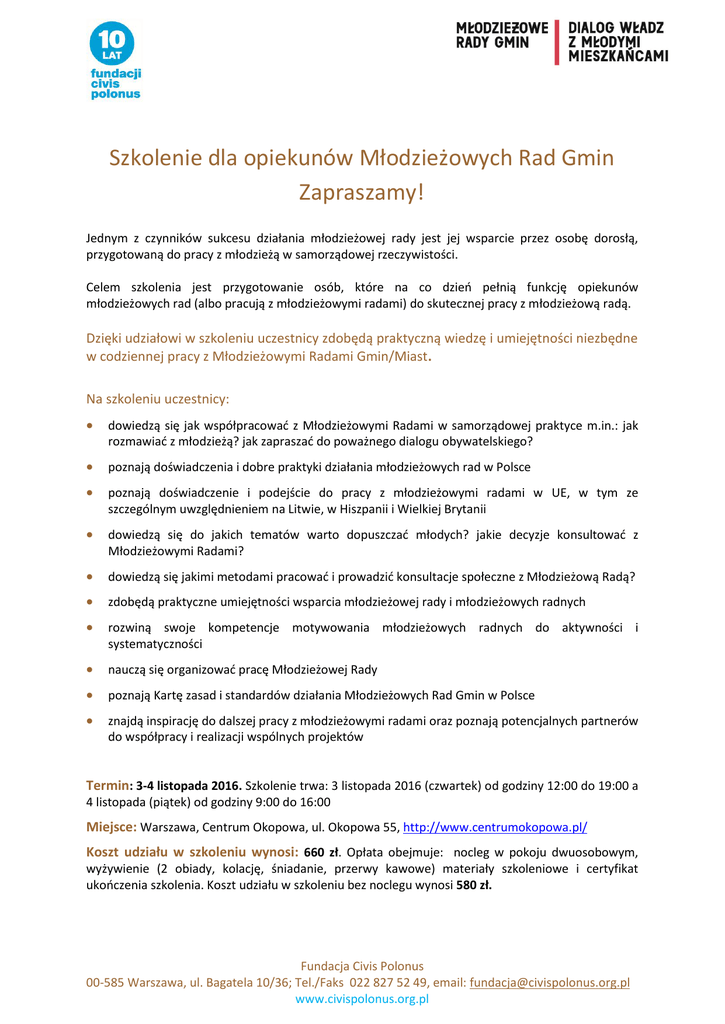 Szkolenie dla opiekunów Młodzieżowych Rad Gmin Zapraszamy! Jednym z czynników sukcesu działania młodzieżowej rady jest jej wsparcie przez osobę dorosłą, przygotowaną do pracy z młodzieżą w samorządowej rzeczywistości. Celem szkolenia jest przygotowanie osób, które na co dzień pełnią funkcję opiekunów młodzieżowych rad (albo pracują z młodzieżowymi radami) do skutecznej pracy z młodzieżową radą. Dzięki udziałowi w szkoleniu uczestnicy zdobędą praktyczną wiedzę i umiejętności niezbędne w codziennej pracy z Młodzieżowymi Radami Gmin/Miast. Na szkoleniu uczestnicy: dowiedzą się jak współpracować z Młodzieżowymi Radami w samorządowej praktyce m.in.: jak rozmawiać z młodzieżą? jak zapraszać do poważnego dialogu obywatelskiego? poznają doświadczenia i dobre praktyki działania młodzieżowych rad w Polsce poznają doświadczenie i podejście do pracy z młodzieżowymi radami w UE, w tym ze szczególnym uwzględnieniem na Litwie, w Hiszpanii i Wielkiej Brytanii dowiedzą się do jakich tematów warto dopuszczać młodych? jakie decyzje konsultować z Młodzieżowymi Radami? dowiedzą się jakimi metodami pracować i prowadzić konsultacje społeczne z Młodzieżową Radą? zdobędą praktyczne umiejętności wsparcia młodzieżowej rady i młodzieżowych radnych rozwiną swoje kompetencje motywowania młodzieżowych radnych do aktywności i systematyczności nauczą się organizować pracę Młodzieżowej Rady poznają Kartę zasad i standardów działania Młodzieżowych Rad Gmin w Polsce znajdą inspirację do dalszej pracy z młodzieżowymi radami oraz poznają potencjalnych partnerów do współpracy i realizacji wspólnych projektów Termin: 3-4 listopada 2016. Szkolenie trwa: 3 listopada 2016 (czwartek) od godziny 12:00 do 19:00 a 4 listopada (piątek) od godziny 9:00 do 16:00 Miejsce: Warszawa, Centrum Okopowa, ul. Okopowa 55, http://www.centrumokopowa.pl/ Koszt udziału w szkoleniu wynosi: 660 zł. Opłata obejmuje: nocleg w pokoju dwuosobowym, wyżywienie (2 obiady, kolację, śniadanie, przerwy kawowe) materiały szkoleniowe i certyfikat ukończenia szkolenia. Koszt udziału w szkoleniu bez noclegu wynosi 580 zł. Fundacja Civis Polonus 00-585 Warszawa, ul. Bagatela 10/36; Tel./Faks 022 827 52 49, email: [email protected] www.civispolonus.org.pl Zgłoszenia przyjmujemy do 14 października 2016 w postaci wypełnionego formularza zgłoszeniowego dostępnego tutaj: https://szkolenie-dla-opiekunow-czwartek-piatek.konfeo.com lub telefonicznie: 22 827 52 49 Dodatkowych informacji na temat szkolenia chętnie udzieli: Ewa Chróst mailowo: [email protected] lub telefonicznie: 22 827 52 49 Uczestnicy szkolenia otrzymają materiały szkoleniowe, przydatne w codziennej pracy z młodzieżowymi radnymi. Szkolenie poprowadzi: Joanna Pietrasik. Prezeska zarządu Fundacji Civis Polonus. Absolwentka Szkoły Praw Człowieka Fundacji Helsińskiej. Uczestniczka International Visitor Leadership Program dot. innowacji w pracy z młodzieżą (organizowanego przez Departament Stanu USA). Ekspertka Związku Powiatów Polskich ds. partnerstwa jednostek samorządu terytorialnego z podmiotami społecznymi i biznesowymi. W ciągu ostatnich 12 lat pracy z młodzieżą, w społ. lokalnych, z władzami i szkołami: zrealizowała 24 proj. podejmujące tematykę Młodzieżowych Rad Gmin i partycypacji młodzieży, inicjowała powołanie i animowała działanie 11 Młodzieżowych Rad Dzielnic Warszawy. Uczestniczyła w tworzeniu Młodzieżowej Rady Warszawy oraz systematycznie wspierała działalność 34 Młodzieżowych Rad Gmin w Polsce. Nasze doświadczenie: Fundacja Civis Polonus ma 12 letnie doświadczenie w pracy na rzecz Młodzieżowych Rad i aktywności obywatelskiej młodzieży. Wspieramy młodzieżowe rady gmin, miast i dzielnic na wiele sposobów. Zachęcamy do zapoznania się z pełniejszym opisem naszego doświadczenia oraz oferty szkoleń i doradztwa dostępnego na stronie Fundacji Civis Polonus: http://www.civispolonus.org.pl/files/EOG%20M%C5%82odzie%C5%BCowe%20Rady%20Gmin%20/of erta_szkole_i_doradztwa_mrg.pdf Nasze publikacje: Fundacja jest liderem w publikacjach poświęconych Młodzieżowym Radom. Dostępne są w wersji elektronicznej do pobrania na stronie internetowej Fundacji Civis Polonus: http://www.civispolonus.org.pl/index.php?option=com_content&view=article&id=431&Itemid=164 Fundacja Civis Polonus 00-585 Warszawa, ul. Bagatela 10/36; Tel./Faks 022 827 52 49, email: [email protected] www.civispolonus.org.pl