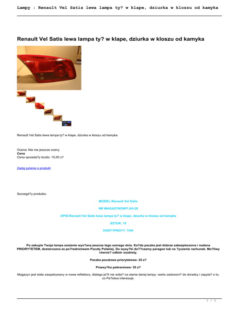 Lampy : Renault Vel Satis lewa lampa ty? w klape, dziurka w kloszu od kamyka Renault Vel Satis lewa lampa ty? w klape, dziurka w kloszu od kamyka Renault Vel Satis lewa lampa ty? w klape, dziurka w kloszu od kamyka Ocena: Nie ma jeszcze oceny Cena Cena sprzeda?y brutto: 15,00 z? Zadaj pytanie o produkt Szczegó?y produktu MODEL:Renault Vel Satis NR MAGAZYNOWY:A5-28 OPIS:Renault Vel Satis lewa lampa ty? w klape, dziurka w kloszu od kamyka SZTUK: 15 DOST?PNO??: TAK Po zakupie Twoja lampa zostanie wys?ana jeszcze tego samego dnia. Ka?da paczka jest dobrze zabezpieczona i nadana PRIORYTETEM, dostarczana za po?rednictwem Poczty Polskiej. Do wysy?ki do??czamy paragon lub na ?yczenie rachunek. Mo?liwy równie? odbiór osobisty. Paczka pocztowa priorytetowa- 25 z? Przesy?ka pobraniowa- 35 z? Magazyn jest stale zaopatrywany w nowe reflektory, dlatego je?li nie wida? na stanie danej lampy- warto zadzwoni? do doradcy i zapyta? o to, co Pa?stwa interesuje. 1 / 2 Lampy : Renault Vel Satis lewa lampa ty? w klape, dziurka w kloszu od kamyka 513-531-967 Jako konsumentowi przys?uguje Ci prawo do zwrotu towaru w ci?gu 10 dni. Nie musisz podawa? przyczyny. Gwarantujemy zwrot pieni?dzy. Jedynych koszty, których nie zwracamy to koszty wysy?ki. Wykonane zdj?cia nie podlegaj? ?adnej obróbce, co przek?ada si? na 100% pewno?ci, ?e zakupiony towar jest zgodny z towarem przedstawionym w ofercie. ZAPRASZAMY 2 / 2 Powered by TCPDF (www.tcpdf.org)