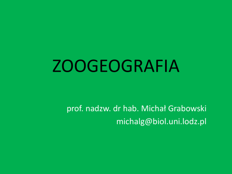 ZOOGEOGRAFIA prof. nadzw. dr hab. Michał Grabowski [email protected] Co to jest zoogeografia? Nauka zajmująca się geograficznym rozmieszczeniem gatunków zwierząt na kuli ziemskiej. Podejście tradycyjne = zoogeografia opisowa Badanie rozmieszczenia organizmów, obecnie i w przeszłości. Podejście współczesne = zoogeografia dynamiczna Badania wszystkich przejawów przestrzennej (geograficznej) zmienności w przyrodzie, od genów po ekosystemy. Składowe bioróżnorodności zmieniające się w gradientach geograficznych. Program badawczy współczesnej zoogeografii • Dlaczego różne regiony globu, mimo podobnych warunków, zamieszkują różne gatunki? • Jakie czynniki fizyczne i biologiczne ograniczają zasięgi gatunków? • Jak wydarzenia w historii Ziemi (ruch kontynentów, zlodowacenia) wpłynęły na rozmieszczenie organizmów? • Jak zmieniają się w gradiencie geograficznym właściwości funkcjonalne ekosystemów (np. naturalna produkcja pierwotna, dekompozycja, bioróżnorodność)? • Jak wyjaśnić wzorce rozmieszczenia zespołów organizmów na „wyspach”? • Jak wyjaśnić osobliwości (gigantyzm lub skarlenie) fauny wysp? • Jak zmieniają się właściwości organizmów (wielkość ciała, metabolizm i inne adaptacje) w gradiencie geograficznym? Pytanie podstawowe Z czego wynika zróżnicowanie różnorodności biotycznej na powierzchni Ziemi? Różne ujęcia problematyki badań • biogeografia chorologiczna • biogeografia ekologiczna • biogeografia historyczna • biogeografie szczegółowe Biogeografia chorologiczna Badanie morfologii i dynamiki zasięgów poszczególnych taksonów. Regionalizacje zoogeograficzne. Biogeografia ekologiczna = ekogeografia Wyjaśnianie aktualnego rozmieszczenia gatunków w oparciu o interakcje między organizmami i między nimi a środowiskiem. Poznanie zróżnicowania typologicznego układów biotycznych, ich przemian w czasie i przestrzeni oraz stopnia uzależnienia od czynników zewnętrznych. Przykładowe pytania • Co ogranicza obecny zasięg gatunku? • Jaką rolę odgrywają czynniki środowiska? • Dlaczego w tropikach jest więcej gatunków niż gdzie indziej? • Dlaczego liczba endemitów w niektórych rejonach jest wyższa niż w innych? • Skąd bierze się odrębność fauny i flory wysp? Biogeografia historyczna Geneza współczesnej fauny oraz zasięgów poszczególnych taksonów i układów ekologicznych. Pochodzenie, rozprzestrzenianie się i wymieranie taksonów; wielka skala czasowa i przestrzenna. Przykładowe pytania Kiedy i w jaki sposób doszło do obecnego rozmieszczenia taksonów? Jaki wpływ miały na to czynniki geologiczne i klimatyczne? Gdzie żyją najbliżsi krewni danego taksonu? Gdzie żyli jego/ich przodkowie? – Dlaczego blisko spokrewnione taksony występują blisko siebie albo w oddaleniu? – Skąd bierze się odrębność fauny wysp? Biogeografie szczegółowe Badanie wpływu poszczególnych czynników środowiskowych na właściwości organizmów, uwidaczniające się w ich zróżnicowaniu przestrzennym. Biogeografie szczegółowe • fizjologiczna • morfoanatomiczna • cytogenetyczna • rozwojowa • behawioralna • kulturowa Metodologia badań biogeograficznych • Ewolucyjne podejście do przedmiotu badań (rozmieszczenie taksonów, środowisko ich życia) • Wykorzystanie metod ilościowych (statystycznych) przy porównaniu fauny analizowanych obszarów. • Oparcie badań/analiz o grupy/taksony modelowe (najlepiej poznane). • Przyjęcie danych paleontologicznych jako równoważnych współczesnym. De Candolle i Wallace, I poł. XX wieku Metodologia badań biogeograficznych • ekologia – teoria równowagi w biogeografii wysp (McArthur & Wislon 1967) • taksonomia kladystyczna (Hennig 1966) • genetyka – filogenetyka molekularna, zegar molekularny • geologia i paleoklimatologia Filogeografia Badanie przyczyn, procesów i skutków geograficznego rozmieszczenia linii genealogicznych organizmów. Integracja programów i metod badawczych taksonomii, filogenetyki, genetyki populacji oraz fizjologii i ekologii. Avise 1987 Metody ilościowe • metody bezwzględne/absolutne – liczba osobników/taksonów na jednostkę powierzchni, udział taksonów w faunie danego obszaru • metody względne – wskaźniki służące do porównywania różnych obszarów, zależności i modele matematyczne Metody rekonstrukcyjne • ewolucja fauny w czasie i przestrzeni • integracja wiedzy z różnych dziedzin • zasada parsymonii w datowania zjawisk Metody regionalizacyjne • łączenie układów heterogenicznych (obszarów) we wspólne jednostki (regiony) na podstawie a priori założonych kryteriów i w określonym celu. • struktura hierarchiczna regionów • kryteria podziałów regionalizacyjnych Kryteria podziałów regionalizacyjnych • różnicowe • taksonów zastępczych • pokrewieństwa • geoekologiczne • historyczne • typologiczno przestrzenne Kryterium różnicowe • historycznie najstarsze • na podstawie zasięgu taksonów endemicznych • granice regionu wyznaczane są przez granice zasięgów endemitów Kryterium taksonów zastępczych • istnienie taksonów zastępujących się geograficznie – wikaryzujących (wikariantów) • granice zasięgów taksonów wikaryzujących są granicami regionów zoogeograficznych • im wyższej rangi są taksony tym wyższej rangi regiony (jednostki) zoogeograficzne Kryterium geoekologiczne • podstawą wyróżniania regionów jest zróżnicowanie środowiska abiotycznego (zwłaszcza klimatu) • podstawą regionalizacji są dominujące cechy autoekologiczne i synekologiczne (strategie rozrodu, typy konkurencji i symbiozy, ploidalność, ekokliny, itd. Kryterium historyczne • regionalizacja na podstawie czasu przybycia i trwałego zasiedlenia danego obszaru przez taksony • określenie centr rozwoju taksonu (diversity hot-spots, speciation hot-spots) • jedność historyczna układów występu