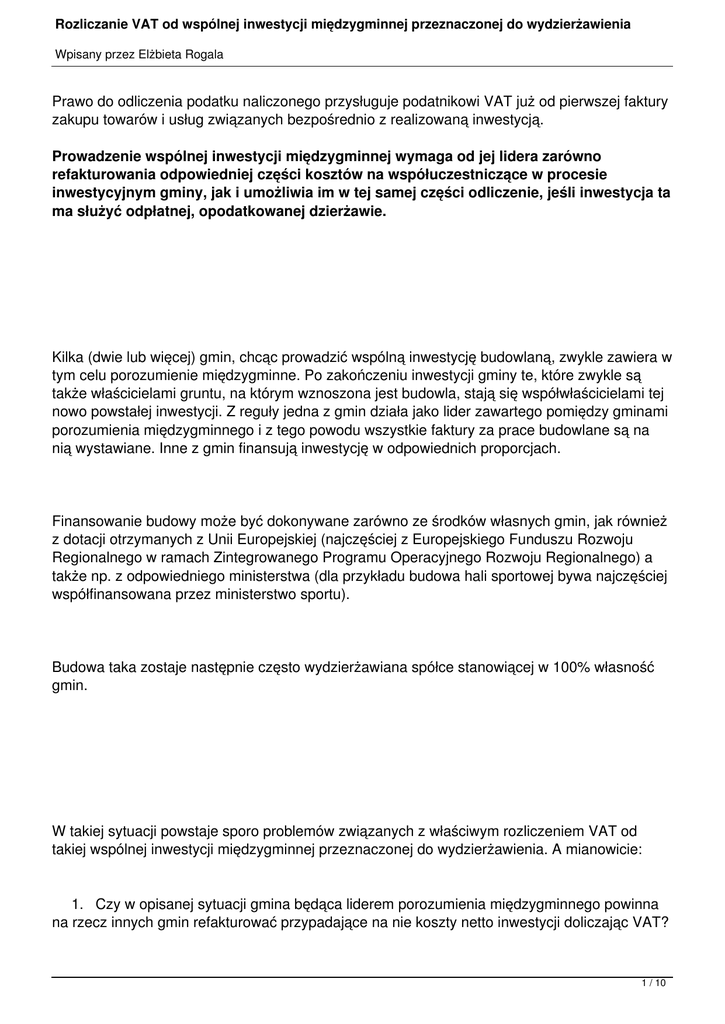 Rozliczanie VAT od wspólnej inwestycji międzygminnej przeznaczonej do wydzierżawienia Wpisany przez Elżbieta Rogala Prawo do odliczenia podatku naliczonego przysługuje podatnikowi VAT już od pierwszej faktury zakupu towarów i usług związanych bezpośrednio z realizowaną inwestycją. Prowadzenie wspólnej inwestycji międzygminnej wymaga od jej lidera zarówno refakturowania odpowiedniej części kosztów na współuczestniczące w procesie inwestycyjnym gminy, jak i umożliwia im w tej samej części odliczenie, jeśli inwestycja ta ma służyć odpłatnej, opodatkowanej dzierżawie. Kilka (dwie lub więcej) gmin, chcąc prowadzić wspólną inwestycję budowlaną, zwykle zawiera w tym celu porozumienie międzygminne. Po zakończeniu inwestycji gminy te, które zwykle są także właścicielami gruntu, na którym wznoszona jest budowla, stają się współwłaścicielami tej nowo powstałej inwestycji. Z reguły jedna z gmin działa jako lider zawartego pomiędzy gminami porozumienia międzygminnego i z tego powodu wszystkie faktury za prace budowlane są na nią wystawiane. Inne z gmin finansują inwestycję w odpowiednich proporcjach. Finansowanie budowy może być dokonywane zarówno ze środków własnych gmin, jak również z dotacji otrzymanych z Unii Europejskiej (najczęściej z Europejskiego Funduszu Rozwoju Regionalnego w ramach Zintegrowanego Programu Operacyjnego Rozwoju Regionalnego) a także np. z odpowiedniego ministerstwa (dla przykładu budowa hali sportowej bywa najczęściej współfinansowana przez ministerstwo sportu). Budowa taka zostaje następnie często wydzierżawiana spółce stanowiącej w 100% własność gmin. W takiej sytuacji powstaje sporo problemów związanych z właściwym rozliczeniem VAT od takiej wspólnej inwestycji międzygminnej przeznaczonej do wydzierżawienia. A mianowicie: 1. Czy w opisanej sytuacji gmina będąca liderem porozumienia międzygminnego powinna na rzecz innych gmin refakturować przypadające na nie koszty netto inwestycji doliczając VAT? 1 / 10 Rozliczanie VAT od wspólnej inwestycji międzygminnej przeznaczonej do wydzierżawienia Wpisany przez Elżbieta Rogala 2. Czy w sytuacji, gdy nie ma jeszcze podpisanej umowy o odpłatne świadczenie usług, tj. umowy dzierżawy tej inwestycji, gmina będąca liderem porozumienia międzygminnego może wcześniej odliczyć w całości podatek VAT z tytułu ponoszonych kosztów budowy za towary i usługi z każdej wystawionej na nią faktury? 3. Czy w sytuacji, gdy do końca budowy pozostało jeszcze kilka lub kilkanaście miesięcy (lub jeszcze dłuższy okres) jest możliwe i prawnie zasadne: wniesienie do urzędu skarbowego żądania o zwrot podatku VAT, ewentualnie o pomniejszenie podatku należnego z bieżącej sprzedaży gminy (zarówno tej będącej liderem porozumienia międzygminnego jak i pozostałych gmin) o podatek naliczony od inwestycji? 4. Czy gmina będąca liderem porozumienia międzygminnego oraz pozostałe gminy będą mogły ubiegać się o zwrot podatku VAT dopiero po wydzierżawieniu wybudowanej inwestycji? Najważniejszym warunkiem odliczeń od ponoszonych przez podatnika VAT jakichkolwiek nakładów inwestycyjnych jest to, by powstająca inwestycja została wykorzystana do wykonywania czynności opodatkowanych podatkiem VAT. W przedmiotowej sprawie chodzi o budowę inwestycji, która w przyszłości ma zostać przeznaczona do odpłatnego wydzierżawienia. Oznacza to, że powstająca inwestycja zostanie wykorzystana do wykonywania czynności opodatkowanych, gdyż odpłatna umowa dzierżawy inwestycji jest - co do zasady czynnością opodatkowaną stawką VAT, i to w wysokości podstawowej, tj. 22%. Wyjątek stanowią tylko dwa rodzaje dzierżawy, gdzie występuje zwolnienie od podatku VAT. Żaden jednak z tych przypadków nie dotyczy przedmiotowej sprawy. Wspomnieć tu tylko wypada, że zwolnienie od podatku VAT obejmuje jedynie dzierżawę gruntów na cele rolnicze oraz dzierżawę nieruchomości o charakterze mieszkalnym na cele mieszkalne. Należy zatem przyjąć, iż podatnikowi VAT - na podstawie art. 86 ust. 1 ustawy o VAT przysługuje prawo do odliczenia podatku naliczonego zawartego w fakturach zakupu towarów i usług związanych bezpośrednio z realizowaną inwestycją, wykorzystaną do wykonywania czynności opodatkowanych. W tym przypadku, skoro wybudowana budowla (budynek) przeznaczona zostanie do odpłatnego wydzierżawienia, oznacza to, iż zostanie wykorzystana do wykonywania czynności opodatkowanych, a w konsekwencji oznacza powstanie prawa do 2 / 10 Rozliczanie VAT od wspólnej inwestycji międzygminnej przeznaczonej do wydzierżawienia Wpisany przez Elżbieta Rogala odliczeń. Prawo do odliczenia podatku naliczonego przysługuje podatnikowi VAT już od pierwszej faktury zakupu towarów i usług związanych bezpośrednio z realizowaną inwestycją. Rozpoczęcie bowiem korzystania z prawa do odliczeń i zwrotów związanego bezpośrednio z tą inwestycją począwszy dopiero od daty zakończenia inwestycji i wykorzystania jej na cele działalności opodatkowanej (wydzierżawienia ze stawką 22%) wydaje się być zbyt ostrożne. Nie wymagają bowiem tego przepisy stanowiące o odliczaniu podatku naliczonego VAT w późniejszym terminie niż w dacie otrzymywania faktur lub w miesiącu następnym, tj. art. 86 ust. 12 ustawy o VAT. Przepis ten oddala (odsuwa) bowiem moment odliczenia na inny moment niż otrzymanie faktury tylko wówczas, gdyby otrzymanie faktury przypadało przed nabyciem prawa do rozporządzania towarem jak właściciel albo przed wykonaniem usługi. W takim przypadku prawo do obniżenia kwoty podatku należnego powstaje z chwilą nabycia prawa do rozporządzania towarem lub z chwilą wykonania usługi. Stąd to późniejsze odliczenie VAT następujące w niestandardowym terminie, tj. innym niż w miesiącach otrzymywania faktur (lub w miesiącach następnych). W tym miejscu należy także przytoczyć pismo z 24 maja 2007 rok