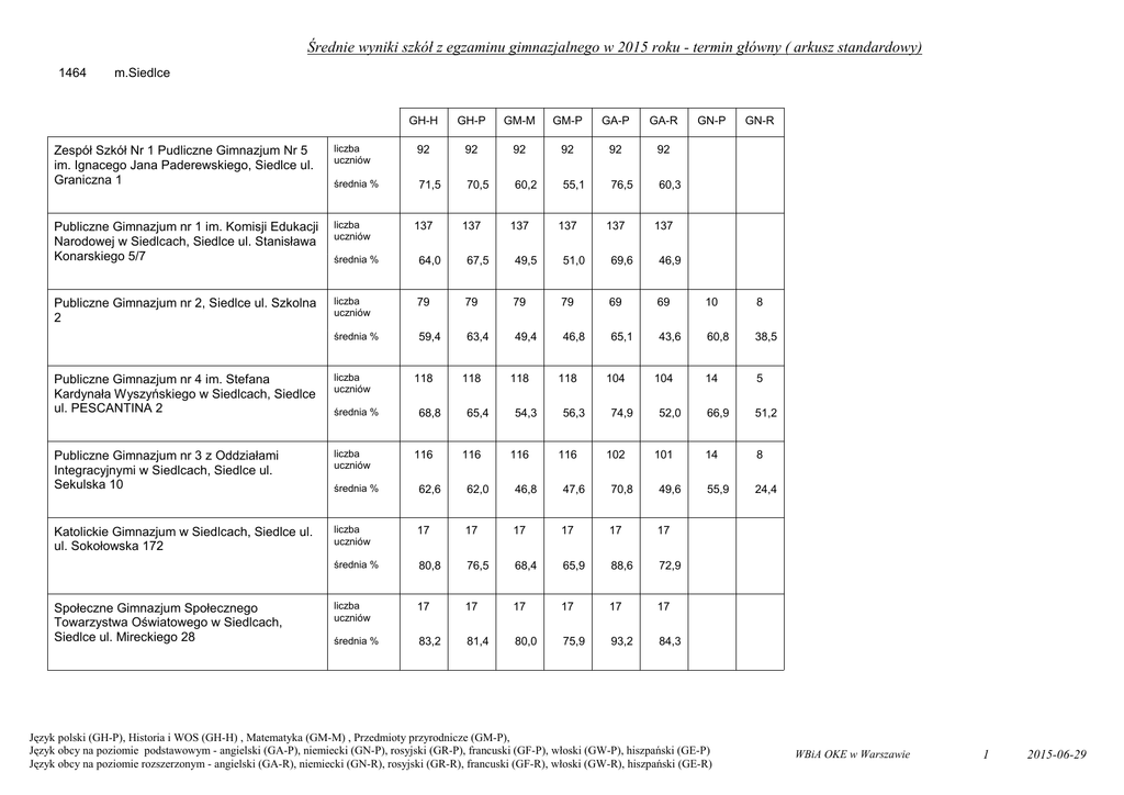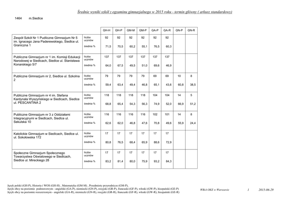 Średnie wyniki szkół z egzaminu gimnazjalnego w 2015 roku - termin główny ( arkusz standardowy) 1464 m.Siedlce GH-H GH-P GM-M GM-P GA-P GA-R GN-P GN-R 0 0 Zespół Szkół Nr 1 Pudliczne Gimnazjum Nr 5 im. Ignacego Jana Paderewskiego, Siedlce ul. Graniczna 1 liczba uczniów 92 92 92 92 92 92 średnia % 71,5 70,5 60,2 55,1 76,5 60,3 Publiczne Gimnazjum nr 1 im. Komisji Edukacji Narodowej w Siedlcach, Siedlce ul. Stanisława Konarskiego 5/7 liczba uczniów średnia % 64,0 67,5 49,5 51,0 69,6 46,9 Publiczne Gimnazjum nr 2, Siedlce ul. Szkolna 2 liczba uczniów 79 79 79 79 69 69 10 8 średnia % 59,4 63,4 49,4 46,8 65,1 43,6 60,8 38,5 14 5 66,9 51,2 14 8 137 137 137 137 137 137 0,0 0 0,0 0,0 0 0,0 Publiczne Gimnazjum nr 4 im. Stefana Kardynała Wyszyńskiego w Siedlcach, Siedlce ul. PESCANTINA 2 liczba uczniów Publiczne Gimnazjum nr 3 z Oddziałami Integracyjnymi w Siedlcach, Siedlce ul. Sekulska 10 liczba uczniów średnia % 62,6 62,0 46,8 47,6 70,8 49,6 55,9 24,4 Katolickie Gimnazjum w Siedlcach, Siedlce ul. ul. Sokołowska 172 liczba uczniów 17 17 17 17 17 17 0 0 średnia % 80,8 76,5 68,4 65,9 88,6 72,9 liczba uczniów 17 17 17 17 17 17 średnia % 83,2 81,4 80,0 75,9 93,2 84,3 Społeczne Gimnazjum Społecznego Towarzystwa Oświatowego w Siedlcach, Siedlce ul. Mireckiego 28 średnia % 118 68,8 116 118 65,4 116 118 54,3 116 118 56,3 116 104 74,9 102 104 52,0 101 0,0 0 Język polski (GH-P), Historia i WOS (GH-H) , Matematyka (GM-M) , Przedmioty przyrodnicze (GM-P), Język obcy na poziomie podstawowym - angielski (GA-P), niemiecki (GN-P), rosyjski (GR-P), francuski (GF-P), włoski (GW-P), hiszpański (GE-P) Język obcy na poziomie rozszerzonym - angielski (GA-R), niemiecki (GN-R), rosyjski (GR-R), francuski (GF-R), włoski (GW-R), hiszpański (GE-R) 0,0 0,0 0 0,0 WBiA OKE w Warszawie 1 2015-06-29 Średnie wyniki szkół z egzaminu gimnazjalnego w 2015 roku - termin główny ( arkusz standardowy) 1464 m.Siedlce GH-H GH-P GM-M GM-P GA-P GA-R GN-P GN-R 145 145 145 145 145 145 0 0 Publiczne Gimnazjum nr 6 im. księdza Stanisława Brzóski w Zespole Szkół nr 2 w Siedlcach, Siedlce ul. gen. Orlicz - Dreszera 3 liczba uczniów średnia % 68,2 69,4 59,0 52,3 78,0 55,6 Gimnazjum z Oddziałami Przysposabiającymi do Pracy, Siedlce ul. Szkolna 33 liczba uczniów 32 32 32 32 31 27 średnia % 36,7 25,4 16,8 28,7 29,6 11,4 liczba uczniów 5 6 6 6 6 2 średnia % 37,4 29,2 23,0 40,0 40,5 18,0 AP Edukacja Gimnazjum dla Dorosłych w Siedlcach, Siedlce ul. Szaloma Asza 2 0,0 0 0,0 0 Język polski (GH-P), Historia i WOS (GH-H) , Matematyka (GM-M) , Przedmioty przyrodnicze (GM-P), Język obcy na poziomie podstawowym - angielski (GA-P), niemiecki (GN-P), rosyjski (GR-P), francuski (GF-P), włoski (GW-P), hiszpański (GE-P) Język obcy na poziomie rozszerzonym - angielski (GA-R), niemiecki (GN-R), rosyjski (GR-R), francuski (GF-R), włoski (GW-R), hiszpański (GE-R) 0,0 0,0 0 0,0 0 0,0 WBiA OKE w Warszawie 2 2015-06-29
