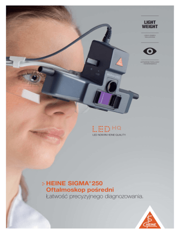 LIGHT WEIGHT LEKKA RAMKA OKULAROWA USTAWIENIE PARALAKSY I KONWERGENCJI HEINE SIGMA® 250 Oftalmoskop pośredni Łatwość precyzyjnego diagnozowania. Najwyższa precyzja badania przy maksymalnej wygodzie użytkowania – taki był nasz cel. Urządzenie SIGMA 250 z łatwością go spełnia, ponieważ waży zaledwie 110 g i jest wyposażone w precyzyjny układ optyczny HEINE w połączeniu z oświetleniem LEDHQ zapewniającym wyraźny, wysokiej rozdzielczości obraz, który pozwala odczytywać najbardziej szczegółowe informacje diagnostyczne. LAT RANCJI GWA OFTALMOSKOP POŚREDNI HEINE SIGMA® 250 NA RAMCE OKULAROWEJ, LEKKI, WIELE KORZYŚCI... Niewielkie rozmiary, wielkie możliwości: Kieszonkowy mPack LL zasilany akumulatorem litowo-jonowym zapewnia 23 godziny pracy z maksymalną jasnością. Akumulator można ładować transformatorem gniazdkowym lub transormatorem biurkowym/ściennym. Zintegrowany filtr bezczerwienny i dwie wielkości przesłony; opcjonalnie dostępne są filtry niebieski i żółty oraz dyfuzor. Ramka okularowa S-FRAME daje się bardzo łatwo dopasować do osobistych ustawień, co umożliwia długą pracę z urządzeniem bez zmęczenia. Opcjonalnie dostępna jest również wpinana („clip-in”) wkładka do szkieł korekcyjnych. LEKKA RAMKA OKULAROWA Wytrzymałe włókna węglowe zapewniają lekkość i dużą stabilność ramki. LED W JAKOŚCI HEINE Zaawansowana technologia oświetlenia diodowego LED zapewnia równomierne, jasne światło o naturalnym odwzorowaniu kolorów. OBRAZ STEREOSKOPOWY NIEZALEŻNIE OD WIELKOŚCI ŹRENICY Oddzielne ustawienia zbieżności i kąta paralaksy zapewniają pełne oświetlenie stereoskopowe badanych obiektów, również obszarów peryferyjnych. Do źrenic od 2 mm do 10 mm. SIGMA 250 z ramką S-FRAME SIGMA 250, ramka S-FRAME, mPack LL z transformatorem, Sznurek przytrzymujący, Płyn do czyszczenia C-008.33.341 SIGMA 250 M2 z ramką S-FRAME SIGMA 250, ramka S-FRAME, mPack LL z transformatorem, Sznurek przytrzymujący, Płyn do czyszczenia C-008.33.346 Zestaw SIGMA 250 z ramką S-FRAME SIGMA 250, ramka S-FRAME, mPack LL z transformatorem, Duży depresor, Mały depresor, Lupa oftalmoskopowa A.R. 20 D, Lusterko do podglądu, Kobaltowy niebieski i żółty filtr, Dyfuzor, Sznurek przytrzymujący, Płyn do czyszczenia, Twarde etui C-281.41.671 Zestaw SIGMA 250 M2 z ramką S-FRAME SIGMA 250, ramka S-FRAME, mPack LL z transformatorem, Duży depresor, Mały depresor, Lupa oftalmoskopowa A.R. 20 D, Lusterko do podglądu, Kobaltowy niebieski i żółty filtr, Dyfuzor, Sznurek przytrzymujący, Płyn do czyszczenia, Twarde etui C-279.41.671 HEINE Optotechnik GmbH & Co. KG, Kientalstr. 7, 82211 Herrsching, Germany Tel. +49 (0) 81 52 / 38 - 0, Fax +49 (0) 81 52 / 38 - 2 02, E-Mail: [email protected], www.heine.com Generalny Przedstawiciel w Polsce: PLUS ULTRA, ul. Na Szańcach 22, 61-663 Poznań Tel. +48 61 8203898, Fax. +48 61 8267666, E-mail: [email protected], www.plusultra.pl Zasttrzegamy prawo zmiany specyfikacji bez uprzedzenia. A-000.00.259 pl 10/14. LIGHT WEIGHT