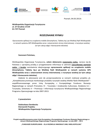 Strona |1 Poznań, 04.03.2013r. Wielkopolska Organizacja Turystyczna ul. 27 Grudnia 17/19 61-737 Poznań ROZEZNANIE RYNKU Opracowanie aplikacji na urządzenia mobile (Smartphone, Tablety itp.) po Wielkiej Pętli Wielkopolski w ramach systemu GPS Wielkopolska wraz z utworzeniem strony internetowej o turystyce wodnej (w tym zakup zdjęć i tłumaczenie tekstów) Szanowni Państwo, Wielkopolska Organizacja Turystyczna, celem dokonania rozeznania rynku, zwraca się do Państwa z uprzejmą prośbą o przygotowanie informacji w zakresie szacunkowej wartości netto i brutto zamówienia obejmującego opracowanie aplikacji na urządzenia mobile (Smartphone, Tablety itp.) po Wielkiej Pętli Wielkopolski w ramach systemu GPS Wielkopolska wraz z utworzeniem strony internetowej o turystyce wodnej (w tym zakup zdjęć i tłumaczenie tekstów). Zadanie to planowane jest do przeprowadzenia w ramach realizacji projektu pt. „Kompleksowa promocja markowego produktu turystyki wodnej Wielka Pętla Wielkopolski” współfinansowanego przez Unię Europejską z Europejskiego Funduszu Rozwoju Regionalnego w ramach Priorytetu VI - Turystyka i środowisko kulturowe, Działania 6.1 Turystyka, Schematu II – Promocja i informacja turystyczna Wielkopolskiego Regionalnego Programu Operacyjnego na lata 2007-2013. Z poważaniem Dobiesława Dembecka Kierownik Projektu Wielkopolska Organizacja Turystyczna Projekt współfinansowany przez Unię Europejską z Europejskiego Funduszu Rozwoju Regionalnego w ramach Wielkopolskiego Regionalnego Programu Operacyjnego na lata 2007 – 2013 „FUNDUSZE EUROPEJSKIE – DLA ROZWOJU INNOWACYJNEJ WIELKOPOLSKI” Strona |2 I. Szczegółowe informacje związane z realizacją zadania: Celem projektu pn. „Kompleksowa promocja markowego produktu turystyki wodnej Wielka Pętla Wielkopolski” jest profesjonalna, kompleksowa kampania promocyjna markowego produktu o nazwie Wielka Pętla Wielkopolski łączącego drogi wodne naszego regionu w wodny szlak turystyczny. Jego wyjątkowość polega na wykorzystaniu równoleżnikowego kierunku przepływu głównych rzek regionu – Warty i Noteci oraz południkowego położenia kanału Warta- Gopło. Poprzez dostęp od zachodu do Odry, jej dopływów i kanałów łączących ją z drogami wodnymi Brandenburgii, Wielka Pętla jest skomunikowana z zachodnią Europą, a poprzez Kanał Bydgoski z Wisłą i innymi rzekami Drogi Wodnej E-70 aż z Kaliningradem. Projekt Wielkopolskiej Organizacji Turystycznej promuje walory przyrodnicze szlaku oraz walory kulturowe położonych w pobliżu miast i miasteczek. Miejscem realizacji projektu jest teren Wielkopolski oraz wybrane miejsca na terenie kraju i na terenie wybranych krajów europejskich. Grupy docelowe na rynku krajowym stanowią mieszkańcy Wielkopolski, województw ościennych oraz dużych miast i aglomeracji Polski. Ponadto do grupy tej zaliczyć zalicza się osoby uprawiające turystykę motorowodną kajakową, właścicieli łodzi płaskodennych, barek itp. Promocja projektu oraz jego poszczególne etapy obejmować będą również rynek niemiecki (turyści z regionów Partnerstwa Odry tj. Berlin, Branderburgia, Meklemburgia – Przedpomorze i Saksonia), rynek niderlandzki oraz rynek francuski. Poniższe informacje mają na celu wybór wykonawcy, który opracuje i dostarczy aplikację na urządzenia mobile Wielkiej Pętli Wielkopolski w ramach systemu GPS Wielkopolska wraz z utworzeniem strony internetowej o turystyce wodnej (w tym zakup zdjęć i tłumaczenie tekstów) jako elementu promującego produkt Wielkiej Pętli Wielkopolski. Aplikacja wykorzystująca technologię nawigacji satelitarnej będzie przyjaznym dla użytkownika informatorem i przewodnikiem poprzez jasny, przejrzysty, prosty i intuicyjny interfejs, a także kompleksowość i precyzyjność zaimplementowanych informacji dotyczących tras oraz punktów zainteresowań (POI). Ze względu na brak powszechnej dostępności do szczegółowych map i przewodników Wielkiej Pętli Wielkopolski, będzie stanowić istotne źródło informacji dla turystyki wodnej. Aplikacja korzystać będzie z łącza internetowego, ale zostanie także wyposażona w tryb umożliwiający dostęp w trybie offline (korzystanie z danych uprzednio ściągniętych) w celu ograniczenia potencjalnych kosztów związanych z transmisją danych. Projekt współfinansowany przez Unię Europejską z Europejskiego Funduszu Rozwoju Regionalnego w ramach Wielkopolskiego Regionalnego Programu Operacyjnego na lata 2007 – 2013 „FUNDUSZE EUROPEJSKIE – DLA ROZWOJU INNOWACYJNEJ WIELKOPOLSKI” Strona |3 II. Przedmiot zamówienia 1. Opracowanie i dostawa dokumentacji projektowej 1.1. Plan projektu Dokument planu projektu zakłada utworzenie dokumentu składającego się z dwóch części. Pierwsza z części dotyczy szczegółowych informacji na temat terminów, w których Zamawiający będzie odbierać od Wykonawcy poszczególne etapy prac nad projektem. Druga część planu projektu będzie opisem przepływu komunikacji pomiędzy Zamawiającym a Wykonawcą. Kryteriami odbioru dokumentu Plan Projektu są: a. Szczegółowy harmonogram prac b. Przepływ komunikacji 1.2. Analiza Przedwdrożeniowa W ramach rozpoczęcia pracy nad projektem konieczne jest wykonanie dokładnej analizy przedwdrożeniowej przez Wykonawcę u Zamawiającego. Istotnym warunkiem wykonania dobrej analizy jest praca na miejscu u Zamawiającego. Produktem analizy przedwdrożeniowej będzie dokument analizy przedwdrożeniowej wykonany przez Wykonawcę. Dokument będzie służył doprecyzowaniu wymogów Zamawiającego względem projektu. W ramach analizy zostanie wymieniony każdy element projektu i należycie opisany - za należycie opisany element rozumie się opis lokalizacji elementu, sposobu jego działania. W dokumencie zostaną doprecyzowane wszystkie pytania i uwagi Wykonawcy jakie dotyczą projektu 1.3. Opis testów akceptacyjnych Wykonawca opracuje w porozumieniu z Zamawiającym testy akcepta