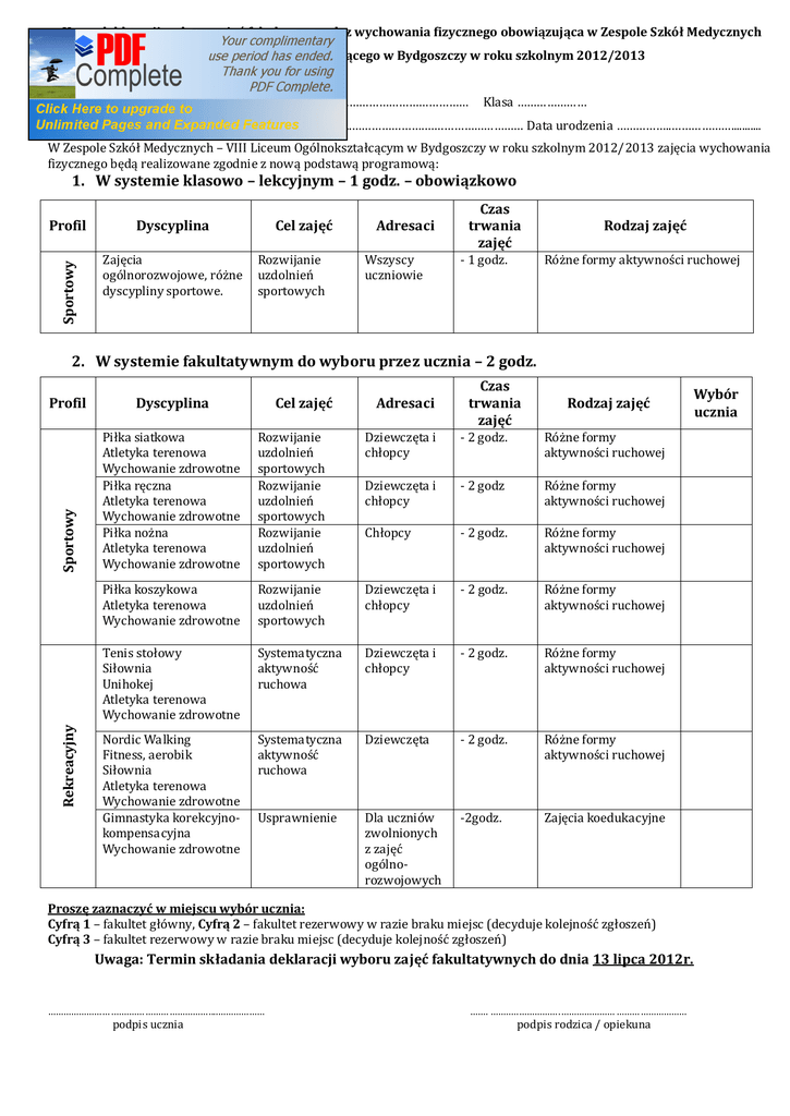 Karta deklaracji wyboru zajęć fakultatywnych z wychowania fizycznego obowiązująca w Zespole Szkół Medycznych – VIII Liceum Ogólnokształcącego w Bydgoszczy w roku szkolnym 2012/2013 Nazwisko ……………..………………….……..……… Imię …………………………………… Klasa ………………… Zamieszkały …………………………………..………………………..………………….………………………… Data urodzenia ……………..………………........... W Zespole Szkół Medycznych – VIII Liceum Ogólnokształcącym w Bydgoszczy w roku szkolnym 2012/2013 zajęcia wychowania fizycznego będą realizowane zgodnie z nową podstawą programową: 1. W systemie klasowo – lekcyjnym – 1 godz. – obowiązkowo Sportowy Profil Dyscyplina Zajęcia ogólnorozwojowe, różne dyscypliny sportowe. Cel zajęć Rozwijanie uzdolnień sportowych Adresaci Wszyscy uczniowie Czas trwania zajęć - 1 godz. Rodzaj zajęć Różne formy aktywności ruchowej 2. W systemie fakultatywnym do wyboru przez ucznia – 2 godz. Dyscyplina Rozwijanie uzdolnień sportowych Rozwijanie uzdolnień sportowych Rozwijanie uzdolnień sportowych Dziewczęta i chłopcy - 2 godz. Różne formy aktywności ruchowej Dziewczęta i chłopcy - 2 godz Różne formy aktywności ruchowej Sportowy Piłka siatkowa Atletyka terenowa Wychowanie zdrowotne Piłka ręczna Atletyka terenowa Wychowanie zdrowotne Piłka nożna Atletyka terenowa Wychowanie zdrowotne Chłopcy - 2 godz. Różne formy aktywności ruchowej Piłka koszykowa Atletyka terenowa Wychowanie zdrowotne Rozwijanie uzdolnień sportowych Dziewczęta i chłopcy - 2 godz. Różne formy aktywności ruchowej Tenis stołowy Siłownia Unihokej Atletyka terenowa Wychowanie zdrowotne Systematyczna aktywność ruchowa Dziewczęta i chłopcy - 2 godz. Różne formy aktywności ruchowej Nordic Walking Fitness, aerobik Siłownia Atletyka terenowa Wychowanie zdrowotne Gimnastyka korekcyjnokompensacyjna Wychowanie zdrowotne Systematyczna aktywność ruchowa Dziewczęta - 2 godz. Różne formy aktywności ruchowej Usprawnienie Dla uczniów zwolnionych z zajęć ogólnorozwojowych -2godz. Zajęcia koedukacyjne Rekreacyjny Cel zajęć Adresaci Czas trwania zajęć Profil Rodzaj zajęć Proszę zaznaczyć w miejscu wybór ucznia: Cyfrą 1 – fakultet główny, Cyfrą 2 – fakultet rezerwowy w razie braku miejsc (decyduje kolejność zgłoszeń) Cyfrą 3 – fakultet rezerwowy w razie braku miejsc (decyduje kolejność zgłoszeń) Uwaga: Termin składania deklaracji wyboru zajęć fakultatywnych do dnia 13 lipca 2012r. …………………… .……………………………… ....……………… podpis ucznia ……. ……..……………… .………………… ……………………… podpis rodzica / opiekuna Wybór ucznia