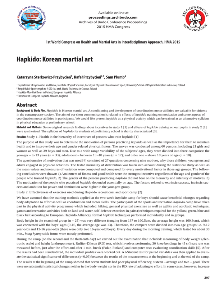 Available online at proceedings.archbudo.com Archives of Budo Conference Proceedings 2015 HMA Congress 1st World Congress on Health and Martial Arts in Interdisciplinary Approach, HMA 2015 Hapkido: Korean martial art Katarzyna Sterkowicz-Przybycień1, Rafał Przybycień2,3, Sam Plumb4 Department of Gymnastics and Dance, Institute of Sport Sciences, Faculty of Physical Education and Sport, University School of Physical Education in Cracow, Poland Zespół Szkół Społecznych nr 7 STO ks. prof. Józefa Tischnera in Cracow, Poland 3 Hapkido Moo Hak Kwan in Poland, European Hapkido Alliance 4 President of European Hapkido Alliance, England 1 2 Abstract Background & Study Aim. Hapkido is Korean martial art. A conditioning and development of coordination motor abilities are valuable for citizens in the contemporary society. The aim of our short communication is related to effects of hapkido training on motivation and some aspects of coordination motor abilities in participants. We would like present hapkido as a physical activity which can be trained as an alternative syllabus in physical education at preliminary school. Material and Methods: Some original research findings about incentives in study 1 [1] and effects of hapkido training on our pupils in study 2 [2] were synthesized. The syllabus of hapkido for students of preliminary school is shortly characterized [3]. Results: Study 1. Health in the hierarchy of incentives of persons who train hapkido [1] The purpose of this study was to determine the motivation of persons practicing hapkido as well as the importance for them to maintain health and to improve their age and gender related physical fitness. The survey was conducted among 60 persons, including 21 girls and women as well as 39 boys and men. Due to a wide range variability of the subjects’ ages, they were divided into three categories: the younger – to 13 years (n = 33); adolescent – between 13 -18 years (n = 17); and older one – above 18 years of age (n = 10). The questionnaire of motivation that was used [4] consisted of 27 questions concerning nine motives, why those children, youngsters and adults engaged in physical activities. The tested normality of distribution was taken into account during the statistical study as well as the mean values and measures of variation were computed and compared for every motivational factor in those age groups. The following conclusions were drawn: 1) Attainment of fitness and good health were the strongest incentive regardless of the age and gender of the people who trained hapkido, 2) The gender of the persons practicing hapkido did not bear on the hierarchy and intensity of motives, 3) The motivation of the people who practiced hapkido depended essentially on age. The factors related to extrinsic success, intrinsic success and ambition for power and domination were higher in the youngest group. Study 2. Effectiveness of exercises used during Hapkido recreational and sport camp [2] We have assumed that the training methods applied at the two-week hapkido camp for boys should cause beneficial changes regarding body adaptation to effort as well as coordination and motor skills. The participants of the sports and recreation hapkido camp have taken part in the physical activity programme which included: hiking, general physical exercises as well as agility and acrobatic techniques, games and recreation activities both on land and water, self-defence exercises in pairs (techniques required for the yellow, green, blue and black belt according to European Hapkido Alliance), formal hapkido techniques performed individually and in groups. Body height in the examined group (n = 25) was very different (ranging from 137 to 190.5cm, the average height was 160.3cm), which was connected with the boys’ ages (9-16, the average age was 13). Therefore, the campers were divided into two age groups i.e. 9-12 year-olds and 13-16 year-olds (there were only two 16-year-old boys). Every day during the morning training, which lasted for about 30 min., bong hyung stick forms were mostly performed. During the camp (on the second and the thirteenth day) we carried out the examination that included: measuring of body weight (electronic scale) and height (anthropometer), Ruffier-Dikson (RD) test, which involves performing 30 knee bendings in 45 s (heart rate was measured before, just after the effort and after 1 min. break (Polar, Finland) and computer tests evaluating coordination skills [5]. After the results had been standardized, the individual profiles were worked out. A t-Student test for paired variables was then applied to evaluate the statistical significance of differences (p<0.05) between the results of the measurements at the beginning and at the end of the camp. The results at the beginning of the camp showed that seven students had poor physical efficiency, sixteen – average and two – good. There were no substantial statistical changes neither in the body weight nor in the RD rate of adopting to effort. In some cases, however, increase 207 Archives of Budo Conference Proceedings, 2015 HMA Congress Abstract and in some cases decrease in body weight and the above mentioned RD rate was noticed. These results are likely to be connected with the different levels of commitment to trainings at the camp. Comparison of the average results of the computer tests evaluating different aspects of coordination, which were carried out at the beginning and at the end of the camp, showed that there were significant betterment in orientation in space as well as in the ability to divide attention. The performed exercises had actually the biggest influence on the increase of the students’ ability to divide attention (t = –10.985; p<0.001). However, we have not noticed any significant changes in simple reaction time, complex reaction time or sense of direction (p<0.05).The hypothesis about the increase of body adaptation to endurance effort has not been comple