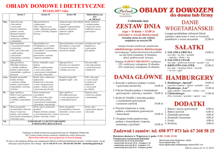 OBIADY DOMOWE I DIETETYCZNE 09-14.01.2017 roku Zestaw I Pon. Wt. Śr. Czw. Azjatycka zupa z kurczakiem i warzywami Pieczeń z karkówki podana z sosem, kluskami śląskimi i kapustą modrą zasmaŜaną z jabłkiem i rodzynkami Zupa hetmańska z soczystym kurczakiem i warzywami Filet z piersi kurczaka w jajku podany z pieczonymi ziemniakami i surówką z marchewki Zupa grochowa Wątróbka drobiowa z cebulką i jabłkiem podana z gotowanymi ziemniakami i ogórkiem kiszonym Krupnik staropolski Kotlety mielone z rumianą cebulką podane z gotowanymi ziemniakami i surówką Colesław Zupa ogórkowa Śledź w sosie jogurtowym podany z jabłkiem i cebulką z ziemniakami puree Pt. Sb. Nd. Zestaw II Zupa pomidorowa z makaronem Filet z tilapii na sosie słodko - pikantnym podany z ryŜem i surówką z kapusty kiszonej Zestaw III Obiad dietetyczny FIT ok. 500 kcal* Azjatycka zupa z kurczakiem Kotlet schabowy z ziołami podany i warzywami z brązowym ryŜem Sajgonki wegetariańskie i bukietem warzyw podane na kruchych sałatach z dipem gotowanych jogurtowym Zupa kalafiorowa Przekładaniec ze schabu zapiekany z pomidorem, pieczarkami i serem podany z ziemniakami gotowanymi i surówką z kapusty pekińskiej Zupa hetmańska z soczystym kurczakiem i warzywami Pierogi po lwowsku okraszone cebulką Aromatyczna zupa kalafiorowa z gotowanym kurczakiem Krem z brukselki z nutą bekonu Bitki ze schabu podane w sosie cztery pieprze z gotowanymi ziemniakami i surówką z buraczków Rosół z kury z domowym makaronem Polędwiczki z kurczaka w sosie winogronowym podane z białym ryŜem i gotowaną marchewką Zupa grochowa Pieczony ser camembert z sosem Ŝurawinowym i sałatką owocową Pieczone udko z kurczaka podane z ryŜem brązowym i kalafiorem Krupnik staropolski Spaghetti Aglio - olio Filet z kurczaka w sosie teryaki na brązowym makaronie z warzywami po chińsku Krem ziemniaczany Zupa ogórkowa z grzankami Dwa jajka gotowane w sosie musztardowym Filet z piersi kurczaka po hawajsku podany z ziemniakami puree z gotowanymi ziemniakami i groszkiem z marchewką śurek staropolski Krem z dyni z praŜonymi śurek staropolski na naturalnym zakwasie pestkami na naturalnym zakwasie Sznycel wieprzowy Pulpety drobiowe podane Naleśniki z serem i sosem w sosie koperkowym z ryŜem owocowym podany z pieczarkami, gotowanymi ziemniakami białym i surówką z selera i surówką z pora ZAPRASZAMY NA BUFETY OBIADOWE W HOTELOWEJ RESTAURACJI SmaŜony dorsz z kolorową sałatką z ziemniakami Krem z dyni z gotowanym mięsem z kurczaka *Jadłospis na obiady dietetyczne przygotowała mgr inŜ. Magdalena Walkowiak Od 23 marca moŜna równieŜ zamawiać całodzienny zestaw dietetyczny. Sprawdzaj codziennie nasze propozycje na naszym fanpage. W trosce o jak najlepszą obsługę oraz zaspokojenie Państwa oczekiwań kulinarnych prosimy o rzetelne opinie i uwagi dotyczące naszych potraw oraz obsługi – tel. 61 426 46 91 wew. 105 lub 602 366 001 / [email protected]