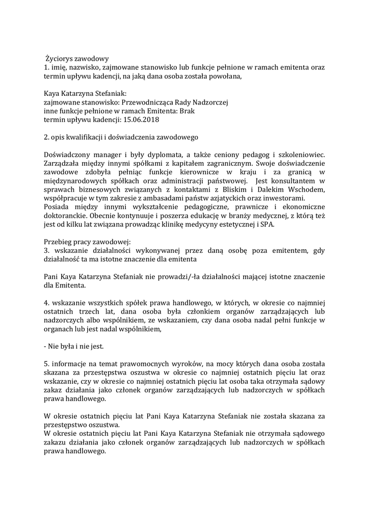Życiorys zawodowy 1. imię, nazwisko, zajmowane stanowisko lub funkcje pełnione w ramach emitenta oraz termin upływu kadencji, na jaką dana osoba została powołana, Kaya Katarzyna Stefaniak: zajmowane stanowisko: Przewodnicząca Rady Nadzorczej inne funkcje pełnione w ramach Emitenta: Brak termin upływu kadencji: 15.06.2018 2. opis kwalifikacji i doświadczenia zawodowego Doświadczony manager i były dyplomata, a także ceniony pedagog i szkoleniowiec. Zarządzała między innymi spółkami z kapitałem zagranicznym. Swoje doświadczenie zawodowe zdobyła pełniąc funkcje kierownicze w kraju i za granicą w międzynarodowych spółkach oraz administracji państwowej. Jest konsultantem w sprawach biznesowych związanych z kontaktami z Bliskim i Dalekim Wschodem, współpracuje w tym zakresie z ambasadami państw azjatyckich oraz inwestorami. Posiada między innymi wykształcenie pedagogiczne, prawnicze i ekonomiczne doktoranckie. Obecnie kontynuuje i poszerza edukację w branży medycznej, z którą też jest od kilku lat związana prowadząc klinikę medycyny estetycznej i SPA. Przebieg pracy zawodowej: 3. wskazanie działalności wykonywanej przez daną osobę poza emitentem, gdy działalność ta ma istotne znaczenie dla emitenta Pani Kaya Katarzyna Stefaniak nie prowadzi/-ła działalności mającej istotne znaczenie dla Emitenta. 4. wskazanie wszystkich spółek prawa handlowego, w których, w okresie co najmniej ostatnich trzech lat, dana osoba była członkiem organów zarządzających lub nadzorczych albo wspólnikiem, ze wskazaniem, czy dana osoba nadal pełni funkcje w organach lub jest nadal wspólnikiem, - Nie była i nie jest. 5. informacje na temat prawomocnych wyroków, na mocy których dana osoba została skazana za przestępstwa oszustwa w okresie co najmniej ostatnich pięciu lat oraz wskazanie, czy w okresie co najmniej ostatnich pięciu lat osoba taka otrzymała sądowy zakaz działania jako członek organów zarządzających lub nadzorczych w spółkach prawa handlowego. W okresie ostatnich pięciu lat Pani Kaya Katarzyna Stefaniak nie została skazana za przestępstwo oszustwa. W okresie ostatnich pięciu lat Pani Kaya Katarzyna Stefaniak nie otrzymała sądowego zakazu działania jako członek organów zarządzających lub nadzorczych w spółkach prawa handlowego. 6. szczegóły wszystkich przypadków upadłości, zarządu komisarycznego lub likwidacji, w okresie co najmniej ostatnich pięciu lat, w odniesieniu do podmiotów, w których dana osoba pełniła funkcje członka organu zarządzającego lub nadzorczego W okresie ostatnich pięciu lat nie miała miejsce upadłość, zarząd komisaryczny lub likwidacja podmiotu, w którym Pani Kaya Katarzyna Stefaniak pełniła funkcje członka organu zarządzającego lub nadzorczego. 7. informacje, czy dana osoba prowadzi działalność, która jest konkurencyjna w stosunku do działalności emitenta, oraz czy jest wspólnikiem konkurencyjnej spółki cywilnej lub osobowej albo członkiem organu spółki kapitałowej lub członkiem organu jakiejkolwiek konkurencyjnej osoby prawnej, Pani Kaya Katarzyna Stefaniak nie prowadzi konkurencyjnej działalności w stosunku do działalności Emitenta, ani nie jest wspólnikiem konkurencyjnej spółki cywilnej lub osobowej albo członkiem organu spółki kapitałowej lub członkiem organu jakiejkolwiek konkurencyjnej osoby prawnej. 8. informacje, czy dana osoba figuruje w rejestrze dłużników niewypłacalnych, prowadzonym na podstawie ustawy z dnia 20 sierpnia 1997 r. o Krajowym Rejestrze Sądowym; Pani Kaya Katarzyna Stefaniak nie figuruje w rejestrze dłużników niewypłacalnych prowadzonym na podstawie ustawy z dnia 20 sierpnia 1997 r. o Krajowym Rejestrze Sądowym.