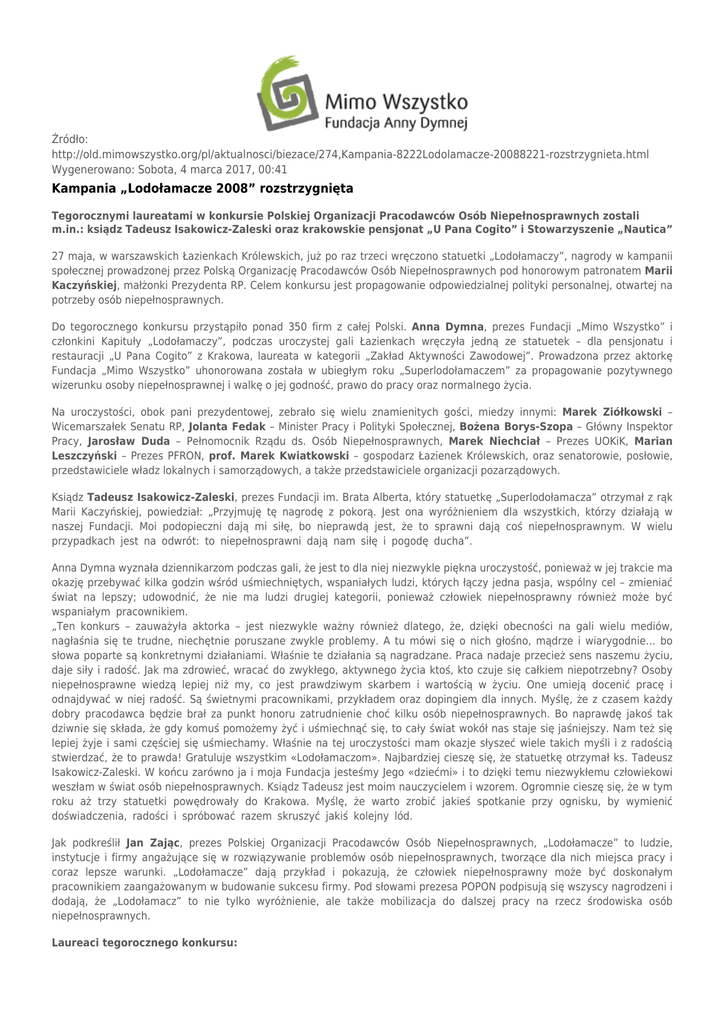 Źródło: http://old.mimowszystko.org/pl/aktualnosci/biezace/274,Kampania-8222Lodolamacze-20088221-rozstrzygnieta.html Wygenerowano: Sobota, 4 marca 2017, 00:41 Kampania „Lodołamacze 2008” rozstrzygnięta Tegorocznymi laureatami w konkursie Polskiej Organizacji Pracodawców Osób Niepełnosprawnych zostali m.in.: ksiądz Tadeusz Isakowicz-Zaleski oraz krakowskie pensjonat „U Pana Cogito” i Stowarzyszenie „Nautica” 27 maja, w warszawskich Łazienkach Królewskich, już po raz trzeci wręczono statuetki „Lodołamaczy”, nagrody w kampanii społecznej prowadzonej przez Polską Organizację Pracodawców Osób Niepełnosprawnych pod honorowym patronatem Marii Kaczyńskiej, małżonki Prezydenta RP. Celem konkursu jest propagowanie odpowiedzialnej polityki personalnej, otwartej na potrzeby osób niepełnosprawnych. Do tegorocznego konkursu przystąpiło ponad 350 firm z całej Polski. Anna Dymna, prezes Fundacji „Mimo Wszystko” i członkini Kapituły „Lodołamaczy”, podczas uroczystej gali Łazienkach wręczyła jedną ze statuetek – dla pensjonatu i restauracji „U Pana Cogito” z Krakowa, laureata w kategorii „Zakład Aktywności Zawodowej”. Prowadzona przez aktorkę Fundacja „Mimo Wszystko” uhonorowana została w ubiegłym roku „Superlodołamaczem” za propagowanie pozytywnego wizerunku osoby niepełnosprawnej i walkę o jej godność, prawo do pracy oraz normalnego życia. Na uroczystości, obok pani prezydentowej, zebrało się wielu znamienitych gości, miedzy innymi: Marek Ziółkowski – Wicemarszałek Senatu RP, Jolanta Fedak – Minister Pracy i Polityki Społecznej, Bożena Borys-Szopa – Główny Inspektor Pracy, Jarosław Duda – Pełnomocnik Rządu ds. Osób Niepełnosprawnych, Marek Niechciał – Prezes UOKiK, Marian Leszczyński – Prezes PFRON, prof. Marek Kwiatkowski – gospodarz Łazienek Królewskich, oraz senatorowie, posłowie, przedstawiciele władz lokalnych i samorządowych, a także przedstawiciele organizacji pozarządowych. Ksiądz Tadeusz Isakowicz-Zaleski, prezes Fundacji im. Brata Alberta, który statuetkę „Superlodołamacza” otrzymał z rąk Marii Kaczyńskiej, powiedział: „Przyjmuję tę nagrodę z pokorą. Jest ona wyróżnieniem dla wszystkich, którzy działają w naszej Fundacji. Moi podopieczni dają mi siłę, bo nieprawdą jest, że to sprawni dają coś niepełnosprawnym. W wielu przypadkach jest na odwrót: to niepełnosprawni dają nam siłę i pogodę ducha”. Anna Dymna wyznała dziennikarzom podczas gali, że jest to dla niej niezwykle piękna uroczystość, ponieważ w jej trakcie ma okazję przebywać kilka godzin wśród uśmiechniętych, wspaniałych ludzi, których łączy jedna pasja, wspólny cel – zmieniać świat na lepszy; udowodnić, że nie ma ludzi drugiej kategorii, ponieważ człowiek niepełnosprawny również może być wspaniałym pracownikiem. „Ten konkurs – zauważyła aktorka – jest niezwykle ważny również dlatego, że, dzięki obecności na gali wielu mediów, nagłaśnia się te trudne, niechętnie poruszane zwykle problemy. A tu mówi się o nich głośno, mądrze i wiarygodnie… bo słowa poparte są konkretnymi działaniami. Właśnie te działania są nagradzane. Praca nadaje przecież sens naszemu życiu, daje siły i radość. Jak ma zdrowieć, wracać do zwykłego, aktywnego życia ktoś, kto czuje się całkiem niepotrzebny? Osoby niepełnosprawne wiedzą lepiej niż my, co jest prawdziwym skarbem i wartością w życiu. One umieją docenić pracę i odnajdywać w niej radość. Są świetnymi pracownikami, przykładem oraz dopingiem dla innych. Myślę, że z czasem każdy dobry pracodawca będzie brał za punkt honoru zatrudnienie choć kilku osób niepełnosprawnych. Bo naprawdę jakoś tak dziwnie się składa, że gdy komuś pomożemy żyć i uśmiechnąć się, to cały świat wokół nas staje się jaśniejszy. Nam też się lepiej żyje i sami częściej się uśmiechamy. Właśnie na tej uroczystości mam okazje słyszeć wiele takich myśli i z radością stwierdzać, że to prawda! Gratuluje wszystkim «Lodołamaczom». Najbardziej cieszę się, że statuetkę otrzymał ks. Tadeusz Isakowicz-Zaleski. W końcu zarówno ja i moja Fundacja jesteśmy Jego «dziećmi» i to dzięki temu niezwykłemu człowiekowi weszłam w świat osób niepełnosprawnych. Ksiądz Tadeusz jest moim nauczycielem i wzorem. Ogromnie cieszę się, że w tym roku aż trzy statuetki powędrowały do Krakowa. Myślę, że warto zrobić jakieś spotkanie przy ognisku, by wymienić doświadczenia, radości i spróbować razem skruszyć jakiś kolejny lód. Jak podkreślił Jan Zając, prezes Polskiej Organizacji Pracodawców Osób Niepełnosprawnych, „Lodołamacze” to ludzie, instytucje i firmy angażujące się w rozwiązywanie problemów osób niepełnosprawnych, tworzące dla nich miejsca pracy i coraz lepsze warunki. „Lodołamacze” dają przykład i pokazują, że człowiek niepełnosprawny może być doskonałym pracownikiem zaangażowanym w budowanie sukcesu firmy. Pod słowami prezesa POPON podpisują się wszyscy nagrodzeni i dodają, że „Lodołamacz” to nie tylko wyróżnienie, ale także mobilizacja do dalszej pracy na rzecz środowiska osób niepełnosprawnych. Laureaci tegorocznego konkursu: Kategoria „Zakład Pracy Chronionej” – Przedsiębiorstwo „Simet” S.A. z Jeleniej Góry. Kategoria „Otwarty Rynek Pracy” – Przedsiębiorstwo Społeczne „Gospoda Jaskółeczka” Sp. z o.o. z Radomia. Kategoria „Pracodawca Nieprzedsiębiorca” – Towarzystwo Przyjaciół Niepełnosprawnych w Łodzi. Kategoria „Pracodawca Osoba Niepełnosprawna” – Andrzej Rudek, właściciel NZOZ „Rudek” Gabinet Rehabilitacji Medycznej. Kategoria „Zakład Aktywności Zawodowej” – „U Pana Cogito”, Pensjonat i Restauracja w Krakowie Kategoria „Superlodołamacz” – Stowarzyszenie „Nautica”, Centrum Turystyki Podwodnej z Krakowa Kateg