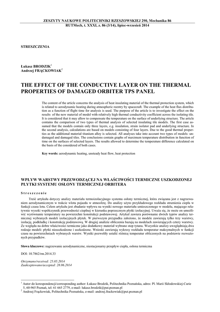ZESZYTY NAUKOWE POLITECHNIKI RZESZOWSKIEJ 290, Mechanika 86 RUTMech, t. XXXI, z. 86 (3/14), lipiec-wrzesień 2014 STRESZCZENIA Łukasz BRODZIK1 Andrzej FRĄCKOWIAK2 THE EFFECT OF THE CONDUCTIVE LAYER ON THE THERMAL PROPERTIES OF DAMAGED ORBITER TPS PANEL The content of the article concerns the analysis of heat insulating material of the thermal protection system, which is related to aerodynamic heating during atmospheric reentry by spacecraft. The example of the heat flux distribution as a function of flight time for analysis is used. The purpose of the article is to investigate the effect on the results of the new material of model with relatively high thermal conductivity coefficient across the isolating tile. It is considered that it may allow to compensate the temperature on the surface of underlying structure. The article contains the comparison of two types of thermal analysis of selected insulating tile models. The first case assumed that the models contain only three layers, e.g. insulation, strain isolator pad and underlying structure. In the second analysis, calculations are based on models consisting of four layers. Due to the good thermal properties as the additional material titanium alloy is selected. All analyses take into account two types of models: undamaged and damaged tiles. The conclusions contain graphs of maximum temperature distribution in function of time on the surfaces of selected layers. The results allowed to determine the temperature difference calculated on the basis of the considered of both cases. Key words: aerodynamic heating, unsteady heat flow, heat protection WPŁYW WARSTWY PRZEWODZĄCEJ NA WŁAŚCIWOŚCI TERMICZNE USZKODZONEJ PŁYTKI SYSTEMU OSŁONY TERMICZNEJ ORBITERA Streszczenie Treść artykułu dotyczy analizy materiału termoizolacyjnego systemu osłony termicznej, która związana jest z nagrzewaniem aerodynamicznym w trakcie wlotu pojazdu w atmosferę. Do analizy uŜyto przykładowego rozkładu strumienia ciepła w funkcji czasu lotu. Celem artykułu jest zbadanie wpływu na wyniki nowego materiału umieszczonego w modelu, mającego relatywnie wysoki współczynnik przewodności cieplnej w kierunku poprzecznym płytki izolacyjnej. UwaŜa się, Ŝe moŜe on umoŜliwić wyrównanie temperatury na powierzchni konstrukcji podstawowej. Artykuł zawiera porównanie dwóch typów analizy termicznej wybranych modeli izolacyjnych płytek. W pierwszym przypadku załoŜono, Ŝe modele zawierają tylko trzy warstwy, izolację, podkładkę i konstrukcję podstawową. W drugiej analizie obliczenia bazują na modelach zawierających cztery warstwy. Ze względu na dobre właściwości termiczne jako dodatkowy materiał wybrano stop tytanu. Wszystkie analizy uwzględniają dwa rodzaje modeli: płytki nieuszkodzone i uszkodzone. Wnioski zawierają wykresy rozkładu temperatur maksymalnych w funkcji czasu na powierzchniach wybranych warstw. Wyniki pozwoliły ustalić róŜnicę temperatur obliczonych na podstawie rozwaŜonych przypadków. Słowa kluczowe: nagrzewanie aerodynamiczne, niestacjonarny przepływ ciepła, osłona termiczna DOI: 10.7862/rm.2014.33 Otrzymano/received: 25.05.2014 Zaakceptowano/accepted: 28.06.2014 1 Autor do korespondencji/corresponding author: Łukasz Brodzik, Politechnika Poznańska, adres: Pl. Marii Skłodowskiej-Curie 5, 60-965 Poznań, tel: 61 665 2779, e-mail: [email protected] 2 Andrzej Frąckowiak, Politechnika Poznańska, e-mail: [email protected] Przemysław CIśMIŃSKI3 Sylwia POLESEK-KARCZEWSKA4 Dariusz KARDAŚ5 Bartosz MERTAS6 CIEPLNO-PRZEPŁYWOWY MODEL KARBONIZACJI SUCHEGO WĘGLA Koksowanie węgla, istotne z technicznego punktu widzenia, jest procesem złoŜonym, na który składa się szereg zjawisk fizycznych i chemicznych. Kompleksowy model koksowania wymaga uwzględnienia zagadnień transportu ciepła, przemian fizykochemicznych i fazowych oraz zagadnień związanych z przepływem gazu. Podstawą procesu jest piroliza cząstki węgla, podczas której pod wpływem wysokiej temperatury ulega ona rozkładowi, w wyniku czego uwalniane są gazy pirolityczne. Termochemiczna konwersja cząstek węgla wiąŜe się jednocześnie ze zmianą ich struktury, tj. porowatości i gazoprzepuszczalności, co znacząco wpływa na dynamikę zmian ciśnienia w komorze koksowniczej. W pracy proponuje się jednowymiarowy nieustalony model procesu koksowania. Model opisuje proces karbonizacji węgla suchego i składa się z czterech równań bilansowych - bilansu masy fazy stałej, transportu masy fazy gazowej, bilansu pędu gazu, bilansu energii wsadu oraz, dodatkowo, równania stanu gazu doskonałego. Źródło masy gazów opisano bazując na danych termograwimetrycznych. Do rozwiązania zagadnień transportu ciepła i przepływu gazu wykorzystano schematy numeryczne częściowo niejawne. Model umoŜliwia predykcję rozkładu temperatury, ilości wydzielonych gazów, ciśnienia i prędkości gazów w komorze koksowniczej dla całego procesu rzeczywistego przy stosunkowo niewielkim koszcie obliczeń. Rezultaty wskazują jednoznacznie na istotny wpływ zawartości części lotnych w węglu oraz gazoprzepuszczalności na zmianę ciśnienia w komorze. Słowa kluczowe: koksowanie, piroliza, części lotne, gazoprzepuszczalność THERMAL-FLOW MODEL FOR DRY COAL CARBONIZATION Abstract Coal coking, crucial from technical point of view, is a very complex process involving many physical and chemical phenomena. The complete model of coking requires taking into account of problems of heat transfer, physico-chemical and phase transitions, and gas flow. The basis of the process is the pyrolysis of coal particle, during which under high temperature they undergo decomposition, in result of which the pyrolityc gases are released. Thermochemical conversion of coal particles is associated with their structure change, e.g. their porosity and permeability, which strongly affects the dynamics of pressure change in coking chamber. In the paper, the transient one