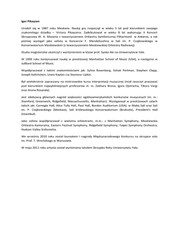 Igor Pikayzen Urodził się w 1987 roku Moskwie. Naukę gry rozpoczął w wieku 5 lat pod kierunkiem swojego znakomitego dziadka – Victora Pikayzena. Zadebiutował w wieku 8 lat wykonując II Koncert Skrzypcowy W. A. Mozarta z towarzyszeniem Orkiestry Symfonicznej Filharmonii w Ankarze, a rok później wystąpił jako solista w Koncercie F. Mendelssohna w Sali im. P. Czajkowskiego w Konserwatorium Moskiewskim (z towarzyszeniem Moskiewskiej Orkiestry Radiowej). Studia magisterskie ukończył z wyróżnieniem w klasie prof. Syoko Aki na Uniwersytecie Yale. W 1999 roku kontynuował naukę w prestiżowej Manhattan School of Music (USA), a następnie w Juilliard School of Music. Współpracował z takimi znakomitościami jak: Sylvia Rosenberg, Itzhak Perlman, Stephen Clapp, Joseph Kalichstein, Lewis Kaplan czy Seymour Lipkin. Był wielokrotnie zapraszany na mistrzowskie kursy interpretacji muzycznej (miał zaszczyt pracować pod kierunkiem najwybitniejszych profesorów m. in. Zakhara Brona, Igora Ojstracha, Tibora Vargi oraz Arona Rosanda). Jest zdobywcą głównych nagród większości ogólnoamerykańskich konkursów muzycznych (m. in.: Stamford, Greenwich, Ridgefield, Massachussetts, Manhattan). Występował w prestiżowych salach takich jak: Carnegie Hall, Alice Tully Hall, Paul Hall, Borden Auditorium (USA), w Małej Sali oraz Sali im. P. Czajkowskiego (Moskwa), Sali Królewskiego Konserwatorium (Bruksela), President's Hall (Istambuł). Jako solista współpracował z wieloma orkiestrami, m.in.: z Manhattan Symphony, Moskiewska Orkiestra Kameralna, Eastern Festival Symphony, Ridgefield Symphony, Taipei Symphony Orchestra, Hudson Valley Sinfonietta. We wrześniu 2010 roku został laureatem I nagrody Międzynarodowego Konkursu na skrzypce solo im. Prof. T. Wrońskiego w Warszawie. W maju 2011 roku artysta został wyróżniony tytułem Skrzypka Roku Uniwersytetu Yale.