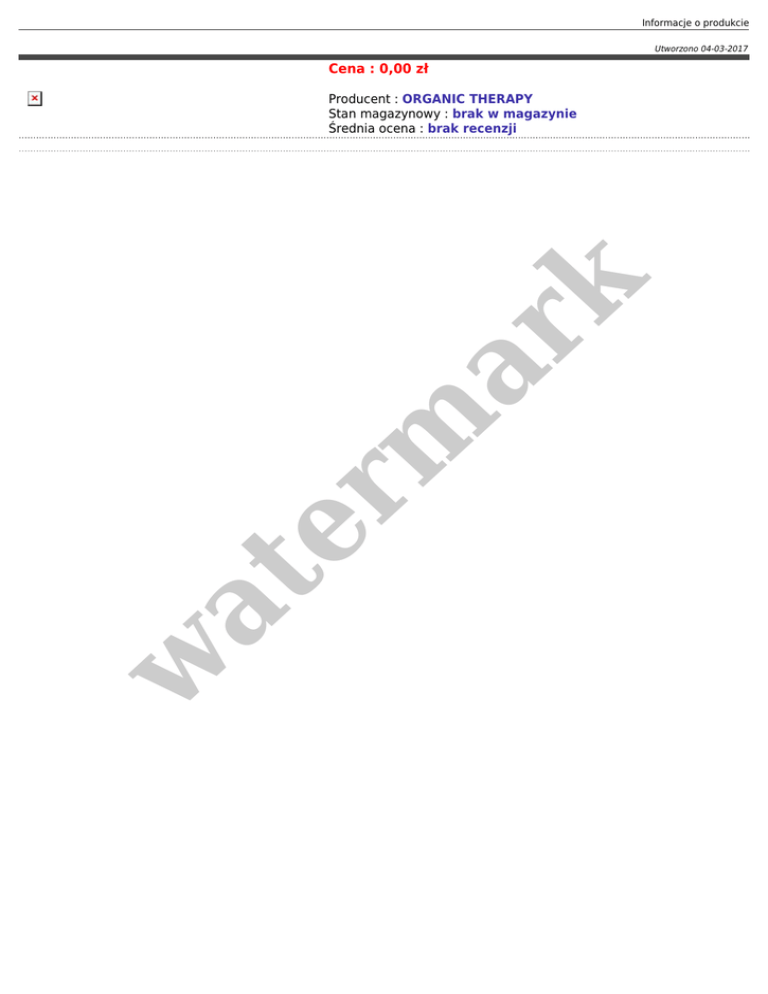 Informacje o produkcie Utworzono 04-03-2017 Cena : 0,00 zł w at er m ar k Producent : ORGANIC THERAPY Stan magazynowy : brak w magazynie Średnia ocena : brak recenzji