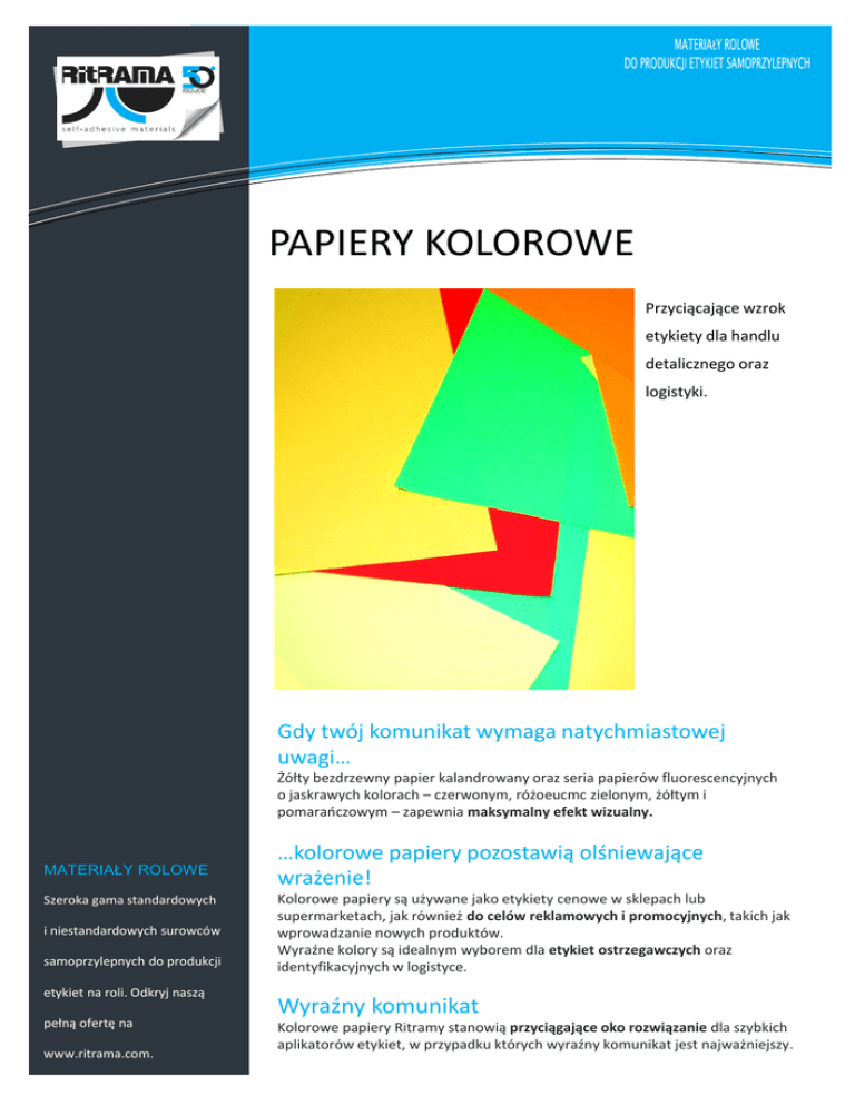 PAPIERY KOLOROWE Przyciącające wzrok etykiety dla handlu detalicznego oraz logistyki. Gdy twój komunikat wymaga natychmiastowej uwagi… Żółty bezdrzewny papier kalandrowany oraz seria papierów fluorescencyjnych o jaskrawych kolorach – czerwonym, różoeucmc zielonym, żółtym i pomarańczowym – zapewnia maksymalny efekt wizualny. MATERIAŁY ROLOWE Szeroka gama standardowych i niestandardowych surowców samoprzylepnych do produkcji etykiet na roli. Odkryj naszą pełną ofertę na www.ritrama.com. …kolorowe papiery pozostawią olśniewające wrażenie! Kolorowe papiery są używane jako etykiety cenowe w sklepach lub supermarketach, jak również do celów reklamowych i promocyjnych, takich jak wprowadzanie nowych produktów. Wyraźne kolory są idealnym wyborem dla etykiet ostrzegawczych oraz identyfikacyjnych w logistyce. Wyraźny komunikat Kolorowe papiery Ritramy stanowią przyciągające oko rozwiązanie dla szybkich aplikatorów etykiet, w przypadku których wyraźny komunikat jest najważniejszy. PAPIERY KOLOROWE NAZWA VELLUM YELLOW FLUO RED FLUO ORANGE FLUO YELLOW FLUO GREEN FLUO PINK MATERIAŁY ROLOWE Szeroka gama standardowych i niestandardowych surowców samoprzylepnych do produkcji etykiet na roli. Odkryj naszą pełną ofertę na www.ritrama.com. PAPIERY KOLOROWE 02.13 KLEJ PODKŁAD MATERIAŁ WIERZCHNI WAGA g/m² GRUBOŚĆ µ AP904 YG60 Żółty bezdrzewny papier kalandrowany 80 80 WG62 Czerwony fluorescencyjny bezdrzewny papier powlekany 68 66 WG62 Pomarańczowy fluorescencyjny bezdrzewny papier powlekany 68 66 WG62 Żłóty fluorescencyjny bezdrzewny papier powlekany 68 66 WG62 Zielony fluorescencyjny bezdrzewny papier powlekany 68 66 WG62 Różowy fluorescencyjny bezdrzewny papier powlekany 68 66 AP904 AP904 AP904 AP904 AP904