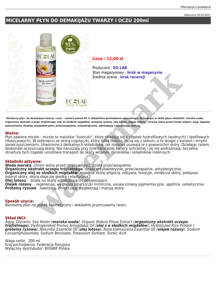 Informacje o produkcie Utworzono 04-03-2017 MICELARNY PŁYN DO DEMAKIJAŻU TWARZY I OCZU 200ml Cena : 12,00 zł er m ar k Producent : EO LAB Stan magazynowy : brak w magazynie Średnia ocena : brak recenzji Micelarny płyn do demakijażu twarzy i oczu - zawiera ponad 95 % składników pochodzenia naturalnego. Wchodzące w skład płynu składniki morska woda, organiczny ekstrakt uczepu trójlistnego, olej ze słodkich migdałów, proteiny ryżowe, olej lotosu, olejek różany - chronią skórę przed utratą wilgoci, koją, łagodzą podrażnienia, działają antybakteryjnie, przeciwzapalnie, antyalergicznie, odmładzają i odświeżają, matują. Ważne: Płyn zawiera micele - micele to malutkie "kuleczki", które składają się z cząstek hydrofilowych (wodnych) i lipofilowych (tłuszczowych). W zetknięciu ze skórą cząsteczki, które lubią tłuszcz, łączą się z sebum, a te drugie z kurzem i innymi zanieczyszczeniami. Utworzone z delikatnych składników, jak magnes usuwają je z powierzchni skóry. Działając razem, doskonale oczyszczają skórę. Nie naruszają przy tym naturalnej bariery ochronnej i jej nie podrażniają. Szczelna struktura tych cząstek umożliwia transport do skóry witamin, minerałów i składników roślinnych. at Składniki aktywne: Woda morska chroni skórę przed utratą wilgoci, działa przeciwzapalnie. Organiczny ekstrakt uczepu trójlistnego działa antybakteryjnie, przeciwzapalnie, antyalergicznie. Organiczny olej ze słodkich migdałów napełnia skórę wilgocią, odżywia, tonizuje, zmiękcza skórę, polepsza koloryt skóry, skóra staje się gładka i elastyczna. Olej lotosu - działa na skórę odmładzająco i odświeżająco. Olejek różany - regeneruje, wygładza zmarszczki mimiczne, usuwa zmiany pigmentacyjne, ujędrnia, uelastycznia. Proteiny ryżowe nawilżają, zmiękczają, wygładzają i matują skórę. w Sposób użycia: Nanosimy płyn na płatek kosmetyczny i dokładnie przemywamy twarz. Skład INCI: Aqua, Glycerin, Sea Water (morska woda), Organic Bidens Pilosa Extract (organiczny ekstrakt uczepu trójlistnego), Hydrogenated Prunus Amygdalus Oil (olej z e słodkich migdałów), Hydrolyzed Rice Protein ( proteiny ryżowe), Nelumbo Essential Oil (olej lotosu), Rosa Damascena Essential Oil (olejek różany), Sodium Cocoamphoacetate, Sodium Benzoate, Potassium Sorbate, Sorbic Acid Waga netto 200 ml Kraj pochodzenia: Federacja Rosyjska Wyłączny dystrybutor: BIOARP Polska