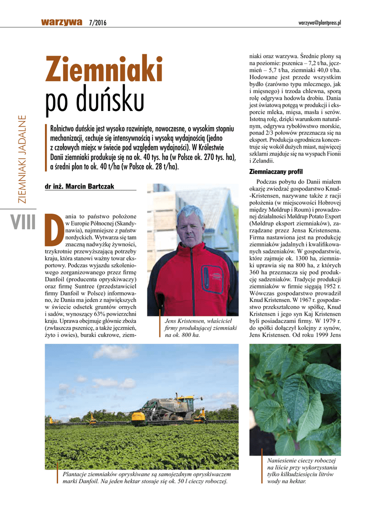 ZIEMNIAKI JADALNE warzywa VIII 7/2016 [email protected] Ziemniaki po duńsku Rolnictwo duńskie jest wysoko rozwinięte, nowoczesne, o wysokim stopniu mechanizacji, cechuje się intensywnością i wysoką wydajnością (jedno z czołowych miejsc w świecie pod względem wydajności). W Królestwie Danii ziemniaki produkuje się na ok. 40 tys. ha (w Polsce ok. 270 tys. ha), a średni plon to ok. 40 t/ha (w Polsce ok. 28 t/ha). dr inż. Marcin Bartczak D ania to państwo położone w Europie Północnej (Skandynawia), najmniejsze z państw nordyckich. Wytwarza się tam znaczną nadwyżkę żywności, trzykrotnie przewyższającą potrzeby kraju, która stanowi ważny towar eksportowy. Podczas wyjazdu szkoleniowego zorganizowanego przez firmę Danfoil (producenta opryskiwaczy) oraz firmę Suntree (przedstawiciel firmy Danfoil w Polsce) informowano, że Dania ma jeden z największych w świecie odsetek gruntów ornych i sadów, wynoszący 63% powierzchni kraju. Uprawa obejmuje głównie zboża (zwłaszcza pszenicę, a także jęczmień, żyto i owies), buraki cukrowe, ziem- Jens Kristensen, właściciel firmy produkującej ziemniaki na ok. 800 ha. Plantacje ziemniaków opryskiwane są samojezdnym opryskiwaczem marki Danfoil. Na jeden hektar stosuje się ok. 50 l cieczy roboczej. niaki oraz warzywa. Średnie plony są na poziomie: pszenica – 7,2 t/ha, jęczmień – 5,7 t/ha, ziemniaki 40,0 t/ha. Hodowane jest przede wszystkim bydło (zarówno typu mlecznego, jak i mięsnego) i trzoda chlewna, sporą rolę odgrywa hodowla drobiu. Dania jest światową potęgą w produkcji i eksporcie mleka, mięsa, masła i serów. Istotną rolę, dzięki warunkom naturalnym, odgrywa rybołówstwo morskie, ponad 2/3 połowów przeznacza się na eksport. Produkcja ogrodnicza koncentruje się wokół dużych miast, najwięcej szklarni znajduje się na wyspach Fionii i Zelandii. Ziemniaczany profil Podczas pobytu do Danii miałem okazję zwiedzać gospodarstwo Knud-Kristensen, nazywane także z racji położenia (w miejscowości Hobrovej między Møldrup i Roum) i prowadzonej działalności Møldrup Potato Export (Møldrup eksport ziemniaków), zarządzane przez Jensa Kristensena. Firma nastawiona jest na produkcję ziemniaków jadalnych i kwalifikowanych sadzeniaków. W gospodarstwie, które zajmuje ok. 1300 ha, ziemniaki uprawia się na 800 ha, z których 360 ha przeznacza się pod produkcję sadzeniaków. Tradycje produkcji ziemniaków w firmie sięgają 1952 r. Wówczas gospodarstwo prowadził Knud Kristensen. W 1967 r. gospodarstwo przekształcono w spółkę, Knud Kristensen i jego syn Kaj Kristensen byli posiadaczami firmy. W 1979 r. do spółki dołączył kolejny z synów, Jens Kristensen. Od roku 1999 Jens Naniesienie cieczy roboczej na liście przy wykorzystaniu tylko kilkudziesięciu litrów wody na hektar. Bulwy przechowywane są w nowoczesnej przechowalni. Dużą uwagę przywiązuje się do przestrzegania czystości w obiektach, gdzie składowane są ziemniaki. Kristensen jest jedynym właścicielem firmy. Firma dysponuje własnym nowoczesnym parkiem maszynowym. Współpracuje także z licznym gronem innych producentów. Ich plantacje są zlokalizowane w całej Danii, choć preferuje się północną Jutlandię i Zelandię oraz południową część Lolland i Falster. W 1991 r. zbudowano nowoczesne centrum sortowania, a w 2000 r. została oddana do użytku w Hobrovej Ziemniaki składowane są w skrzyniopaletach. W pierwszym etapie magazynowania bulwy poddaje się osuszaniu. Zdjęcia: M. Bartczak sadzeniaków odbywa się głównie za pośrednictwem firmy Unipatatas A/S w Esbjerg, w której Jens Kristensen posiada dwie trzecie udziałów. Technologia Duński farmer podkreślał, że produkcja nasienna ziemniaków jest jedną z najbardziej opłacalnych upraw, co oznacza, że koszty ponoszone na wyprodukowanie zdrowych sadzeniaków W Danii ziemniaki produkuje się na ok. 40 tys. ha (w Polsce ok. 270 tys. ha), a średni plon to ok. 40 t/ha (w Polsce ok. 28 t/ha). nowoczesna przechowalnia z suszarnią. Obiekt, chłodnia i centrum sortowania ma 7000 m2 i może pomieścić około 60 tys. t ziemniaków. Møldrup eksport ziemniaków wysyła poza granice Danii 85% swojej produkcji. Głównie do Europy Południowej, na Bliski Wschód i do Afryki Północnej. W firmie od wiosny do 15 października pracuje około 25 pracowników na trzy zmiany, przez siedem dni w tygodniu. Po połowie października pracuje się na dwie zmiany – w sortowani i pakowni. Sprzedaż warzywa są rekompensowane ceną, jaką można uzyskać za kwalifikowany materiał. Jens Kristensen akcentował, że nie jest to łatwy kierunek produkcji, ponieważ wymaga od producenta, poza dobra znajomością technologii uprawy, również znajomości odmian oraz aktualnych przepisów. Urzędnicy kontrolują, aby wytworzone sadzeniaki były wysokiej jakości i odpowiadały przyjętym normom. Za najważniejszy problem w nasiennictwie ziemniaka plantator wskazał przestrzeganie norm dotyczących zdrowotności bulw. W gospodarstwie plantacje nasienne zlokalizowane są w rejonach, gdzie mniej licznie występują mszyce (przenoszą wirusy). Duży nacisk kładzie się także na sprzęt wykorzystywany do ochrony i dobór środków ochrony roślin. Firma zainwestowała w opryskiwacz samojezdny Danfoil AirCules. Szczególne zdziwienie osób z Polski wzbudził jego niski wydatek cieczy roboczej na jednostkę powierzchni. Zastosowane rozwiązania (oparte na pomyśle sprzed 25 lat) – głównie opatentowany atomizer Eurofoil® – pozwalają na skuteczną ochronę roślin przy zużyciu wody na poziomie 30–50 l/ha. W przypadku opryskiwacza, który zakupił Jens Kristensen, ze zbiornikiem o pojemności 6000 litrów, powierzchnia oprysku to do 220 ha przy jednym napełnieniu zbiornika. Należy podkreślić, że w duńskich opryskiwaczach dużą uwagę zwrócono na powietrze. To ono stanowi siłę napędową dla cieczy roboczej, dzięki czemu można było zmniej