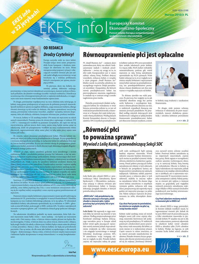 o h! f in kac S E zy K E ję 22 w ISSN 1830-5148 Marzec 2010/3 PL EKES info Europejski Komitet Ekonomiczno-Społeczny Pomost między Europą a zorganizowanym społeczeństwem obywatelskim OD REDAKCJI Drodzy Czytelnicy! Czyteln Europa uczyniła wiele na rzecz kobiet. Przyjęła tysiące stron ustaw, przeprowadziła liczne kampanie i działania zmierzające do ułatwienia im życia. Mimo niezaprzeczalnej poprawy sytuacji i obiecujących wyników równość płci jest jednak nadal odległą rzeczywistością i wciąż borykamy się z wieloma problemami, których rozwiązanie jest sprawą niecierpiącą zwłoki. Po pierwsze, skoro my, kobiety, stanowimy połowę elektoratu unijnego, powinnyśmy, w imię wartości demokracji uczestniczącej, stanowić połowę wybieranych polityków, decydentów wysokiego szczebla i ważnych osobistości. Demokracja uczestnicząca bez równouprawnienia płci jest co najmniej niedoskonała, a w najgorszym razie może stanowić swoje fundamentalne zaprzeczenie. Po drugie, powinnyśmy współpracować na rzecz obalenia mitu mówiącego, że kobiety mają gorsze predyspozycje od mężczyzn do pełnienia pewnych stanowisk. Sposób myślenia to sprawa szczególnie delikatna, a jego zmiana jest niełatwa, dlatego również stereotypy są tak trudne do obalenia. Aby zatem spowodować rzeczywistą zmianę, powinnyśmy wykorzystać wszystkie „miękkie” narzędzia, którymi dysponujemy, takie jak edukacja, szkolenia, kampanie informacyjne, przekazy medialne. Po trzecie, kobiety w UE zarabiają średnio 15% mniej niż mężczyźni na takich samych stanowiskach. Pomimo prawa do równej płacy zapisanego w traktacie WE z 1957 r. i nieustających wysiłków na poziomie europejskim, aby zapis ten stał się rzeczywistością, upłynie jeszcze dużo czasu, zanim misję będzie można uznać za zakończoną. Jeżeli nie przyspieszymy wysiłków na rzecz wyeliminowania różnic płacowych, zagwarantowanie takiej samej płacy za taką sama pracę zajmie nam kolejne pół wieku. Po czwarte, należy promować przedsiębiorczość kobiet. Obecnie kobiety stanowią nie więcej niż jedną trzecią przedsiębiorców w Europie. Kryzys gospodarczy i wyzwania demograficzne powodują, że zachęcenie kobiet do zakładania firm staje się jeszcze bardziej potrzebne. Kryzys jest również okazją do propagowania przedsiębiorczości kobiet, ponieważ w chwili obecnej rządy dokonują przeglądu długoterminowych strategii politycznych. Wreszcie po piąte, należy umożliwić godzenie życia zawodowego z życiem rodzinnym. Żłobki i przedszkola powinny przestać być luksusem, a stać się naturalnym elementem współczesnego społeczeństwa. Istnieje wystarczająco dużo środków, począwszy od dzielenia stanowisk pracy i telepracy, a skończywszy na urlopach rodzicielskich dla matek i ojców, by umożliwić kobietom urodzenie dziecka bez obaw o dalszy rozwój kariery zawodowej. Ponadto należy rozwijać i wspierać opiekę nad osobami starszymi, ponieważ to znowu bardzo często kobiety opiekują się swoimi rodzicami w podeszłym wieku. Jest to oczywista konieczność na kontynencie, którego społeczeństwo starzeje się coraz bardziej. W żadnym wypadku nie należy umniejszać lub nie doceniać ich roli, a tym bardziej nie należy karać osób, która wybierają pracę w domu z dziećmi i rodziną przez całe życie lub jakąś część życia. Instytucje UE powinny podejmować więcej wysiłków w zakresie komunikacji, aby dotrzeć do kobiet. Wyniki badań opinii publicznej pokazują, że w porównaniu z mężczyznami kobiety czują się bardziej oddalone od UE, coraz mniej interesują się polityką, coraz słabiej popierają ideę Unii, z coraz mniejszym entuzjazmem odnoszą się do wspólnej waluty europejskiej i coraz częściej są gorzej poinformowane od mężczyzn. Ponieważ różnice między kobietami a mężczyznami w jasny sposób wpływają na nastawienie do UE, powinniśmy to uwzględnić w naszych komunikatach. Irlandzka kampania na rzecz traktatu lizbońskiego pokazuje, że to się opłaca. W referendach irlandzkich kobiety zdecydowanie opowiedziały się za traktatem: w 2009 r. głosowało za nim 66% kobiet, podczas gdy w 2008 r. jedynie 44%. To jeden z największych wzrostów w proporcji głosów „tak” w kontekście różnych grup społeczno-demograficznych. Na zakończenie chciałabym podzielić się moim marzeniem, które było również marzeniem mojej babki i które – mam nadzieję – nie będzie już marzeniem mojej córki. Otóż marzę o dniu, w którym różnica między płciami nie będzie dłużej dostrzegalna. O dniu, w którym dzieci na całym świecie, dziewczynki i chłopcy, będą mogli chodzić do szkoły, a dziewczyny i kobiety będą w stanie same decydować o swojej przyszłości. Marzę o dniu, w którym kobiety nie będą już potrzebowały parytetów. One są ważne, ale dla mnie jako kobiety są upokarzające, a dla naszych kolegów – dyskryminujące. Marzę o dniu, w którym równość między mężczyznami i kobietami będzie akceptowana w swojej różnorodności i w swojej komplementarności. Irini Pari Wiceprzewodnicząca EKES-u odpowiedzialna za komunikację EKES info – marzec 2010/3 Równouprawnienie płci jest opłacalne W „Small Business Act” – unijnym akcie ustawodawczym, który ma ułatwić funkcjonowanie małych i średnich przedsiębiorstw – zwraca się uwagę na to, że zbyt mało Europejczyków jest w stanie założyć własną firmę. Problem dotyczy wszystkich, zwłaszcza kobiet, w związku z czym program „Small Business Act” kładzie nacisk na potrzebę udzielenia im szczególnego wsparcia. Dzięki prezydencji szwedzkiej i hiszpańskiej, dla których rozwój przedsiębiorczości kobiet ma pierwszoplanowe znaczenie, zagadnienie to znalazło się w centrum uwagi i zostało nagłośnione przez media. Potrzeba pozytywnych działań zachęcających kobiety do wchodzenia w świat biznesu potwierdza jedynie 