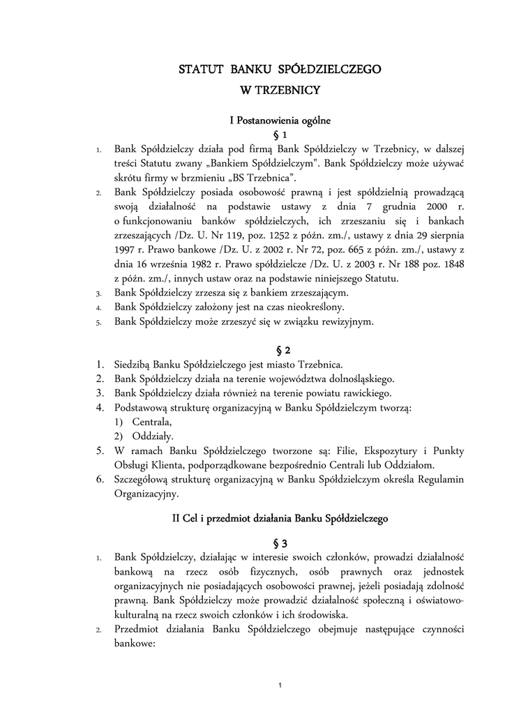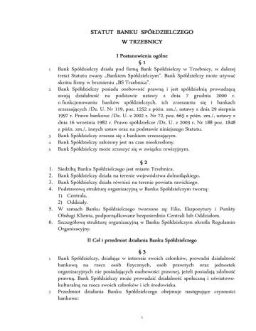 STATUT BANKU SPÓŁDZIELCZEGO W TRZEBNICY 1. 2. 3. 4. 5. 1. 2. 3. 4. 5. 6. I Postanowienia ogólne §1 Bank Spółdzielczy działa pod firmą Bank Spółdzielczy w Trzebnicy, w dalszej treści Statutu zwany „Bankiem Spółdzielczym". Bank Spółdzielczy może używać skrótu firmy w brzmieniu „BS Trzebnica”. Bank Spółdzielczy posiada osobowość prawną i jest spółdzielnią prowadzącą swoją działalność na podstawie ustawy z dnia 7 grudnia 2000 r. o funkcjonowaniu banków spółdzielczych, ich zrzeszaniu się i bankach zrzeszających /Dz. U. Nr 119, poz. 1252 z późn. zm./, ustawy z dnia 29 sierpnia 1997 r. Prawo bankowe /Dz. U. z 2002 r. Nr 72, poz. 665 z późn. zm./, ustawy z dnia 16 września 1982 r. Prawo spółdzielcze /Dz. U. z 2003 r. Nr 188 poz. 1848 z późn. zm./, innych ustaw oraz na podstawie niniejszego Statutu. Bank Spółdzielczy zrzesza się z bankiem zrzeszającym. Bank Spółdzielczy założony jest na czas nieokreślony. Bank Spółdzielczy może zrzeszyć się w związku rewizyjnym. §2 Siedzibą Banku Spółdzielczego jest miasto Trzebnica. Bank Spółdzielczy działa na terenie województwa dolnośląskiego. Bank Spółdzielczy działa również na terenie powiatu rawickiego. Podstawową strukturę organizacyjną w Banku Spółdzielczym tworzą: 1) Centrala, 2) Oddziały. W ramach Banku Spółdzielczego tworzone są: Filie, Ekspozytury i Punkty Obsługi Klienta, podporządkowane bezpośrednio Centrali lub Oddziałom. Szczegółową strukturę organizacyjną w Banku Spółdzielczym określa Regulamin Organizacyjny. II Cel i przedmiot działania Banku Spółdzielczego 1. 2. §3 Bank Spółdzielczy, działając w interesie swoich członków, prowadzi działalność bankową na rzecz osób fizycznych, osób prawnych oraz jednostek organizacyjnych nie posiadających osobowości prawnej, jeżeli posiadają zdolność prawną. Bank Spółdzielczy może prowadzić działalność społeczną i oświatowokulturalną na rzecz swoich członków i ich środowiska. Przedmiot działania Banku Spółdzielczego obejmuje następujące czynności bankowe: 1 przyjmowanie wkładów pieniężnych płatnych na żądanie lub z nadejściem oznaczonego terminu oraz prowadzenie rachunków tych wkładów, 2) prowadzenie innych rachunków bankowych, 3) udzielanie kredytów, 4) udzielanie i potwierdzanie gwarancji bankowych, 4a) emitowanie bankowych papierów wartościowych, 5) przeprowadzanie bankowych rozliczeń pieniężnych, 6) udzielanie pożyczek pieniężnych, 7) operacje czekowe i wekslowe, 8) wydawanie kart płatniczych oraz wykonywanie operacji przy ich użyciu, 9) nabywanie i zbywanie wierzytelności pieniężnych, 10) przechowywanie przedmiotów i papierów wartościowych oraz udostępnianie skrytek sejfowych, 11) udzielanie i potwierdzanie poręczeń, 12) prowadzenie skupu i sprzedaży wartości dewizowych, 13) pośredniczenie w dokonywaniu przekazów pieniężnych oraz rozliczeń w obrocie dewizowym. Przekazy pieniężne dokonywane są za pośrednictwem Banku Zrzeszającego. Czynności bankowe, o których mowa w ust. 2 pkt. 3, 4, 6 i 11, Bank Spółdzielczy może wykonywać z osobami fizycznymi zamieszkującymi lub prowadzącymi przedsiębiorstwo na terenie działania Banku Spółdzielczego lub z osobami prawnymi i jednostkami organizacyjnymi nie posiadającymi osobowości prawnej, a posiadającymi zdolność prawną, mającymi siedzibę lub jednostki organizacyjne na terenie działania Banku Spółdzielczego. Czynności bankowe, o których mowa w ust. 2 pkt. 4 i 11 Bank Spółdzielczy może wykonywać w zakresie i trybie uzgodnionym z Bankiem Zrzeszającym. Bank Spółdzielczy wykonuje również następujące czynności: 1) obejmuje lub nabywa akcje i prawa z akcji, udziały innej osoby prawnej i jednostki uczestnictwa w funduszach inwestycyjnych, 2) dokonuje obrotu papierami wartościowymi, 3) dokonuje, na warunkach uzgodnionych z dłużnikiem, zamiany wierzytelności na składniki majątku dłużnika, 4) nabywa i zbywa nieruchomości, 5) świadczy usługi konsultacyjno-doradcze w sprawach finansowych, 6) świadczy usługi finansowe w zakresie pośrednictwa przy zawieraniu umów ubezpieczeniowych, Bank Spółdzielczy jest obowiązany do sprzedaży składników majątku, o których mowa w ust. 5 pkt 3), w odniesieniu do: 1) nieruchomości – w okresie nie dłuższym niż 5 lat od daty nabycia, 2) pozostałych składników majątku – w okresie nie dłuższym niż 3 lata od daty nabycia. 1) 3. 4. 5. 6. 2 7. 8. 9. 10. Obowiązek, o którym mowa w ust. 6, nie spoczywa na Banku Spółdzielczym, jeżeli przejęte składniki majątku wykorzysta do prowadzenia własnej działalności bankowej. Każdorazowe objęcie lub nabycie, o którym mowa w ust. 5 pkt 1), dokonywane w granicach określonych w ustawie Prawo bankowe, wymaga uzyskania zgody Banku Zrzeszającego. Zgody Banku Zrzeszającego nie wymaga obejmowanie lub nabywanie akcji lub praw z akcji lub udziałów banków. Bank Spółdzielczy może, w drodze umowy zawartej na piśmie, na zasadach określonych w ustawie Prawo bankowe, powierzyć przedsiębiorcy lub przedsiębiorcy zagranicznemu, wykonywanie: 1) w imieniu i na rzecz Banku Spółdzielczego pośrednictwa w zakresie czynności wymienionych w art. 5 i 6 ustawy Prawo bankowe, określonych w przedmiocie działania Banku Spółdzielczego, 2) czynności faktycznych związanych z działalnością bankową. Szczegółowe zasady, zakres i tryb powierzenia, o którym mowa w ust. 9 określa regulamin uchwalany przez Zarząd i zatwierdzany przez Radę Nadzorczą. §4 Czynności, o których mowa w postanowieniach Statutu określających przedmiot działania Banku Spółdzielczego, należy sklasyfikować według Polskiej Klasyfikacji Działalności (PKD). III Członkowie, ich prawa i obowiązki 1. 2. 3. 4. 5. §5 Członkiem Banku Spółdzielczego (zwanym dalej członkiem lub członkiem Banku Spółdzielczego) może być osoba fizyczna o pełnej zdolności do czynności 