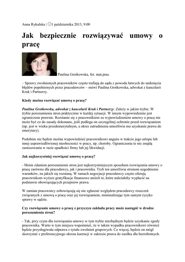 Anna Rykulska | 1 października 2013, 9:00 Jak bezpiecznie rozwiązywać umowy o pracę Paulina Grotkowska, fot. mat.pras. – Sprawy zwolnionych pracowników często trafiają do sądu z powodu łatwych do uniknięcia błędów popełnionych przez pracodawców – mówi Paulina Grotkowska, adwokat z kancelarii Kruk i Partnerzy. Kiedy można rozwiązać umowę o pracę? Paulina Grotkowska, adwokat z kancelarii Kruk i Partnerzy: Zależy w jakim trybie. W trybie porozumienia stron praktycznie w każdej sytuacji. W innym wypowiedzenie jest ograniczone prawnie. Rozstanie się z pracownikiem za wypowiedzeniem umowy o pracę nie może być co do zasady dokonane, jeśli podlega on szczególnej ochronie przed rozwiązaniem (np. jest w wieku przedemerytalnym, a okres zatrudnienia umożliwia mu uzyskanie prawa do emerytury). Podobnie nie będzie można wypowiedzieć pracownikowi angażu w trakcie jego urlopu lub innej usprawiedliwionej nieobecności w pracy, np. choroby. Ograniczenia te nie znajdą zastosowania w razie upadłości firmy lub jej likwidacji. Jak najkorzystniej rozwiązać umowę o pracę? - Moim zdaniem porozumienie stron jest najkorzystniejszym sposobem rozwiązania umowy o pracę zarówno dla pracodawcy, jak i pracownika. Tryb ten umożliwia stronom uzgodnienie warunków, na jakich się rozstaną. W ramach negocjacji pracodawcy często oferują pracownikom wyższe gratyfikacje finansowe aniżeli te, które należałoby wypłacić na podstawie obowiązujących przepisów prawa. W zamian pracownicy zobowiązują się nie zgłaszać względem pracodawcy roszczeń związanych z umową o pracę oraz jej rozwiązaniem, minimalizując tym samym ryzyko sprawy w sądzie. Czy rozwiązanie umowy o pracę z przyczyn zakładu pracy może nastąpić w drodze porozumienia stron? - Tak, przy czym dla rozwiązania umowy w tym trybie niezbędnym będzie uzyskanie zgody pracownika. Warto w tym miejscu wspomnieć, że w takim wypadku pracownikowi również będzie przysługiwała odprawa z tytułu zwolnień grupowych. Co więcej, będzie on mógł skorzystać z preferencyjnego okresu karencji w zakresie prawa do zasiłku dla bezrobotnych. Zasiłek taki będzie mu przysługiwał już po upływie 7 dni od dnia zarejestrowania się we właściwym powiatowym urzędzie pracy, a nie 90 dni jak przy zwykłym porozumieniu stron. Musi być spełniony tylko warunek: porozumienie stron musi stanowić expressis verbis, że rozstanie z pracownikiem jest konsekwencją upadłości firmy, jej likwidacji lub zmniejszenia zatrudnienia z przyczyn zakładu pracy. Jaka jest recepta na przygotowanie bezpiecznej dokumentacji dotyczącej rozwiązania umowy o pracę? - Porozumienie stron, z uwagi na mało sformalizowany charakter, wymaga zachowania dwóch warunków formalnych: powinno zostać zawarte w formie pisemnej i podpisane przez osoby upoważnione do reprezentowania stron. Warto zawrzeć również w treści porozumienia klauzulę zrzeczenia się roszczeń przez każdą ze stron względem drugiej strony w związku ze stosunkiem pracy i jego rozwiązaniem. W odróżnieniu od porozumienia stron przygotowanie dokumentu wypowiedzenia angażu wymaga zachowania znacznie większych wymogów formalnych. Muszą zostać w nim ujęte m.in. prawidłowo sformułowane przyczyny uzasadniające rozwiązanie (jeśli wypowiadamy bezterminową umowę o pracę), prawidłowo obliczony okres wypowiedzenia oraz pouczenie pracownika o prawie odwołania się do właściwego sądu pracy. Nieuwzględnienie któregokolwiek z tych elementów w treści wypowiedzenia skutkuje ryzykiem zarzutu ze strony pracownika, że rozwiązanie jego umowy o pracę było nieuzasadnione lub zostało dokonane z naruszeniem przepisów prawa. Jakich błędów unikać podczas spotkania z pracownikiem? - W tego typu spotkaniach zawsze rekomendowana jest obecność świadka. Jest to szczególne istotne z punktu widzenia interesu pracodawcy, który może obawiać się, że pracownik będzie podejmował próby uchylenia się od skutecznego wręczenia mu wypowiedzenia. Co więcej, zakładając alternatywne rozwiązanie umowy o pracę za wypowiedzeniem albo porozumieniem stron, ważne jest zachowanie prawidłowej sekwencji dokumentów przedstawianych pracownikowi. Najpierw zalecane jest wręczenie wypowiedzenia, a w dalszej kolejności przedstawienie propozycji rozstania się za porozumieniem. Odwrotna kolejność zdarzeń naraża pracodawcę na ryzyko, że pracownik odmówi podpisania porozumienia stron, a w efekcie nagłego obrotu sytuacji szef może nie zdążyć skutecznie wręczyć wypowiedzenia podwładnemu. Jakie są najczęstsze powody roszczeń pracowników wynikające z błędów popełnionych przez pracodawców w trakcie rozwiązywania lub wypowiadania umów o pracę? - Częstym powodem roszczeń jest nieprawidłowo sformułowana przyczyna rozwiązania umowy o pracę, która musi być konkretna, prawdziwa, rzeczywista i uzasadniona. Pracodawca powinien również pamiętać, że podaną przyczynę będzie musiał udowodnić w ewentualnym postępowaniu sądowym, bo na nim spoczywa ciężar dowodu. Warto zachować czujność na etapie rozwiązywania lub wypowiadania umów o pracę, by nie narazić się na koszty i długotrwałe postępowanie sądowe. Świadczenia pieniężne z tytułu rozwiązania umowy o pracę. Czyli, co i ile należy wypłacić pracownikowi? - W przypadku rozstania się za porozumieniem stron pracodawca powinien wypłacić pracownikowi świadczenia określone w treści porozumienia i w terminach tam określonych. W razie wypowiedzenia umowy o pracę należy głównie pamiętać, że pracownikowi trzeba wypłacać: wynagrodzenie za pracę przez cały okres wypowiedzenia (wynagrodzenie to powinno być płatne na takich samych zasadach jak przed wypowiedzeniem), ekwiwalent pieniężny, jeśli pracownik w okresie wypowiedzenia nie zdąży wykorzystać w całości należnego urlopu wypoczynkowego, a także odprawę z tzw. ustawy o zwolnieniach grupowyc