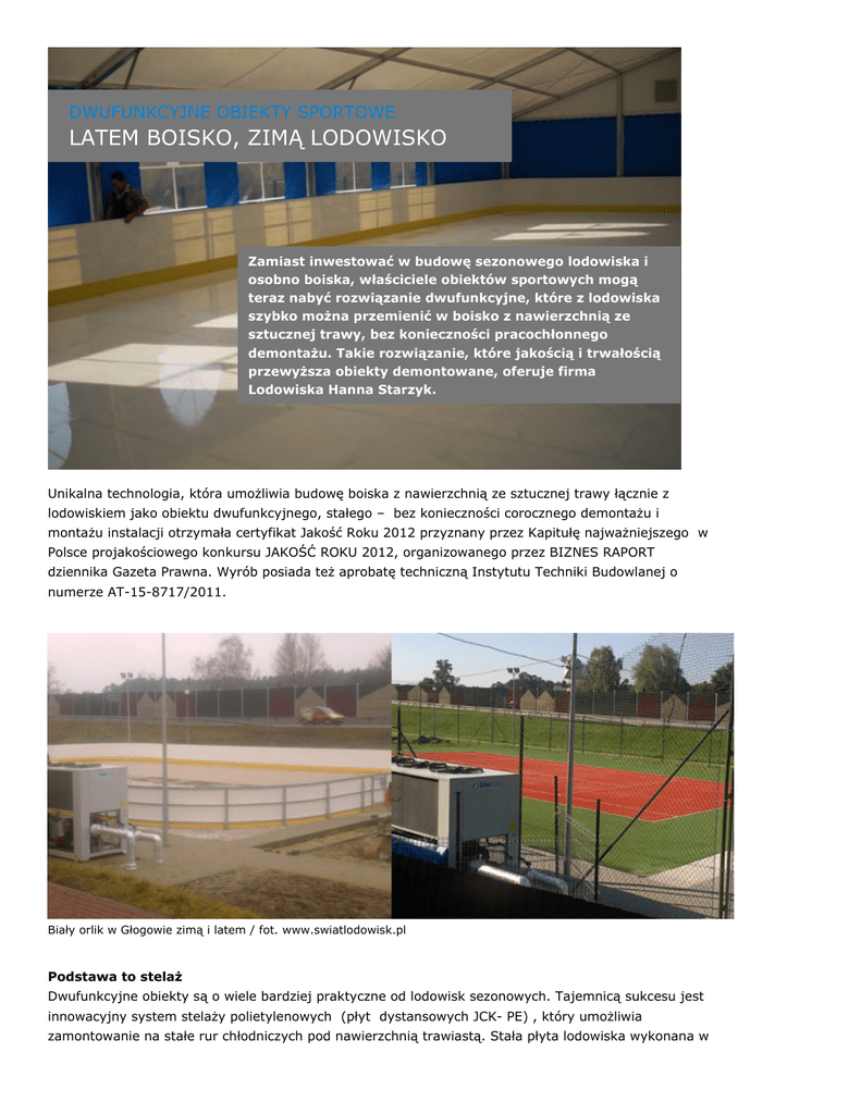 DWUFUNKCYJNE OBIEKTY SPORTOWE LATEM BOISKO, ZIMĄ LODOWISKO Zamiast inwestować w budowę sezonowego lodowiska i osobno boiska, właściciele obiektów sportowych mogą teraz nabyć rozwiązanie dwufunkcyjne, które z lodowiska szybko można przemienić w boisko z nawierzchnią ze sztucznej trawy, bez konieczności pracochłonnego demontażu. Takie rozwiązanie, które jakością i trwałością przewyższa obiekty demontowane, oferuje firma Lodowiska Hanna Starzyk. Unikalna technologia, która umożliwia budowę boiska z nawierzchnią ze sztucznej trawy łącznie z lodowiskiem jako obiektu dwufunkcyjnego, stałego – bez konieczności corocznego demontażu i montażu instalacji otrzymała certyfikat Jakość Roku 2012 przyznany przez Kapitułę najważniejszego w Polsce projakościowego konkursu JAKOŚĆ ROKU 2012, organizowanego przez BIZNES RAPORT dziennika Gazeta Prawna. Wyrób posiada też aprobatę techniczną Instytutu Techniki Budowlanej o numerze AT-15-8717/2011. Biały orlik w Głogowie zimą i latem / fot. www.swiatlodowisk.pl Podstawa to stelaż Dwufunkcyjne obiekty są o wiele bardziej praktyczne od lodowisk sezonowych. Tajemnicą sukcesu jest innowacyjny system stelaży polietylenowych (płyt dystansowych JCK- PE) , który umożliwia zamontowanie na stałe rur chłodniczych pod nawierzchnią trawiastą. Stała płyta lodowiska wykonana w systemie JCK-PE jest tańsza niż tradycyjna płyta żelbetowa. Stelaż z płyt JCK-PE utrzymuje stały, równomierny rozstaw rur chłodniczych, a jego konstrukcja zabezpiecza orurowanie przed uszkodzeniami mechanicznymi. Stelaż może przenosić obciążenia (np. urządzeń do pielęgnacji trawy) w okresie letnim. Zimą po zbudowaniu warstwy lodu bezpośrednio na nawierzchni z trawy, przeniesie również ciężar rolby. Biały orlik w Redzie zimą i latem / fot. www.swiatlodowisk.pl Oszczędności nie brakuje Obiekt sportowy dwa w jednym pozwala oszczędzać czas i koszty dzięki temu, że właściciel obiektu nie musi zatrudniać osób do montażu i demontażu. Zaletą rozwiązania jest też oszczędność ograniczonej często przestrzeni. Ponadto boisko-lodowisko może mieć dodatkowo wbudowany agregat chłodniczy z funkcją odzyskiwania ciepła. Tym sposobem ciepło odpadowe może być wykorzystane do podgrzewania wody dla rolby, do wspomagania ogrzewania szatni, wody w basenie itp. Stosowane agregaty charakteryzują się wysoką jakością wszystkich podzespołów, niezawodnością oraz niskim zużyciem energii elektrycznej. Każdy agregat jest dobierany indywidualnie i produkowany pod potrzeby konkretnego lodowiska, przy uwzględnieniu lokalnych warunków klimatycznych. Przed zainstalowaniem na miejscu przeznaczenia agregat jest testowany w warunkach fabrycznych. Lodowisko w Giżycku / fot. www.swiatlodowisk.pl Nauczeni doświadczeniem Firma Lodowiska Hanna Starzyk działa na rynku od 12 lat, zyskując przez ten czas miano lidera w branży profesjonalnych producentów lodowisk, głównie dzięki przykładaniu wagi do wysokiego standardu oferowanych rozwiązań. Przedsiębiorstwo ma na swoim koncie realizacje takie jak np. lodowisko hokejowe w Oświęcimiu, wyposażone w nowoczesny agregat chłodniczy, wykorzystujący ciepło odpadowe powstałe podczas mrożenia lodu do ogrzewania wody, czy płytę lodowiska i bandy w Mazurskim Centrum Sportów Lodowych w Giżycku. Firma specjalizuje się w budowie żelbetowych, monolitycznych płyt dla lodowisk stacjonarnych. Płyta taka, w odróżnieniu od tradycyjnej dylatowanej płyty, nie wymaga corocznego uzupełniania szczelin dylatacyjnych. Jest idealnie gładka, może być latem użytkowana do jazdy na rolkach, bądź po ułożeniu sztucznej, mrozoodpornej nawierzchni sportowej, jako kort tenisowy lub boisko. Ilość i jakość wykonanych płyt żelbetowych lodowisk czynią firmę niekwestionowanym liderem w tej dziedzinie. Produkt „Monolityczne, żelbetowe płyty lodowisk” uzyskał kilkukrotnie tytuł Lidera Rynku. Ponadto, dzięki kadrze sprawdzonych projektantów z ogromnym doświadczeniem, firma wykonuje projekty technologiczno-budowlane, a każdy z nich jest indywidualnie dostosowany do potrzeb i możliwości inwestora. Wszystkie projekty tworzone są też z myślą o oszczędnościach w kosztach eksploatacyjnych. Z pełna ofertą firmy Lodowiska Hanna Starzyk można zapoznać się na stronie: www.swiatlodowisk.pl