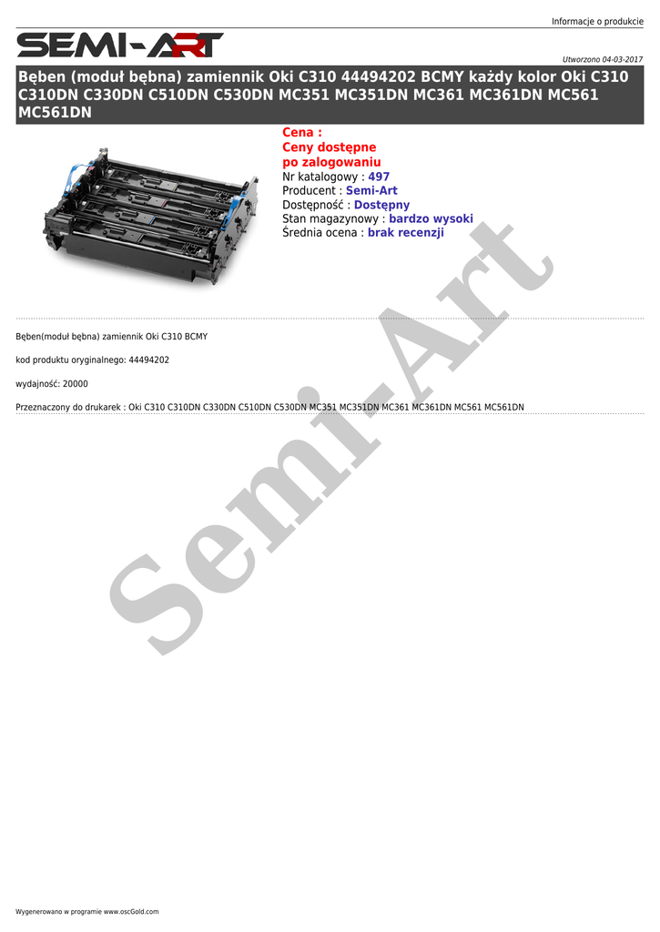 Informacje o produkcie Utworzono 04-03-2017 Bęben (moduł bębna) zamiennik Oki C310 44494202 BCMY każdy kolor Oki C310 C310DN C330DN C510DN C530DN MC351 MC351DN MC361 MC361DN MC561 MC561DN Cena : Ceny dostępne po zalogowaniu Ar t Nr katalogowy : 497 Producent : Semi-Art Dostępność : Dostępny Stan magazynowy : bardzo wysoki Średnia ocena : brak recenzji Bęben(moduł bębna) zamiennik Oki C310 BCMY kod produktu oryginalnego: 44494202 wydajność: 20000 Se m i- Przeznaczony do drukarek : Oki C310 C310DN C330DN C510DN C530DN MC351 MC351DN MC361 MC361DN MC561 MC561DN Wygenerowano w programie www.oscGold.com