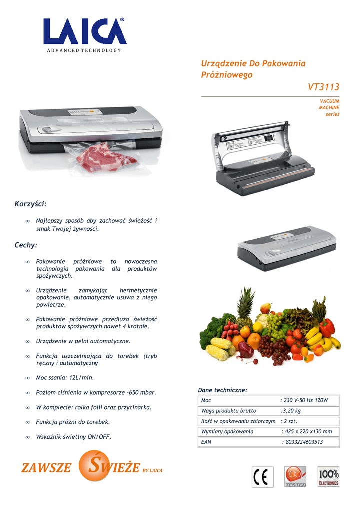ADVANCED TECHNOLOGY Urządzenie Do Pakowania PróŜniowego VT3113 VACUUM MACHINE series Korzyści: • Najlepszy sposób aby zachować świeŜość i smak Twojej Ŝywności. Cechy: • Pakowanie próŜniowe to nowoczesna technologia pakowania dla produktów spoŜywczych. • Urządzenie zamykając hermetycznie opakowanie, automatycznie usuwa z niego powietrze. • Pakowanie próŜniowe przedłuŜa świeŜość produktów spoŜywczych nawet 4 krotnie. • Urządzenie w pełni automatyczne. • Funkcja uszczelniająca do torebek (tryb ręczny i automatyczny • Moc ssania: 12L/min. • Poziom ciśnienia w kompresorze –650 mbar. • W komplecie: rolka folii oraz przycinarka. • Funkcja próŜni do torebek. • Wskaźnik świetlny ON/OFF. ZAWSZE ŚWIEŻE Dane techniczne: Moc : 230 V-50 Hz 120W Waga produktu brutto :3,20 kg Ilość w opakowaniu zbiorczym : 2 szt. BY LAICA Wymiary opakowania : 425 x 220 x130 mm EAN : 8033224603513