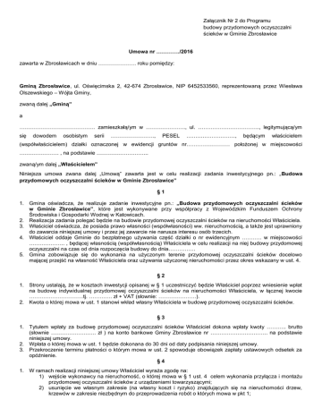 Załącznik Nr 2 do Programu budowy przydomowych oczyszczalni ścieków w Gminie Zbrosławice Umowa nr …………./2016 zawarta w Zbrosławicach w dniu ………………… roku pomiędzy: Gminą Zbrosławice, ul. Oświęcimska 2, 42-674 Zbrosławice, NIP 6452533560, reprezentowaną przez Wiesława Olszewskiego – Wójta Gminy, zwaną dalej „Gminą” a …………………………………… zamieszkałą/ym w …………………., ul. ……………………………., legitymującą/ym się dowodem osobistym serii ……………………, PESEL ………………………, będącym właścicielem (współwłaścicielem) działki oznaczonej w ewidencji gruntów nr…………………… położonej w miejscowości …………………. , na podstawie ……………………….. zwaną/ym dalej „Właścicielem” Niniejsza umowa zwana dalej „Umową” zawarta jest w celu realizacji zadania inwestycyjnego pn.: „Budowa przydomowych oczyszczalni ścieków w Gminie Zbrosławice” §1 1. Gmina oświadcza, że realizuje zadanie inwestycyjne pn.: „Budowa przydomowych oczyszczalni ścieków w Gminie Zbrosławice”, które jest wykonywane przy współpracy z Wojewódzkim Funduszem Ochrony Środowiska i Gospodarki Wodnej w Katowicach. 2. Realizacja zadania polegać będzie na budowie przydomowej oczyszczalni ścieków na nieruchomości Właściciela. 3. Właściciel oświadcza, że posiada prawo własności (współwłasności) ww. nieruchomością, a także jest uprawniony do zawarcia niniejszej umowy i przez jej zawarcie nie narusza interesu osób trzecich. 4. Właściciel oddaje Gminie do bezpłatnego używania część działki o nr ewidencyjnym ……….. w miejscowości ……………….. , będącej własnością (współwłasnością) Właściciela w celu realizacji na niej budowy przydomowej oczyszczalni na czas od dnia rozpoczęcia budowy do dnia…………… 5. Gmina zobowiązuje się do wykonania na użyczonym terenie przydomowej oczyszczalni ścieków docelowo mającej przejść na własność Właściciela oraz używania użyczonej nieruchomości przez okres wskazany w ust. 4. §2 1. Strony ustalają, że w kosztach inwestycji opisanej w § 1 uczestniczyć będzie Właściciel poprzez wniesienie wpłat na budowę indywidualnej przydomowej oczyszczalni ścieków na nieruchomości Właściciela, w łącznej kwocie …………………………tj. …………. zł + VAT (słownie: …………………). 2. Kwota o której mowa w ust. 1 stanowi wkład własny Właściciela w budowę przydomowej oczyszczalni ścieków. §3 1. Tytułem wpłaty za budowę przydomowej oczyszczalni ścieków Właściciel dokona wpłaty kwoty ……….. brutto (słownie ……………………. zł ) na konto bankowe Gminy Zbrosławice nr ………………………….. na podstawie niniejszej umowy. 2. Wpłata o której mowa w ust. 1 będzie dokonana do 30 dni od daty podpisania niniejszej umowy. 3. Przekroczenie terminu płatności o którym mowa w ust. 2 spowoduje obowiązek zapłaty ustawowych odsetek za opóźnienie. §4 1. W ramach realizacji niniejszej umowy Właściciel wyraża zgodę na: 1) wejście wykonawcy na nieruchomość, o której mowa w § 1 ust. 4 celem wykonania przyłącza i montażu przydomowej oczyszczalni ścieków z urządzeniami towarzyszącymi; 2) usunięcie we własnym zakresie (na własny koszt i ryzyko) znajdujących się na nieruchomości drzew, krzewów w zakresie niezbędnym do przeprowadzenia robót o których mowa w pkt 1; 3) przeprowadzenie przez Właściciela innych koniecznych robót związanych z budową nieobjętych obowiązkami wykonawcy. 2. Gmina nie ponosi żadnej odpowiedzialności wobec osób trzecich z tytułu ewentualnych roszczeń wynikających z wykonania niniejszej umowy. §5 Gminę w trakcie budowy będzie reprezentował ustanowiony przez nią Inspektor Nadzoru, do którego obowiązków będzie należał nadzór nad prawidłowością wykonanych robót budowlanych. §6 W przypadku niewywiązania się przez Właściciela z zobowiązań określonych w § 2 ust. 1 oraz § 3 umowy, Gmina ma prawo odstąpić od umowy. §7 1. Po wybudowaniu, przydomowa oczyszczalnia ścieków będzie stanowić własność Gminy. 2. Gmina zobowiązuje się do zawarcia z Właścicielem umowy użyczenia oczyszczalni na czas oznaczony. 3. Wzór umowy użyczenia stanowi załącznik nr 3 do programu budowy przydomowych oczyszczalni ścieków w Gminie Zbrosławice. 4. Niniejsza umowa stanowi umowę przedwstępną w zakresie umowy o której mowa w ust. 2. §8 Po upływie okresu użyczenia, o którym mowa w § 7 ust. 2 Gmina przeniesie na rzecz Właściciela własność przydomowej oczyszczalni ścieków protokołem przekazania. §9 W kwestiach nieregulowanych niniejszą umową mają zastosowania odpowiednie przepisy Kodeksu Cywilnego. § 10 Zmiany niniejszej umowy i uzupełnienia umowy wymagają formy pisemnej pod rygorem nieważności. § 11 Umowa została sporządzona w 2 jednobrzmiących egzemplarzach, po jednym dla każdej ze stron. Gmina: ............................................... Właściciel: .................................................