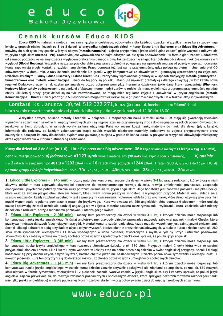 Cennik kursów Educo KIDS Educo KIDS to naturalna metoda nauczania języka angielskiego, odpowiednia dla każdego dziecka. Wszystkie nasze kursy zapewniają lekcje w grupach rówieśniczych od 5 do 8 dzieci. W przypadku najmłodszych dzieci – kursy Educo Little Explorers oraz Educo Big Adventures, mówimy do nich tylko i wyłącznie w języku obcym (metoda naturalna) - zajęcia przypominają jeden wielki „plac zabaw”, gdzie wszystko odbywa się w języku angielskim (metoda TPR). Gramatyka jest wprowadzana od najmłodszych lat, ale tylko podświadomie - w formie gier i zabaw. Dodatkowo od samego początku oswajamy dzieci z wyglądem graficznym danego słowa, tak że dzieci nie znając liter potrafią odczytywać niektóre wyrazy z ich wyglądu! (Global Reading). Wszystkie nasze zajęcia charakteryzuje praca z dziećmi polegająca na wprowadzaniu zasad pozytywnego wzmocnienia. Kursy zapewniają ciągły kontakt z językiem angielskim. Praca domowa też jest samą przyjemnością, gdyż polega na biernym słuchaniu płyt CD odtwarzanych w domu min. 2 razy dziennie, codziennie lub graniu w gry komputerowe ze słownictwem i gramatyką wprowadzoną na zajęciach. Dzieciom szkolnym – kursy Educo Discovery i Educo Direct Kids - zaczynamy wprowadzać gramatykę w sposób tradycyjny metoda gramatycznotłumaczeniowa oraz metoda komunikacyjna. Dzieci do tej pory są po kilku latach „nasiąkania” gramatyką i dlatego chwytają „w lot” każdą nową regułkę! Dodatkowo uczymy jak czytać po angielsku ucząc połączeń pomiędzy literami a dźwiękami jakie dane litery reprezentują (Phonics). Końcowe klasy szkoły podstawowej to najbardziej efektowny moment gdyż zarówno rodzic jak i nauczyciel może z ogromną przyjemnością oglądać efekty kilkuletniej pracy, gdyż dzieci są na tyle zaawansowane, że mogą mieć regularne zajęcia z „mówienia” w języku angielskim (Metoda Komunikacyjna – Direct). Dzieci prócz grup 5-8 osobowych mogą również uczyć się w grupach 2-4 osobowych lub w trakcie lekcji indywidualnych. Łomża ul. Ks. Janusza I 30, tel. 512 022 271, [email protected], facebook.com/EducoSchool biuro szkoły otwarte codziennie od poniedziałku do piątku w godzinach od 12.00 do 18.00 Wszystkie powyżej opisane metody i techniki w połączeniu z rozpoczęciem nauki w wieku około 3 lat stają się gwarancją wysokich wyników na egzaminach szkolnych i międzynarodowych jak i są najprostszą i najprzyjemniejszą droga do osiągnięcia wysokich poziomów biegłości językowej w życiu dorosłym. W ramach wpłaty za kurs otrzymują Państwo: roczny koszt nauki, materiały do nauki dla dzieci (płyty, książki, informacje dla rodziców po każdym zakończonym etapie nauki), wszelkie niezbędne materiały dodatkowe na zajęcia przygotowywane przez nauczyciela, paszport imienny dla dziecka, dyplom oraz gwarancję miejsca w grupie do końca kursu. W przypadku rezygnacji obowiązuje miesięczny okres wypowiedzenia w którym płatności są zachowane. Kursy dla dzieci od 3 do 8 lat (nr 1-6) - Little Explorers oraz Big Adventures: 35 h zajęć w kursie rocznym (1 lekcja w tyg. = 45 min), cena kursu grupowego: a) jednorazowo =1121 zł/rok wraz z materiałami (30 zł/45 min. zajęć + podr. i materiały), b) ratalnie: - w 3 ratach miesięcznych po 401 zł = 1203 zł/rok), - w 10 ratach miesięcznych =1244 zł/rok: 1 rata– 200 zł, raty od 2 do 10 po 116 zł). c) małe grupy i lekcje indywidualne: - solo - 70zł /h /os., - duet – 40zł /h /os., - trio – 35zł /h / os., kwartet – 30zł /h /os. 1. Educo Little Explorers - 1 (45 min) – roczny naturalny kurs przeznaczony dla dzieci w wieku 3-4 lat wraz z rodzicami, którzy biorą w nich aktywny udział – kurs zapewnia aktywności potrzebne do wszechstronnego rozwoju dziecka, rozwija umiejętności poznawcze, zaspokaja emocjonalne i psychiczne potrzeby dziecka, uczy porozumiewania się w języku angielskim. Jego bohaterką jest zabawna pacynka - małpka Cheeky, która wraz ze swoimi przyjaciółmi: słoniem Tomem, Ellie i lwem Rorym przeżywa mnóstwo fascynujących przygód. Materiał kursu składa się z sześciu rozdziałów, każdy rozdział wypełniony jest zajmującymi ćwiczeniami. Kolorowe naklejki oraz wycinanki, które dzieci używają jako pacynki i maski wspomagają regularne powtarzanie materiału językowego. Kurs wprowadza ok. 250 angielskich słów poprzez 9 piosenek - które umilają naukę i sprawiają, że mali uczniowie bardziej angażują się w zajęcia, materiał zawiera także rymowanki i wyliczanki. Kurs zacieśnia więź między dzieckiem a rodzicem, sprzyja radosnemu poznawaniu otaczającego świata. 2. Educo Little Explorers - 2 (45 min) - roczny kurs przeznaczony dla dzieci w wieku 4-5 lat, z którym dziecko może rozpocząć lub kontynuować naukę języka angielskiego. W świat anglojęzycznej przygody dziecko wprowadzą przygody zabawnej pacynki - małpki Cheeky, która przeżywa mnóstwo dalszych fascynujących przygód. Materiał kursu to sześć rozdziałów, każdy rozdział wypełniony jest zajmującymi ćwiczeniami. Scenki i dialogi bohaterów będą przykładem użycia całych wyrażeń, bardzo chętnie przez nie naśladowanych. W trakcie kursu dziecko pozna ok. 280 słów, wiele rymowanek, wierszyków i 11 łatwo wpadających w ucho piosenek, stworzonych z myślą o tym by uczyć i utrwalać poznawane słownictwo. Gry i zabawy wpłyną na rozwój zdolnści poznawczych i społecznych dziecka oraz sprawią, że polubi język angielski. 3. Educo Little Explorers - 3 (45 min) - roczny kurs przeznaczony dla dzieci w wieku 5-6 lat, z którym dziecko może rozpocząć lub kontynuować naukę języka angielskiego – kurs rozszerzy słownictwo dziecka o ok. 330 słów. Przygody małpki Cheeky która wraz ze swoimi przyjaciółmi: słoniem Tomem, Ellie i lwem Rorym wchodzą w kolejny etap na dobre przeniosą dziecko w świat angielskiej przygody. Scenki i dialogi bohaterów są prz