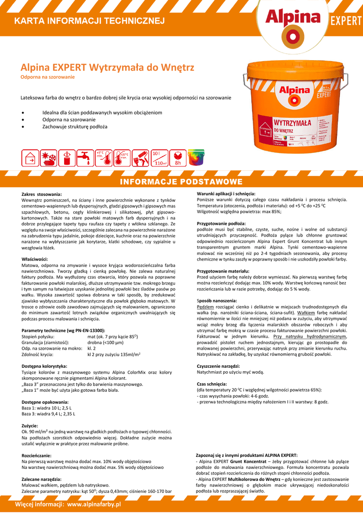 Alpina EXPERT Wytrzymała do Wnętrz Odporna na szorowanie Lateksowa farba do wnętrz o bardzo dobrej sile krycia oraz wysokiej odporności na szorowanie Idealna dla ścian poddawanych wysokim obciążeniom Odporna na szorowanie Zachowuje strukturę podłoża Zakres stosowania: Wewnątrz pomieszczeń, na ściany i inne powierzchnie wykonane z tynków cementowo-wapiennych lub dyspersyjnych, gładzi gipsowych i gipsowych mas szpachlowych, betonu, cegły klinkierowej i silikatowej, płyt gipsowokartonowych. Także na stare powłoki matowych farb dyspersyjnych i na dobrze przylegające tapety typu raufaza czy tapety z włókna szklanego. Ze względu na swoje właściwości, szczególnie zalecana na powierzchnie narażone na zabrudzenia typu jadalnie, pokoje dziecięce, kuchnie oraz na powierzchnie narażone na wybłyszczanie jak korytarze, klatki schodowe, czy sypialnie u wezgłowia łóżek. Właściwości: Matowa, odporna na zmywanie i wysoce kryjąca wodorozcieńczalna farba nawierzchniowa. Tworzy gładką i cienką powłokę. Nie zalewa naturalnej faktury podłoża. Ma wydłużony czas otwarcia, który pozwala na poprawne fakturowanie powłoki malarskiej, dłuższe utrzymywanie tzw. mokrego brzegu i tym samym na łatwiejsze uzyskanie jednolitej powłoki bez śladów pasów po wałku. Wysoka zawartość spoiwa dobrana w taki sposób, by zredukować zjawisko wybłyszczania charakterystyczne dla powłok głęboko matowych. W trosce o zdrowie osób zawodowo zajmujących się malowaniem, ograniczono do minimum zawartość lotnych związków organicznych uwalniających się podczas procesu malowania i schnięcia. Parametry techniczne (wg PN-EN-13300): Stopień połysku: mat (ok. 7 przy kącie 85O) Granulacja (ziarnistość): drobna (<100 μm) Odp. na szorowanie na mokro: kl. 2 Zdolność krycia: kl 2 przy zużyciu 135ml/m2 Dostępna kolorystyka: Tysiące kolorów z maszynowego systemu Alpina ColorMix oraz kolory skomponowane ręcznie pigmentami Alpina Kolorant. „Baza 3” przeznaczona jest tylko do barwienia maszynowego. „Baza 1” może być użyta jako gotowa farba biała. Dostępne opakowania: Baza 1: wiadra 10 L; 2,5 L Baza 3: wiadra 9,4 L; 2,35 L Warunki aplikacji i schnięcia: Poniższe warunki dotyczą całego czasu nakładania i procesu schnięcia. Temperatura (otoczenia, podłoża i materiału): od +5 0C do +25 0C Wilgotność względna powietrza: max 85%; Przygotowanie podłoża: podłoże musi być stabilne, czyste, suche, nośne i wolne od substancji utrudniających przyczepność. Podłoża pylące lub chłonne gruntować odpowiednio rozcieńczonym Alpina Expert Grunt Koncentrat lub innym transparentnym gruntem marki Alpina. Tynki cementowo-wapienne malować nie wcześniej niż po 2-4 tygodniach sezonowania, aby procesy chemiczne w tynku zaszły w poprawny sposób i nie uszkodziły powłoki farby. Przygotowanie materiału: Przed użyciem farbę należy dobrze wymieszać. Na pierwszą warstwę farbę można rozcieńczyć dodając max. 10% wody. Warstwę końcową nanosić bez rozcieńczania lub w razie potrzeby, dodając do 5 % wody. Sposób nanoszenia: Pędzlem rozciągać cienko i delikatnie w miejscach trudnodostępnych dla wałka (np. narożniki ściana-ściana, ściana-sufit). Wałkiem farbę nakładać równomiernie w ilości nie mniejszej niż podana w zużyciu, aby utrzymywać wciąż mokry brzeg dla łączenia malarskich obszarów roboczych i aby utrzymać farbę mokrą w czasie procesu fakturowanie powierzchni powłoki. Fakturować w jednym kierunku. Przy natrysku hydrodynamicznym, prowadzić pistolet ruchem jednostajnym, kierując go prostopadle do malowanej powierzchni, przerywając natrysk przy zmianie kierunku ruchu. Natryskiwać na zakładkę, by uzyskać równomierną grubość powłoki. Czyszczenie narzędzi: Natychmiast po użyciu myć wodą. Czas schnięcia: (dla temperatury 20 0C i względnej wilgotności powietrza 65%): - czas wysychania powłoki: 4-6 godz. - przerwa technologiczna między nałożeniem I i II warstwy: 8 godz. Zużycie: Ok. 90 ml/m² na jedną warstwę na gładkich podłożach o typowej chłonności. Na podłożach szorstkich odpowiednio więcej. Dokładne zużycie można ustalić wyłącznie w praktyce przez malowanie próbne. Rozcieńczanie: Na pierwszą warstwę można dodać max. 10% wody objętościowo Na warstwę nawierzchniową można dodać max. 5% wody objętościowo Zalecane narzędzia: Malować wałkiem, pędzlem lub natryskowo. Zalecane parametry natrysku: kąt 50O; dysza 0,43mm; ciśnienie 160-170 bar Zapoznaj się z innymi produktami ALPINA EXPERT: - Alpina EXPERT Grunt Koncentrat – żeby przygotować chłonne lub pylące podłoże do malowania nawierzchniowego. Formuła koncentratu pozwala dobrać stopień rozcieńczenia do różnych stopni chłonności podłoża. - Alpina EXPERT Multikolorowa do Wnętrz – gdy konieczne jest zastosowanie farby nawierzchniowej o głębokim macie ukrywającej niedoskonałości podłoża lub rozpraszającej światło. Tynki cementowe i cementowo-wapienne: Nowe tynki lub szpachlówki - sezonować minimum 2-4 tygodnie (zależnie od grubości warstwy) - zagruntować Alpina EXPERT Grunt Koncentratem rozcieńczonym 1:5 wodą Stare tynki porowate, chłonne, lekko piaszczące: - ubytki i uszkodzenia wypełnić odpowiednim materiałem i poczekać aż zwiążą - całość zagrunt. Alpina EXPERT Grunt Koncentratem rozcieńczonym 1:5 wodą Beton (surowy): Zanieczyszczenia lub mleczko cementowe oczyścić mechanicznie lub wodą pod ciśnieniem. Nowy beton sezonować min. 4 tygodnie. - zagruntować Alpina EXPERT Grunt Koncentratem rozcieńczonym 1:4 wodą Gładź gipsowa: Odpylić po szlifowaniu. Zwarta i nie pyląca, silnie chłonna: - zagruntować Alpina EXPERT Grunt Koncentratem rozcieńczonym 1:7 wodą Bardzo silnie chłonna, lekko pyląca - zagruntować Alpina EXPERT Grunt Koncentratem rozcieńczonym 1:9 wodą Płyta GK: Zależnie od chłonności materiału użytego do szpachlowania uszkodzeń i ł