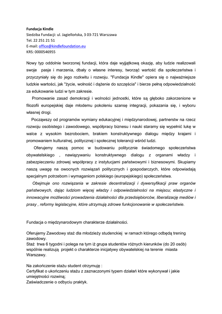 Fundacja Kindle Siedziba Fundacji: ul. Jagiellońska, 3 03-721 Warszawa Tel. 22 251 21 51 E-mail: [email protected] KRS: 0000546955 Nowy typ oddolnie tworzonej fundacji, która daje wyjjątkową okazję, aby ludzie realizowali swoje pasje i marzenia, dbały o własne interesy, tworząć wartość dla społeczeństwa i przyczyniały się do jego rozkwitu i rozwoju. "Fundacja Kindle" opiera się o najważniejsze ludzkie wartości, jak "życie, wolność i dążenie do szczęścia" i bierze pełną odpowiedzialność za edukowanie ludzi w tym zakresie. Promowanie zasad demokracji i wolności jednostki, które są głęboko zakorzenione w filozofii europejskiej daje młodemu pokoleniu szansę integracji, pokazania się, i wyboru własnej drogi. Począwszy od programów wymiany edukacyjnej i międzynarodowej, partnerstw na rzecz rozwoju osobistego i zawodowego, współpracy biznesu i nauki staramy się wypełnić lukę w walce z wysokim bezrobociem, brakiem konstruktywnego dialogu między krajami i promowaniem kulturalnej, politycznej i społecznej tolerancji wśród ludzi. Oferujemy naszą pomoc w budowaniu politycznie świadomego społeczeństwa obywatelskiego , nawiązywaniu konstruktywnego dialogu z organami władzy i zabezpieczeniu zdrowej współpracy z instytucjami państwowymi i biznesowymi. Skupiamy naszą uwagę na owocnych rozwiązań politycznych i gospodarczych, które odpowiadają specjalnym potrzebom i wymaganiom polskiego (europejskiego) społeczeństwa. Obejmuje ono rozwiązania w zakresie decentralizacji i dywersyfikacji praw organów państwowych, dając ludziom więcej władzy i odpowiedzialności na miejscu; elastyczne i innowacyjne możliwości prowadzenia działalności dla przedsiębiorców, liberalizację mediów i prasy , reformy legislacyjne, które utrzymują zdrowe funkcjonowanie w społeczeństwie. Fundacja o międzynarodowym charakterze działalności. Oferujemy Zawodowy staż dla młodzieży studenckiej w ramach którego odbędą trening zawodowy. Staż trwa 6 tygodni i polega na tym iż grupa studentów różnych kierunków (do 20 osób) wspólnie realizują projekt o charakterze inicjatywy obywatelskiej na terenie miasta Warszawy. Na zakończenie stażu student otrzymuję : Certyfikat o ukończeniu stażu z zaznaczonymi typem działań które wykonywał i jakie umiejętności rozwiną; Zaświadczenie o odbyciu praktyk. Staż jest nieodpłatny Harmonogram stażu: Uwzględniając odpowiedzi studenta w ankiecie zgłoszeniowej, jakie umiejętności chce rozwinąć, zostanie opracowany indywidualny plan działań dla każdego studenta. Ramowy zakres obowiązków z zakresu: administracji, marketingu, zarzadzania, stosunków międzynarodowych, relacji interpersonalnych, time managementu: - pisanie listów, e-maili - systematyzacja dokumentów - planowanie strategiczne -- napisanie projektów - zaplanowanie budżetu - napisanie sprawozdania - poszukiwanie, systematyzacja, analiza informacji - prowadzenie negocjacji z urzędami i innymi placówkami - tłumaczenie tekstów z języków obcych - opracowanie materiałów promocyjnych - prowadzenie negocjacji - pełnienie funkcji moderatora - SMM management - organizacja pracy zespołu - tworzenie wideo/foto materiałów - pełnienie funkcja opiekuna dla studentów obcokrajowców - prowadzenie negocjacji Przez 6 tygodni student 5 dni w tygodniu jest zaangażowany w realizacje projektu , codziennie 4 god. (10.00-14.00 albo 14.00-18.00) Staż obejmuje rozwój umiejętności miękkich w życiu zawodowym jak i osobistym. W ramach fundacji student pozyska kompetencje zawodowe niezbędne do funkcjonowania na rynku pracy. Ze względu na codzienny trening oraz pracę z coachem otrzyma pakiet kwalifikacji przydatnych w docelowym zawodzie. Fundacja gwarantuje rozwój umiejętności w : - budowaniu marketingu - sprzedaży - kształtowaniu relacji międzykulturowych - zdobywaniu wiedzy miedzynarodowej i komunikacji - ćwiczeniu umiejętności liderskich - szkoleniu językowym, practis wybranego języka - budowaniu wizerunku na menagera, time-menagement - organizacja eventów - realizacja własnych projektów,pomysłów - ćwiczenie występów publicznych - treningi z programów komputerowych - zasady promowania - organizacja pracy w biurze - praca nad własną świadomością - nawiązywanie lepszych relacji i sprawna komunikacja zawodowa Wymagania do kandydata: Student ( nie ma znaczenia rok, dzienne czy zaoczne studia) Absolwent uczelni wyższych do 30 lat. Warunki zatrudnienia: Osoba chętna musi wypełnić ankietę zgłoszeniową, zaakceptować warunki stażu