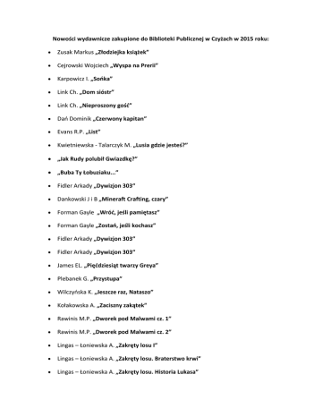 Nowości wydawnicze zakupione do Biblioteki Publicznej w Czyżach w 2015 roku: • Zusak Markus „Złodziejka książek” • Cejrowski Wojciech „Wyspa na Prerii” • Karpowicz I. „Sońka” • Link Ch. „Dom sióstr” • Link Ch. „Nieproszony gość” • Dań Dominik „Czerwony kapitan” • Evans R.P. „List” • Kwietniewska - Talarczyk M. „Lusia gdzie jesteś?” • „Jak Rudy polubił Gwiazdkę?” • „Buba Ty Łobuziaku...” • Fidler Arkady „Dywizjon 303” • Dankowski J i B „Mineraft Crafting, czary” • Forman Gayle „Wróć, jeśli pamiętasz” • Forman Gayle „Zostań, jeśli kochasz” • Fidler Arkady „Dywizjon 303” • Fidler Arkady „Dywizjon 303” • James EL. „Pięćdziesiąt twarzy Greya” • Plebanek G. „Przystupa” • Wilczyńska K. „Jeszcze raz, Nataszo” • Kołakowska A. „Zaciszny zakątek” • Rawinis M.P. „Dworek pod Malwami cz. 1” • Rawinis M.P. „Dworek pod Malwami cz. 2” • Lingas – Łoniewska A. „Zakręty losu I” • Lingas – Łoniewska A. „Zakręty losu. Braterstwo krwi” • Lingas – Łoniewska A. „Zakręty losu. Historia Lukasa” • Cygler H. „Złodziejki czasu” • Kowalewska H „Tam gdzie nie sięga już cień” • Hoover C. „Hopetess” • Michalak K. „Zachcianek” • Bonda K. „Okularnik” • Michalak K „Nadzieja” • Bonda K „Pochłaniacz” • James E L. „Ciemniejsza strona Greya” • Sapkowski A. „Krew elfów” • Sapkowski A. „Miecz przeznaczenia” Zakup nowości „Zrealizowano ze środków finansowych Biblioteki Narodowej w ramach Narodowego Programu Rozwoju Czytelnictwa”: • Fabisińska L. „Córeczka” • Watała E. „Córka Stalina” • Sawicka M. „Dobrze, że jesteś” • Krawczyk A. „Dolina mgieł i róż” • Bulicz - Kasprzyk K. „Dom na skraju” • Mirek K. „Francuska opowieść” • Moffeis G. „Aloes i właściwości i…” • Moffeis G.”Cytryna właściwości” • Górnicka J. „Wybieram zdrowie” • Górnicka J. „Ziołowe ABC” • Piotrowski P „Kod Himmlera” • Błaszczyk E. „Lubię żyć” • Krawczyk A „Magiczne miejsce” • Drozdowski J.K. „Meandry wojny” • Misiołek K. „Niekochane” • Kozłowska U. „Ortografia jest” • Majewski G „Piekło odzyskane” • Lackberg C. „Pogromca lwów” • Polscy poeci dzieciom „Podstępny Mruczuś” • Rybałtowska B.”Szkoła pod baobabem” • Rybałtowska B. „Koło graniaste” • Rybałtowska B. „Mea culpa” • Rybałtowska B. „Czas darowany nam” • Rybałtowska B „Jak to się skończy” • Wilczyńska K. „Zaplatana miłość” • Bulicz – Kasprzak K. „Szlachetne pobudki” • Lingas – Łoniewska A. „Szukaj mnie wśród lawendy. Zuzanna” • Lingas – Łoniewska A. „Szukaj mnie wśród lawendy. Zofia” • Lingas – Łoniewska A. „Szukaj mnie wśród lawendy. Gabriela” • Stenka B. „Tatax i inne historyjki” • Bykow D. „Uniewinnienie” • Bachot J. „Urządzamy urodziny” • Lingas – Loniewska A. „W szpilkach od Mando” • Dębski R. „Wilki i orły” • „Zając Maurycy” • Michalak K. „Zmyślona” • Cameron G. „Zwykły człowiek” • Krajewski M. „Arena szczurów” • Steel D. „Country” • Eriksson K. „Czarne kłamstwa” • Walczak I. „Dom złudzeń. Iga” • Walczak I. „Dom złudzeń. Zosia” • Larsson Stieg „Dziewczyna, która igrała 2” • Watson C. „Dziewczyna, która przestała” • Valko T. „Miłość na bali” • Clark M. H. „Morderstwo Kopciuszka” • Larsson Stieg „Mężczyźni, którzy nienawidzą” • Kamińska A. „Simona opowieść o…” • Rettinger D. „Sokół” • Mirek K. „Szczęśliwy dom” • Kordel M. „Tajemnica bzów” • Kordel M. „Wymarzony dom” • Larsson Stieg „Zamek z piasku, który minął” • Kwiatkowska K. „Zbronia w szkarłacie” • Chotomska W. „Pięciopsiaczki” • Sugg Z. „Girl online” • Prokop M. „Jego wysokość Longin” • Smale H. „Geek Girl modelka z przypadku” • Green J. „Papierowe miasta” • Smale H. „Geek Girl japońska katastrofa” • Prokop M. „Longin tu byłem” • Wójcik E. „Na budowie” • Scooby – Doo! „Znikające jabłka” • Wójcik E. „Listonosz” • Wójcik E. „Ogrodnik” • Wójcik E. „Poznaję świat” • Wójcik E. „Wyprawa do lasu” • Samojlik T. „Powrót rzęsorka” • Samojlik T. „Ostatni żubr” • Szewczyk M. „Ada i Adam na wsi” • Androsiuk M. „Krzyżyk” • Aleksijewicz S. „Wojna nie ma w sobie nic…” • Aleksijewicz S. „Ostatni świadkowie” • Boehme J. „Zuzia świętuje urodziny” • Tyszka A. „Smażone tablety” • Duszyńska J. „Cudaczek – wyśmiewaczek” W 2015 roku zakupiono 115 woluminów na kwotę 2864,41 zł, z czego 78 wol. na kwotę 1800 zł zakupiono ze środków finansowych Biblioteki Narodowej z programu ,,Zakup nowości wydawniczych do bibliotek ".