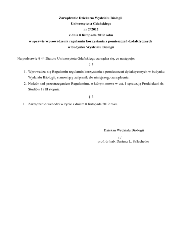 Zarządzenie Dziekana Wydziału Biologii Uniwersytetu Gdańskiego nr 2/2012 z dnia 8 listopada 2012 roku w sprawie wprowadzenia regulamin korzystania z pomieszczeń dydaktycznych w budynku Wydziału Biologii Na podstawie § 44 Statutu Uniwersytetu Gdańskiego zarządza się, co następuje: §1 1. Wprowadza się Regulamin regulamin korzystania z pomieszczeń dydaktycznych w budynku Wydziału Biologii, stanowiący załącznik do niniejszego zarządzenia. 2. Nadzór nad przestrzeganiem Regulaminu, o którym mowa w ust. 1 sprawują Prodziekani ds. Studiów I i II stopnia. §3 1. Zarządzenie wchodzi w życie z dniem 8 listopada 2012 roku. Dziekan Wydziału Biologii /-/ prof. dr hab. Dariusz L. Szlachetko Załącznik do Zarzdzenia Dziekana Wydziału Biologii nr 2/2012 Regulamin korzystania z pomieszczeń dydaktycznych w budynku Wydziału Biologii 1. Regulamin dotyczy sal dydaktycznych przeznaczonych do prowadzenia określonego rodzaju zajęć ze studentami I i II stopnia studiów kierunków administrowanych lub współprowadzonych przez Wydział Biologii. 2. Sprzęt dydaktyczny będący na sali znajduje się na stanie danej katedry. 3. Udostępnienie sali do zajęć dydaktycznych oznacza udostępnienie całego sprzętu, który znajduje sie w sali oraz wszystkich szafek. 4. Naprawa i serwis sprzętu pokrywana jest proporcjonalnie do czasu korzystania z sali przez katedry, ktore prowadzą w niej zajęcia dydaktyczne. 5. Opiekę nad salą dydaktyczną sprawuje osoba wskazana przez kierownika katedry. 6. Do obowiązków osoby sprawującej opiekę nad salą należy sprawdzanie porządku w sali oraz stanu znajdującego się w niej sprzętu po każdych, zakończonych zajęciach dydaktycznych. 7. O wszelkich nieprawidłowościach opiekun sali informuje bezzwłocznie kierownika katedry. 8. Osoba prowadząca zajęcia w sali dydaktycznej ponosi odpowiedzialność za znajdujący się w niej sprzęt. 9. W razie stwierdzenia nieprawidłowości w funkjconowaniu sprzętu prowadzący powinien zgłosić ten fakt opiekunowi sali. 10. Prowadzący zajęcia jest zobowiązany pozostawić salę dydaktyczną w takim stanie, w jakim ją zastał przed rozpocząciem zajęć. 11. Plan wykorzystania sal dydaktycznych na dany semestr przygotowuje dziekan. Dziekan Wydziału Biologii /-/ prof. dr hab. Dariusz L. Szlachetko