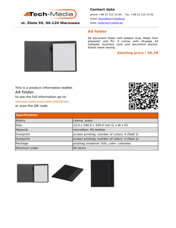 Contact data phone +48 22 122 13 00 , fax. +48 22 122 13 01 email: [email protected] st. Złota 59, 00-120 Warszawa www: www.tech-media.eu A4 folder A4 document folder with ballpen loop. Made from polyester and PU. It comes with 20-page A4 notepad, business card and document pocket. Elastic band closing. Starting price : $6.28 This is a product information leaflet: A4 folder, to see the full information go to: www.tech-media.eu/a4,folder,030269.html or scan the QR code. Specification Kolory czarny, szary Size 13.0 x 240.0 x 320.0 mm (L x W x H) Material microfiber, PU leather Overprint screen printing, number of colors: 4 (field 1) Overprint screen printing, number of colors: 4 (field 2) Package polybag (material: foil), color: colorless Minimum order 50 items