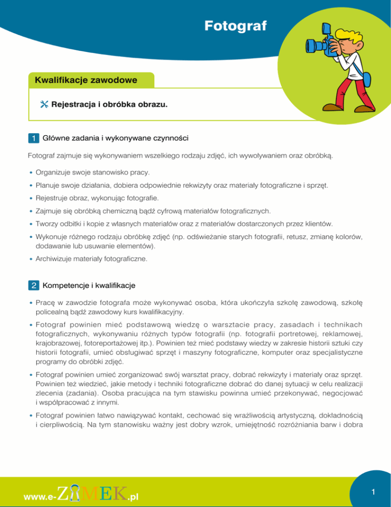 Fotograf Kwalifikacje zawodowe Rejestracja i obróbka obrazu. 1 Główne zadania i wykonywane czynności Fotograf zajmuje się wykonywaniem wszelkiego rodzaju zdjęć, ich wywoływaniem oraz obróbką. Organizuje swoje stanowisko pracy. Planuje swoje działania, dobiera odpowiednie rekwizyty oraz materiały fotograficzne i sprzęt. Rejestruje obraz, wykonując fotografie. Zajmuje się obróbką chemiczną bądź cyfrową materiałów fotograficznych. Tworzy odbitki i kopie z własnych materiałów oraz z materiałów dostarczonych przez klientów. Wykonuje różnego rodzaju obróbkę zdjęć (np. odświeżanie starych fotografii, retusz, zmianę kolorów, dodawanie lub usuwanie elementów). Archiwizuje materiały fotograficzne. 2 Kompetencje i kwalifikacje Pracę w zawodzie fotografa może wykonywać osoba, która ukończyła szkołę zawodową, szkołę policealną bądź zawodowy kurs kwalifikacyjny. Fotograf powinien mieć podstawową wiedzę o warsztacie pracy, zasadach i technikach fotograficznych, wykonywaniu różnych typów fotografii (np. fotografii portretowej, reklamowej, krajobrazowej, fotoreportażowej itp.). Powinien też mieć podstawy wiedzy w zakresie historii sztuki czy historii fotografii, umieć obsługiwać sprzęt i maszyny fotograficzne, komputer oraz specjalistyczne programy do obróbki zdjęć. Fotograf powinien umieć zorganizować swój warsztat pracy, dobrać rekwizyty i materiały oraz sprzęt. Powinien też wiedzieć, jakie metody i techniki fotograficzne dobrać do danej sytuacji w celu realizacji zlecenia (zadania). Osoba pracująca na tym stawisku powinna umieć przekonywać, negocjować i współpracować z innymi. Fotograf powinien łatwo nawiązywać kontakt, cechować się wrażliwością artystyczną, dokładnością i cierpliwością. Na tym stanowisku ważny jest dobry wzrok, umiejętność rozróżniania barw i dobra 1 koordynacja wzrokowo-ruchowa. Fotograf powinien być dokładny, spostrzegawczy i skoncentrowany na danej czynności oraz jednocześnie mieć podzielną uwagę. Powinien być osobą otwartą, pomocną. 3 Środowisko i charakter pracy Fotograf może pracować w różnych warunkach atmosferycznych i w różnych miejscach w pomieszczeniach (np. w zakładzie fotograficznym, prywatnym mieszkaniu, kościele) lub na otwartej przestrzeni (np. na ulicy, w lesie, na łące), a także w nietypowych miejscach i sytuacjach (np. w wodzie, w powietrzu, pod ziemią). Fotograf zwykle pracuje indywidualnie, rzadziej w zespole. Praca wymaga kontaktów z ludźmi. Godziny pracy na tym stanowisku zazwyczaj nie są stałe, z wyjątkiem pracy w punkcie fotograficznym bądź zakładzie, fotograf może pracować także w dni ustawowo wolne. Osoba pracująca w tym zawodzie jest narażona na działanie szkodliwych substancji chemicznych (odczynników) oraz promieniowania elektromagnetycznego. 2