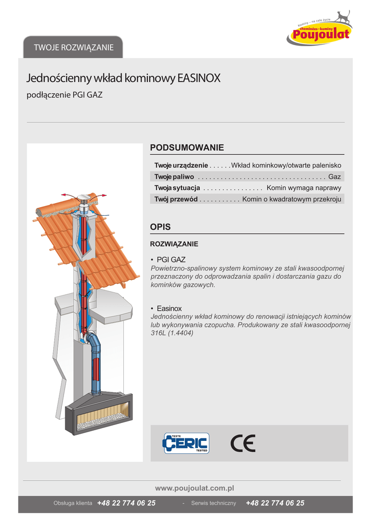 TWOJE ROZWIĄZANIE Jednościenny wkład kominowy EASINOX podłączenie PGI GAZ PODSUMOWANIE Twoje urządzenie . . . . . . Wkład kominkowy/otwarte palenisko Twoje paliwo . . . . . . . . . . . . . . . . . . . . . . . . . . . . . . . . . . Gaz Twoja sytuacja . . . . . . . . . . . . . . . . Komin wymaga naprawy Twój przewód . . . . . . . . . . . Komin o kwadratowym przekroju OPIS ROZWIĄZANIE • PGI GAZ Powietrzno-spalinowy system kominowy ze stali kwasoodpornej przeznaczony do odprowadzania spalin i dostarczania gazu do kominków gazowych. • Easinox Jednościenny wkład kominowy do renowacji istniejących kominów lub wykonywania czopucha. Produkowany ze stali kwasoodpornej 316L (1.4404) www.poujoulat.com.pl Obsługa klienta +48 22 774 06 25 - Serwis techniczny +48 22 774 06 25