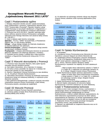 Szczegółowe Warunki Promocji „Lojalnościowy Abonent 2011 LATO” Część I Postanowienia ogólne 1. Niniejszy dokument określa warunki i zasady korzystania przez uŜytkowników z promocji „Lojalnościowy Abonent 2011 LATO” (zwanej dalej „Promocją”). Operator świadczy usługi objęte Promocją na warunkach określonych w Regulaminie, z uwzględnieniem zasad określonych niniejszym dokumentem. 2. Promocja trwa od 01.05.2011r. Operator zastrzega sobie prawo odmowy zawarcia Umowy Promocyjnej w przypadku zgłoszenia przez Nowego Abonenta woli zawarcia takiej Umowy po 1.08.2011 r. 3. UŜyte w dalszej części terminy oznaczają: Operator – P.P.H.U. “KARO” Krzysztof Bula, ul Powstańców Śląskich 26A, 47-100 Strzelce Opolskie. Usługa – usługa stałego dostępu do Internetu świadczona na łączach kablowych lub radiowych. Umowa Promocyjna – Umowa o świadczenie Usługi zawarta na warunkach niniejszej Promocji Przyłączenie – inicjacja administracyjno-sieciowa na serwerach głównych Operatora (nie obejmuje dzierŜawy i montaŜu) 4. Pozostałe terminy pisane z wielkiej litery mają znaczenie określone w Regulaminie Świadczenia Usług przez P.P.H.U. "KARO". Część II Warunki skorzystania z Promocji 1. Z Promocji moŜe skorzystać Abonent, który spełni łącznie wszystkie warunki określone poniŜej: a). Jest stałym Abonentem, od co najmniej 12 miesięcy. b). Do końca umowy pozostało nie więcej niŜ 3 miesięcy lub umowa jest zawarta na czas nieokreślony. c). Zawrze z Operatorem Umowę Promocyjną na czas określony 12, 24, 36 pełnych Okresów Rozliczeniowych. d). Warunkiem skorzystania z Promocji są moŜliwości techniczne świadczenia Usługi we wskazanej lokalizacji, w wybranym przez Abonenta wariancie. 2. Brak spełnienia któregokolwiek z podanych powyŜej warunków uniemoŜliwia zawarcie Umowy Promocyjnej, a jeśli Umowę Promocyjną zawarto, powoduje jej wygaśnięcie. 1. W ramach niniejszej Promocji Operator gwarantuje: a). obniŜoną opłatę za kaŜdy Okres Rozliczeniowy zgodnie z poniŜszą tabelą (ceny brutto): TABELA 1 Umowa na 12 Okresów Rozliczeniowych Umowa na 24 Okresy Rozliczeniowe Umowa na 36 Okresów Rozliczeniowych Opłata za kaŜdy Okres Rozliczeniowy Opłata za kaŜdy Okres Rozliczeniowy Opłata za kaŜdy Okres Rozliczeniowy A 1024kb/s TABELA 2 WARIANT USŁUGI Umowa na 12 Okresów Rozliczeniowych Umowa na 24 Okresy Rozliczeniowe Umowa na 36 Okresów Rozliczeniowych Rabat za kaŜdy Okres Rozliczeniowy Rabat za kaŜdy Okres Rozliczeniowy Rabat za kaŜdy Okres Rozliczeniowy A 1024kb/s B 3072kb/s C 6144kb/s 43 zł 99 zł 118 zł 53 zł 109 zł 128 zł 63 zł 119 zł 134 zł Część IV Opłata Wyrównawcza 1. W przypadku: a). rozwiązania Umowy Promocyjnej przez Abonenta lub przez Operatora z przyczyn leŜących po stronie Abonenta lub b). wygaśnięcia Umowy Promocyjnej z przyczyn określonych w § 7 ust. 8 b) Regulaminu Świadczenia Usług przez P.P.H.U. "KARO" przed upływem wskazanego w Części II, ust. 1, pkt c). okresu, Abonent zostanie obciąŜony Opłatą Wyrównawczą w wysokości nie większej niŜ suma udzielonych rabatów: - rabat za kaŜdy okres rozliczeniowy opisany w Tabeli nr 2 w Części III, w zaleŜności od wybranego wariantu (A, B, C) Usługi i długości trwania Umowy Promocyjnej. 2. Opłata Wyrównawcza będzie obniŜona odpowiednio o kwotę: -rabatu za kaŜdy pełny Okres Rozliczeniowy korzystania z Usługi opisany w Tabeli nr 2 w Części III, w zaleŜności od wybranego wariantu Usługi i długości trwania Umowy Promocyjnej. 3. Opłata Wyrównawcza nie podlega podatkowi VAT. 4. Abonent będzie zobowiązany do uiszczenia Opłaty Wyrównawczej w terminie wskazanym na nocie debetowej. Część V Postanowienia końcowe Część III Warunki Promocji WARIANT USŁUGI b). W zaleŜności od wybranego wariantu Usługi oraz długości trwania Umowy udzielone zniŜki wynoszą odpowiednio (ceny brutto): B 3072kb/s C 6144kb/s 50 zł 55 zł 76 zł 40 zł 45 zł 66 zł 30 zł 35 zł 60 zł 1. KaŜda ze stron moŜe rozwiązać Umowę z zachowaniem 1miesięcznego okresu wypowiedzenia ze skutkiem na koniec Okresu Rozliczeniowego następującego po Okresie Rozliczeniowym, w którym zostało dokonane wypowiedzenie. Za dzień dokonania wypowiedzenia przyjmuje się dzień wpływu wypowiedzenia do Operatora. W okresie wypowiedzenia Usługa świadczona jest na zasadach Umowy do daty jej rozwiązania. 2. Podpisanie Umowy Promocyjnej powoduje rozwiązanie poprzedniej Umowy, jaką posiadał Abonent. 3. Operator nie odpowiada za urządzenia Abonenta oraz za ich poprawne działanie.