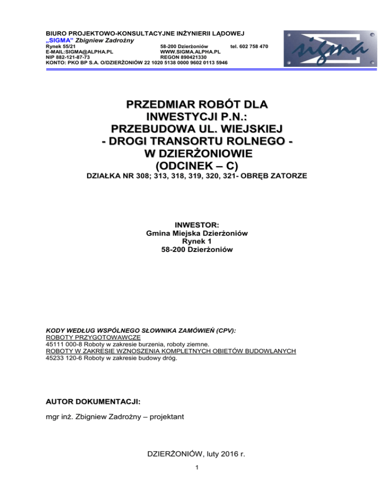 BIURO PROJEKTOWO-KONSULTACYJNE INŻYNIERII LĄDOWEJ „SIGMA” Zbigniew Zadrożny Rynek 55/21 58-200 Dzierżoniów tel. 602 758 470 E-MAIL:[email protected] WWW.SIGMA.ALPHA.PL NIP 882-121-87-73 REGON 890421330 KONTO: PKO BP S.A. O/DZIERŻONIÓW 22 1020 5138 0000 9602 0113 5946 PRZEDMIAR ROBÓT DLA INWESTYCJI P.N.: PRZEBUDOWA UL. WIEJSKIEJ - DROGI TRANSORTU ROLNEGO W DZIERŻONIOWIE (ODCINEK – C) DZIAŁKA NR 308; 313, 318, 319, 320, 321- OBRĘB ZATORZE INWESTOR: Gmina Miejska Dzierżoniów Rynek 1 58-200 Dzierżoniów KODY WEDŁUG WSPÓLNEGO SŁOWNIKA ZAMÓWIEŃ (CPV): ROBOTY PRZYGOTOWAWCZE 45111 000-8 Roboty w zakresie burzenia, roboty ziemne. ROBOTY W ZAKRESIE WZNOSZENIA KOMPLETNYCH OBIETÓW BUDOWLANYCH 45233 120-6 Roboty w zakresie budowy dróg. AUTOR DOKUMENTACJI: mgr inż. Zbigniew Zadrożny – projektant DZIERŻONIÓW, luty 2016 r. 1 1. OGÓLNA CHARAKTERYSTYKA OBIEKTU Przebudowywany ODCINEK „C” drogi transportu rolnego ma długość 191.50m. Szerokość drogi wynosi 3.50m i 3.00m. Szerokość jezdni na poszczególnych odcinkach jest następująca: • km 0+000.00 ÷ 0+084.15 b = 3.50m; • km 0+084.15 ÷ 0+191.51 b = 3.00m. Nawierzchnia drogi transportu rolnego wraz z elementami podbudowy wykonana jest w 2% spadku poprzecznym skierowanym w kierunku naturalnego spadku terenu. Odwodnienie nawierzchni jest typu powierzchniowego. W najniższym punkcie drogi (w km 0+084.16 – ODCINEK „C”) wykonany jest jednostronny ścieki z bruku kamiennego 9/11 ułożony na warstwie betonu B20 o gr. 10cm. Szerokość ścieku wynosi 50cm. Na długości przebudowanej drogi projektowany spadek podłużny dostosowany jest do istniejącego pochylenia podłużnego. Projektowany spadek podłużny zmienia się od 0.3% do 2.60%. Istniejąca podbudowa kamienno – żużlowa jest wyprofilowana i wyrównana na głębokość ~5÷10cm. W częściach skrajnych jezdni na szerokości 60cm, po obu jej stronach, wykonane jest wzmocnienie konstrukcji za pomocą warstwy gruntu stabilizowanego cementem o Rm=2.5MPa i grubości 20cm. Na wyprofilowanej istniejącej podbudowie i na warstwie stabilizacji ułożona jest warstwa geowłókniny np. TS50 (lub inna równoważna). Na warstwie geowłókniny ułożona jest warstwa wzmacniająca podbudowę wykonana z mieszanki tłuczniowej 0/31.5mm o gr. 15cm. Na nowej podbudowie ułożona jest warstwa wiążąca z betonu asfaltowego 0/16mm o gr. 4.0cm i warstwa ścieralna z betonu asfaltowego 0/12.8 o gr. 4.0cm. Po obu stronach drogi wykonane są pobocza gruntowe o szerokości 25-50cm i o spadku poprzecznym 8%. Pobocza wykonane są z kruszywa (mieszanka kamienna 0/31.5mm). Grubość warstwy tłucznia na poboczu wynosi 15cm. Na odcinku przebiegającym przez działkę nr 321 i 322 wykonana jest nowa konstrukcja jezdni. Szerokość jezdni na tym odcinku wynosi 3.50m. Zaprojektowana nowa konstrukcja nawierzchni drogi złożona jest z następujących elementów: km 0+000.00 ÷ 0+084.15 b = 3.50m. • podłoże gruntowe; • warstwa geowłókniny TS50 (lub innej równoważnej); • nasyp z pospółki; • warstwa gruntu stabilizowanego cementem Rm=2.5MPa – gr. 20cm; • podbudowa z kruszywa łamanego 0/31.5mm – gr. 25cm; • skropienie międzywarstwowe – emulsja bitumiczna 0.6kg/m2; • warstwa wiążąca z betonu asfaltowego 0/16mm – gr. 4.0cm; • skropienie międzywarstwowe – emujsja bitumiczna 0.6kg/m2; • warstwa ścieralna z betonu asfaltowego 0/12.8mm – gr. 4cm. km 0+084.15 ÷ 0+191.51 b = 3.00m. • istniejąca wyrównana podbudowa tłuczniowo – żużlowa; • warstwa geowłókniny TS50 (lub innej równoważnej); • warstwa gruntu stabilizowanego cementem Rm=2.5MPa – gr. 20cm (na poszerzeniach); • wyrównująca i wzmacniająca warstwa z kruszywa łamanego stabilizowanego mechanicznie 0/31.5mm – gr. 15.0cm; • skropienie międzywarstwowe – emulsja bitumiczna 0.6kg/m2; • warstwa wiążąca z betonu asfaltowego 0/16mm – gr. 4.0cm; • skropienie międzywarstwowe – emujsja bitumiczna 0.6kg/m2; • warstwa ścieralna z betonu asfaltowego 0/12.8mm – gr. 4cm. W istniejących przepustach wykonane są nowe żelbetowe ścianki czołowe. Nowe ścianki czołowe mają gr. 30cm i długość 5.00m. Ścianki czołowe posadowione są na ławach żelbetonowych (z betonu B30) o szerokości 60cm i grubości 30cm. Każda ława fundamentowa zbrojona jest za pomocą ośmiu żebrowanych prętów o średnicy 14mm (stal A-III) oraz za pomocą strzemion z prętów o średnicy 6mm (stal A-II) w rozstawie co 20cm. Ławy fundamentowe posadowione są 80cm poniżej poziomu dna rowu odwadniającego. Ścianki czołowe zbrojone są za pomocą dwóch warstw siatki zbrojeniowej z prętów żebrowanych o średnicy 12mm w rozstawie 15x15cm. Pionowe krawędzie ścianki zagłębione są w gruncie na gł. 1.00m w skarpę. Górna powierzchnia ścianek wyniesiona jest 10cm ponad poziom jezdni. Powierzchnie betonowe od strony gruntu zabezpieczone są za pomocą dwóch warstw izolacji bitumicznej. Do ścianek czołowych zamontowane są typowe stalowe balustrady o wysokości 1.10m z płaskowników (katalog typowych detali mostowych – symbol BAL3). Balustrady zabezpieczone są za pomocą cynkowania i antykorozyjnego zestawu malarskiego (podkład – grunt + dwie warstwy wierzchnie). Dno i skarpy rowu na wlocie i wylocie przepustu na długości 1.00m są umocnione. Umocnienie wykonane jest z bruku kamiennego 9/11 ułożonego na warstwie chudego betonu o gr. 10cm. Spoiny wypełnione są za pomocą zaprawy cementowej. W przepuście w km 0+002 wymieniona jest rura o śr. 600mm (l=~16m) na rurę z PE SN8 o średnicy 600mm. Podstawowe parametry techniczne drogi: • długość ODCINEK „C” lc=191.51 m; • szerokość b=3.00m, 3.50m; 2 PRZEDMIAR ROBÓT LP. 1 PRZEBUDOWA UL. WIEJSKIEJ - DROGI TRANSORTU ROLNEGO - W DZIERŻONIOWIE DZIAŁKA NR 308; 313, 318, 319, 320, 321, - OBRĘB ZATORZE Wyszczególnienie Jednostka Cena Pozycja Jednostko Wartość elementów wa rozliczeniowych Nazwa Ilość [