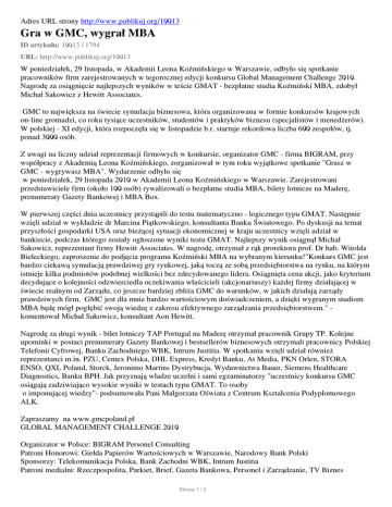 Adres URL strony http://www.publikuj.org/10013 Gra w GMC, wygrał MBA ID artykułu: 10013 / 1794 URL: http://www.publikuj.org/10013 W poniedziałek, 29 listopada, w Akademii Leona Koźmińskiego w Warszawie, odbyło się spotkanie pracowników firm zarejestrowanych w tegorocznej edycji konkursu Global Management Challenge 2010. Nagrodę za osiągnięcie najlepszych wyników w teście GMAT - bezpłatne studia Koźmiński MBA, zdobył Michał Sakowicz z Hewitt Associates. GMC to największa na świecie symulacja biznesowa, która organizowana w formie konkursów krajowych on-line gromadzi, co roku tysiące uczestników, studentów i praktyków biznesu (specjalistów i menedżerów). W polskiej - XI edycji, która rozpoczęła się w listopadzie b.r. startuje rekordowa liczba 600 zespołów, tj. ponad 3000 osób. Z uwagi na liczny udział reprezentacji firmowych w konkursie, organizator GMC - firma BIGRAM, przy współpracy z Akademią Leona Koźmińskiego, zorganizował w tym roku wyjątkowe spotkanie "Grasz w GMC - wygrywasz MBA". Wydarzenie odbyło się w poniedziałek, 29 listopada 2010 w Akademii Leona Koźmińskiego w Warszawie. Zarejestrowani przedstawiciele firm (około 100 osób) rywalizowali o bezpłatne studia MBA, bilety lotnicze na Maderę, prenumeraty Gazety Bankowej i MBA Box. W pierwszej części dnia uczestnicy przystąpili do testu matematyczno - logicznego typu GMAT. Następnie wzięli udział w wykładzie dr Marcina Piątkowskiego, konsultanta Banku Światowego. Po dyskusji na temat przyszłości gospodarki USA oraz bieżącej sytuacji ekonomicznej w kraju uczestnicy wzięli udział w bankiecie, podczas którego zostały ogłoszone wyniki testu GMAT. Najlepszy wynik osiągnął Michał Sakowicz, reprezentant firmy Hewitt Associates. W nagrodę, otrzymał z rąk prorektora prof. Dr hab. Witolda Bieleckiego, zaproszenie do podjęcia programu Koźmiński MBA na wybranym kierunku!"Konkurs GMC jest bardzo ciekawą symulacją prawdziwej gry rynkowej, jaką toczą ze sobą przedsiębiorstwa na rynku, na którym istnieje kilka podmiotów podobnej wielkości bez zdecydowanego lidera. Osiągnięta cena akcji, jako kryterium decydujące o kolejności odzwierciedla oczekiwania właścicieli (akcjonariuszy) każdej firmy działającej w świecie realnym od Zarządu, co jeszcze bardziej zbliża GMC do warunków, w jakich działają zarządy prawdziwych firm. GMC jest dla mnie bardzo wartościowym doświadczeniem, a dzięki wygranym studiom MBA będę mógł pogłębić swoją wiedzę z zakresu efektywnego zarządzania przedsiębiorstwem." komentował Michał Sakowicz, konsultant Aon Hewitt. Nagrodę za drugi wynik - bilet lotniczy TAP Portugal na Maderę otrzymał pracownik Grupy TP. Kolejne upominki w postaci prenumeraty Gazety Bankowej i bestsellerów biznesowych otrzymali pracownicy Polskiej Telefonii Cyfrowej, Banku Zachodniego WBK, Intrum Justitia. W spotkaniu wzięli udział również reprezentanci m.in. PZU, Cemex Polska, DHL Express, Kredyt Banku, At Media, PKN Orlen, STORA ENSO, QXL Poland, Storck, Jeronimo Martins Dystrybucja, Wydawnictwa Bauer, Siemens Healthcare Diagnostics, Banku BPH. Jak przyznają władze uczelni i sami egzaminatorzy "uczestnicy konkursu GMC osiągają zadziwiająco wysokie wyniki w testach typu GMAT. To osoby o imponującej wiedzy"- podsumowała Pani Małgorzata Oświata z Centrum Kształcenia Podyplomowego ALK. Zapraszamy na www.gmcpoland.pl GLOBAL MANAGEMENT CHALLENGE 2010 Organizator w Polsce: BIGRAM Personel Consulting Patroni Honorowi: Giełda Papierów Wartościowych w Warszawie, Narodowy Bank Polski Sponsorzy: Telekomunikacja Polska, Bank Zachodni WBK, Intrum Justitia Patroni medialni: Rzeczpospolita, Parkiet, Brief, Gazeta Bankowa, Personel i Zarządzanie, TV Biznes Strona 1 / 2 Patroni Internetowi: RP.PL, Bankier.pl, NBPortal.pl, qpracy.pl Współpraca: Brytyjsko-Polska Izba Handlowa, StepStone.pl Aktywacja: 09/12/10 11:52, odsłony: 356 Strona 2 / 2