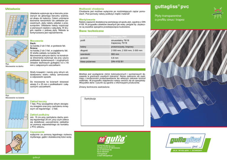 Układanie Układanie wykonuje się w kierunku przeciwnym do głównego kierunku wiatrów, od okapu do kalenicy. Celem uniknięcia docinania narożników lub zakładów poczwórnych, płyty należy układać z przesunięciem. Układanie należy rozpocząć w pierwszym rzędzie z całą płytą. W drugim rzędzie z połową płyty. Metoda ta kontynuowana jest naprzemiennie. Mocowanie Dach: na każdej 2 lub 3 fali, w grzbiecie fali. Ściana: na każdej 2 lub 3 fali, w zagłębieniu fali. W strefie zakładu na każdej fali. Mocowanie pokrycia dachu na konstrukcji drewnianej wykonuje się przy użyciu podkładek dystansowych i oryginalnych wkrętów dachowych guttagliss 4,5 x 45 mm z załączonymi uszczelkami. Rys. Mocowanie na dachu Strefy krawędzi i naroży przy silnym oddziaływaniu wiatru należy zamocować w odpowiedni sposób. Do mocowania na ścianach stosować wkręty 5 x 25 mm z podkładkami i załączonymi uszczelkami. Rys. Mocowanie na ścianie Zakład boczny Możliwość chodzenia guttagliss® pvc Wentylowanie Płyty transparentne o profilu sinus i trapez Chodzenie jest możliwe wyłącznie po rozdzielających ciężar pomostach. Pod pomosty należy podłożyć miękki materiał! Należy zapewnić dostateczną wentylację od spodu płyt, zgodnie z DIN 4108. W przypadku obiektów otwartych jak wiaty, pergole itp. zbyteczne są wszelkie specjalne przedsięwzięcia budowlane. Dane techniczne Dane techniczne Guttagliss PVC profil sinusoidalny 76/18 trapezowy 70/18 kolory przezroczysty, brązowy długość 2 000 mm; 2 500 mm; 3 000 mm szerokość 900 mm grubość 0,8 mm klasa pożarowa DIN 4102 B1 Możliwe jest wystąpienie różnic kolorystycznych i wymiarowych itp. zawarte w granicach zwykłych tolerancji. Nasze zalecenia nie zwalniają z konieczności przeprowadzenia we własnym zakresie kontroli materiału. W przypadku wątpliwości należy zwrócić się do specjalisty. Wszystkie dane i rysunki są zgodne z informacjami producenta. Zmiany techniczne zastrzeżone. Dystrybucja 1 fala. Przy szczególnie silnym obciążeniu śniegiem oraz przy nachyleniu mniejszym od regularnego - 2 fale. 15 cm Zakład podłużny min. 15 cm przy nachyleniu dachu poniżej regularnego 20 cm, przy czym zaleca się dodatkowe uszczelnienie zakładów za pomocą odpowiedniego do kontaktu z PVC silikonu. Czyszczenie wyłącznie za pomocą łagodnego roztworu mydlanego, gąbki i dostatecznej ilości wody. gutta.pl GUTTA POLSKA Sp. z o.o. ul. Fabryczna 9, 62-200 Gniezno tel. 61 428 20 64÷66 fax 61 428 20 67 www.gutta.pl e-mail: [email protected] Płyty transparentne o profilu sinus i trapez Materiał Wymagania Wraz z płytami profilowymi guttagliss z PVC dokonujecie Państwo dobrego wyboru w sytuacji, gdy szukacie korzystnego cenowo rozwiązania dla okładziny pergoli, balkonu, zadaszenia lub osłony i ochrony przed wzrokiem i wiatrem. Nachylenie dachu: regularne - powyżej 100 (co najmniej 70) Płyty są wytłaczane i posiadają gładką, zamkniętą powierzchnię. Płyty profilowe guttagliss posiadają wysoki stopień optycznej przejrzystości i przepuszczalności światła. Powierzchnie oparcia na łatach i ryglach należy pomalować trwale na biało lub okleić odblaskową folią aluminiową dla zapobiegania nagrzewaniu, mogącemu spowodować powstanie rys i odkształceń. Odczekać do dostatecznego wyschnięcia i wywietrzenia środków ochrony i impregnacyjnych drewna, mogących w przeciwnym wypadku spowodować odbarwienia. Odporność termiczna: stabilność termiczna do temperatury +600C. Konstrukcja nośna z łat drewnianych: 4 x 6 cm lub metalowa Celem zachowania trwałości płyt prosimy o przestrzeganie poniższych wskazówek, dotyczących ich układania. Gwarancja producenta nie obejmuje szkód powstałych w wyniku gradobicia. Szkody powstałe w wyniku gradobicia pokrywa ubezpieczyciel po zawarciu stosownej polisy. Zadaszenie tarasu Zadaszenie tarasu Rozstawy punktów podparcia maks. 50 cm przy grubości płyty 0,8 mm przy przeciętnych wartościach obciążenia śniegiem i wiatrem. Na obszarach o wysokich lub bardzo wysokich obciążeniach, rozstawy należy odpowiednio zmniejszyć. Dodatki do układania: Podkładka dystansowa Przygotowanie Podział / cięcie Wkręt 4,5 x 45mm z podkładką i kapturkiem Zadaszenie Zadaszenie Cięcie wykonywać przy zastosowaniu wysokoobrotowych pilarek ręcznych i stołowych, utwardzoną, nie rozwartą tarczą o drobnym uzębieniu. Zwracać uwagę na dobre ułożenie materiału i korzystanie z prowadnicy, celem uniknięcia powstawania uszkodzeń. Kalenica PVC Wiercenie Zalety • korzystne cenowo • wytrzymałość • klasa pożarowa B1 • dobre właściwości termiczne • wysoka przejrzystość • łatwość układania Zakres stosowania • tarasy • pergole • zadaszenia • okładziny ścian • pasy doświetlające • ... i Państwa pomysły gutta.pl Składowanie: Płyt nie należy przechowywać w pełnym słońcu. Przy składowaniu w stosach istnieje niebezpieczeństwo deformacji przy bezpośrednim oddziaływaniu promieni słonecznych. Płyty należy składować płasko i chronić przez zanieczyszczeniem i obciążeniem mechanicznym. Do przykrycia odpowiednia jest na przykład biała folia lub sztywny karton. gutta.pl W miarę możliwości należy stosować wiertło stożkowe, stopniowe lub w razie konieczności wiertło HSS o szlifie 600 do 900. Wykonać wiercenie próbne. W przypadku, gdy krawędzie otworów wykazują rysy, należy zmienić narzędzie. Rysy mogą powodować pękanie płyt. Uwaga! Wiercone otwory, odpowiednio do wielkości współczynnika rozszerzalności termicznej, powinny posiadać średnicę o około 4mm większą od średnicy rdzenia wkręta. gutta.pl