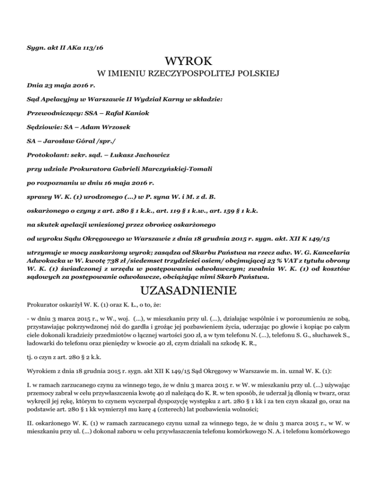 Sygn. akt II AKa 113/16 WYROK W IMIENIU RZECZYPOSPOLITEJ POLSKIEJ Dnia 23 maja 2016 r. Sąd Apelacyjny w Warszawie II Wydział Karny w składzie: Przewodniczący: SSA – Rafał Kaniok Sędziowie: SA – Adam Wrzosek SA – Jarosław Góral /spr./ Protokolant: sekr. sąd. – Łukasz Jachowicz przy udziale Prokuratora Gabrieli Marczyńskiej-Tomali po rozpoznaniu w dniu 16 maja 2016 r. sprawy W. K. (1) urodzonego (...) w P. syna W. i M. z d. B. oskarżonego o czyny z art. 280 § 1 k.k., art. 119 § 1 k.w., art. 159 § 1 k.k. na skutek apelacji wniesionej przez obrońcę oskarżonego od wyroku Sądu Okręgowego w Warszawie z dnia 18 grudnia 2015 r. sygn. akt. XII K 149/15 utrzymuje w mocy zaskarżony wyrok; zasądza od Skarbu Państwa na rzecz adw. W. G. Kancelaria Adwokacka w W. kwotę 738 zł /siedemset trzydzieści osiem/ obejmującej 23 % VAT z tytułu obrony W. K. (1) świadczonej z urzędu w postępowaniu odwoławczym; zwalnia W. K. (1) od kosztów sądowych za postępowanie odwoławcze, obciążając nimi Skarb Państwa. UZASADNIENIE Prokurator oskarżył W. K. (1) oraz K. Ł., o to, że: - w dniu 3 marca 2015 r., w W., woj. (...), w mieszkaniu przy ul. (...), działając wspólnie i w porozumieniu ze sobą, przystawiając pokrzywdzonej nóż do gardła i grożąc jej pozbawieniem życia, uderzając po głowie i kopiąc po całym ciele dokonali kradzieży przedmiotów o łącznej wartości 500 zł, a w tym telefonu N. (...), telefonu S. G., słuchawek S., ładowarki do telefonu oraz pieniędzy w kwocie 40 zł, czym działali na szkodę K. R., tj. o czyn z art. 280 § 2 k.k. Wyrokiem z dnia 18 grudnia 2015 r. sygn. akt XII K 149/15 Sąd Okręgowy w Warszawie m. in. uznał W. K. (1): I. w ramach zarzucanego czynu za winnego tego, że w dniu 3 marca 2015 r. w W. w mieszkaniu przy ul. (...) używając przemocy zabrał w celu przywłaszczenia kwotę 40 zł należącą do K. R. w ten sposób, że uderzał ją dłonią w twarz, oraz wykręcił jej rękę, którym to czynem wyczerpał dyspozycję występku z art. 280 § 1 kk i za ten czyn skazał go, oraz na podstawie art. 280 § 1 kk wymierzył mu karę 4 (czterech) lat pozbawienia wolności; II. oskarżonego W. K. (1) w ramach zarzucanego czynu uznał za winnego tego, że w dniu 3 marca 2015 r., w W. w mieszkaniu przy ul. (...) dokonał zaboru w celu przywłaszczenia telefonu komórkowego N. A. i telefonu komórkowego S.G., o łącznej wartości mniejszej niż 435 zł na szkodę K. R., którym to czynem wyczerpał dyspozycję wykroczenia z art. 119 § 1 k.k. i za ten czyn skazał go, oraz na podstawie art. 119 § 1 k.k. wymierzył mu karę 30 (trzydziestu) dni aresztu; III. oskarżonego W. K. (1) w ramach zarzucanego czynu uznał za winnego tego, że w dniu 3 marca 2015 r., w W. w mieszkaniu przy ul. (...), wspólnie i w porozumieniu z K. Ł. brał udział w pobiciu K. R. w ten sposób, że bił ją rękoma i kopał po całym ciele, przykładał nóż do gardła, groził pozbawieniem życia, za pomocą noża ściął część włosów z głowy oraz zrzucił w jej kierunku telewizor, czym naraził ją na bezpośrednie niebezpieczeństwo nastąpienia skutku określonego w art. 156 §1 k.k. lub w art. 157 §1 k.k., którym to czynem wyczerpał dyspozycję występku z art. 159 k.k. i za to skazał go, oraz na podstawie art. 159 k.k. wymierzył mu karę 4 (czterech) lat pozbawienia wolności; IV. na podstawie art. 85 §1 i 2 k.k. w zw. z art. 86 § 1 k.k. połączył kary pozbawienia wolności wymierzone w pkt I i III i wymierzył oskarżonemu W. K. (1) karę łączną 6 (sześciu) lat pozbawienia wolności. Powyższy wyrok zaskarżył obrońca oskarżonego, który na podstawie art. 427 § 1 k.p.k. w zw. z art. 438 pkt 2, 3 k.p.k. zarzucił: 1. obrazę przepisów postępowania w postaci art. 7 k.p.k., art. 410 k.p.k. w zw. z art. 5 § 2 k.p.k., która mogła mieć wpływ na treść orzeczenia, poprzez naruszenie zasad swobodnej oceny dowodów, poprzez przyznanie wiarygodności zeznaniom pokrzywdzonej K. R. złożonym na rozprawie w dniu 2.11.2015 r. oraz w toku postępowania przygotowawczego w dniu 4.03.2015 r. pomimo tego, że ww. zeznania diametralnie się od siebie różniły, a pokrzywdzona nie była w stanie wytłumaczyć tych rozbieżności, ani wskazać, która z wersji jej zeznań jest prawdziwa, co doprowadziło Sąd do błędu w ustaleniach faktycznych i przyjęcia, że oskarżony dopuścił się czynu zabronionego, podczas gdy ocena dowodów zgodna z zasadami logiki i doświadczenia życiowego winna prowadzić do wniosku, że zeznania pokrzywdzonej są niewiarygodne, ponieważ pokrzywdzona dotknięta poważnym przestępstwem powinna pamiętać okoliczności mu towarzyszące oraz wyjaśnić nieścisłości w swoich zeznaniach zwłaszcza, że pomiędzy jednymi a drugimi zeznaniami upłynęło jedynie 8 miesięcy; 2. obrazę przepisów postępowania w postaci art. 7 k.p.k., art. 410 k.p.k., art. 5 § 2 k.p.k., art. 5 § 1 k.p.k., która mogła mieć wpływ na treść orzeczenia, poprzez naruszenie zasad swobodnej oceny dowodów, poprzez z jednej strony uznanie, że jedynym bezpośrednim dowodem wskazującym na sprawstwo oskarżonych jest dowód z zeznań pokrzywdzonej, a jednocześnie stwierdzenie, że w jej zeznaniach występuje wiele rozbieżności, których nie udało się logicznie wyjaśnić, i w tej sytuacji niezastosowanie wobec oskarżonego zasady in dubio pro reo, ale dokonanie selekcji i wyboru odpowiednich fragmentów z obu wersji zeznań pokrzywdzonej, które dawały prawdopodobieństwo sprawstwa przez oskarżonego zarzucanych mu czynów, i na tej podstawie skazanie oskarżonego na karę 6 lat pozbawienia wolności, podczas gdy prawidłowe zastosowanie naruszonych przepisów winno prowadzić do wytłumaczenia niedających się usunąć wątpliwości na korzyść oskarżonego, poprzez uznanie za niewiarygodne zeznań pokrzywdzonej, a w konsekwencji wobec braku innych dowodów winy oskarżonego, do jego uniewinnienia; 3. obra