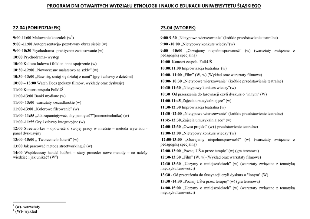 PROGRAM DNI OTWARTYCH WYDZIAŁU ETNOLOGII I NAUK O EDUKACJI UNIWERSYTETU ŚLĄSKIEGO 22.04 (PONIEDZIAŁEK) 23.04 (WTOREK) 9:00-11:00 Malowanie koszulek (w1) 9:00-9:30 „Nietypowe wierszowanie” (krótkie przedstawienie teatralne) 9:00 -11:00 Autoprezentacja- pozytywny obraz siebie (w) 9:00 -10:00 „Nietypowy konkurs wiedzy”(w) 9:00-10:30 Psychodrama- praktyczne zastosowanie (w) 10:00 Psychodrama- występ 9:00 -10:00 „Oswajamy niepełnosprawność” (w) (warsztaty związane z pedagogiką specjalną) 10:00 Kultura ludowa i folklor- inne spojrzenie (w) 10:00 Koncert zespołu FolkUŚ 10:30 -12:00 „Nowoczesne malarstwo na szkle” (w) 10:00:11:00 Improwizacja teatralna (w) 10:30 -13:00 „Baw się, śmiej się działaj z nami” (gry i zabawy z dziećmi) 10:00- 11:00 „Film” (W, w) (Wykład oraz warsztaty filmowe) 10:00 – 13:00 Watch Docs (pokazy filmów, wykłady oraz dyskusje) 10:00- 10:30 „Nietypowe wierszowanie” (krótkie przedstawienie teatralne) 11:00 Koncert zespołu FolkUŚ 10:30-11:30 „Nietypowy konkurs wiedzy”(w) 11:00-13:00 Bańki mydlane (w) 10:30 Od przerażenia do fascynacji czyli dyskurs o "innym" (W) 11:00- 13:00 warsztaty szczudlarskie (w) 11:00-11:45„Zajęcia umuzykalniające” (w) 11:00-13:00 „Kolorowe filcowanie” (w) 11:30-12:30 Improwizacja teatralna (w) 11:00- 11:55 „Jak zapamiętywać, aby pamiętać?”(mnemotechnika) (w) 11:30 -12:00 „Nietypowe wierszowanie” (krótkie przedstawienie teatralne) 11:00 -11:55 Gry i zabawy integracyjne (w) 11:45-12:30„Zajęcia umuzykalniające” (w) 12:00 Streetworker – opowieść o swojej pracy w mieście – metoda wywiadu panel dyskusyjny 12:00-12:30 „Owca projekt” (w) ( przedstawienie teatralne) 13:00 -15:00 „ Tworzenie biżuterii” (w) 12:00-13:00 „Oswajamy niepełnosprawność” (w) (warsztaty związane z pedagogiką specjalną) 13:00 Jak pracować metodą streetworkingu? (w) 14:00 Współczesny handel ludźmi – stary proceder nowe metody – co należy wiedzieć i jak unikać? (W2) 12:00-13:00 „Nietypowy konkurs wiedzy”(w) 12:00-13:00 „Poznaj UŚ-a przez terapię” (w) (gra terenowa) 12:30-13:30 „Film” (W, w) (Wykład oraz warsztaty filmowe) 12:30-13:30 „Uczymy o mniejszościach” (w) (warsztaty związane z tematyką międzykulturowości) 13:30 - Od przerażenia do fascynacji czyli dyskurs o "innym" (W) 13:30 -14:30 „Poznaj UŚ-a przez terapię” (w) (gra terenowa) 14:00-15:00 „Uczymy o mniejszościach” (w) (warsztaty związane z tematyką międzykulturowości) 1 2 (w)- warsztaty (W)- wykład