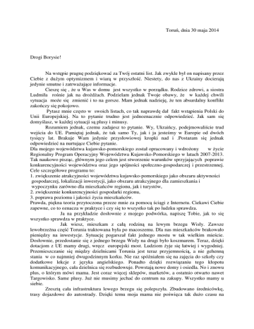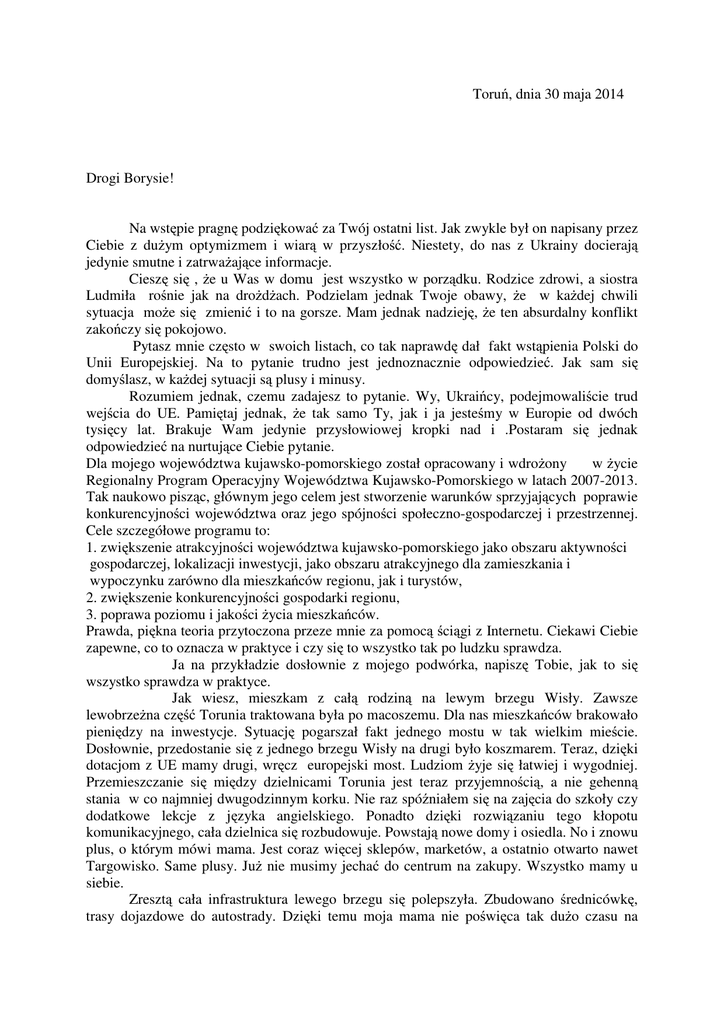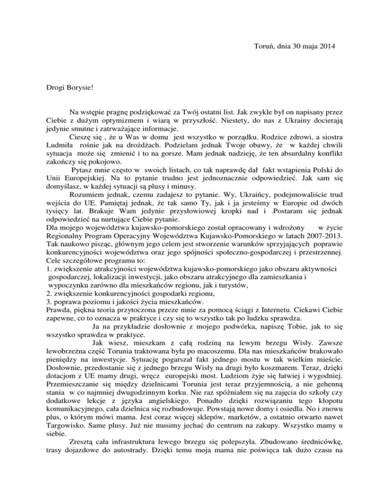 Toruń, dnia 30 maja 2014 Drogi Borysie! Na wstępie pragnę podziękować za Twój ostatni list. Jak zwykle był on napisany przez Ciebie z dużym optymizmem i wiarą w przyszłość. Niestety, do nas z Ukrainy docierają jedynie smutne i zatrważające informacje. Cieszę się , że u Was w domu jest wszystko w porządku. Rodzice zdrowi, a siostra Ludmiła rośnie jak na drożdżach. Podzielam jednak Twoje obawy, że w każdej chwili sytuacja może się zmienić i to na gorsze. Mam jednak nadzieję, że ten absurdalny konflikt zakończy się pokojowo. Pytasz mnie często w swoich listach, co tak naprawdę dał fakt wstąpienia Polski do Unii Europejskiej. Na to pytanie trudno jest jednoznacznie odpowiedzieć. Jak sam się domyślasz, w każdej sytuacji są plusy i minusy. Rozumiem jednak, czemu zadajesz to pytanie. Wy, Ukraińcy, podejmowaliście trud wejścia do UE. Pamiętaj jednak, że tak samo Ty, jak i ja jesteśmy w Europie od dwóch tysięcy lat. Brakuje Wam jedynie przysłowiowej kropki nad i .Postaram się jednak odpowiedzieć na nurtujące Ciebie pytanie. Dla mojego województwa kujawsko-pomorskiego został opracowany i wdrożony w życie Regionalny Program Operacyjny Województwa Kujawsko-Pomorskiego w latach 2007-2013. Tak naukowo pisząc, głównym jego celem jest stworzenie warunków sprzyjających poprawie konkurencyjności województwa oraz jego spójności społeczno-gospodarczej i przestrzennej. Cele szczegółowe programu to: 1. zwiększenie atrakcyjności województwa kujawsko-pomorskiego jako obszaru aktywności gospodarczej, lokalizacji inwestycji, jako obszaru atrakcyjnego dla zamieszkania i wypoczynku zarówno dla mieszkańców regionu, jak i turystów, 2. zwiększenie konkurencyjności gospodarki regionu, 3. poprawa poziomu i jakości życia mieszkańców. Prawda, piękna teoria przytoczona przeze mnie za pomocą ściągi z Internetu. Ciekawi Ciebie zapewne, co to oznacza w praktyce i czy się to wszystko tak po ludzku sprawdza. Ja na przykładzie dosłownie z mojego podwórka, napiszę Tobie, jak to się wszystko sprawdza w praktyce. Jak wiesz, mieszkam z całą rodziną na lewym brzegu Wisły. Zawsze lewobrzeżna część Torunia traktowana była po macoszemu. Dla nas mieszkańców brakowało pieniędzy na inwestycje. Sytuację pogarszał fakt jednego mostu w tak wielkim mieście. Dosłownie, przedostanie się z jednego brzegu Wisły na drugi było koszmarem. Teraz, dzięki dotacjom z UE mamy drugi, wręcz europejski most. Ludziom żyje się łatwiej i wygodniej. Przemieszczanie się między dzielnicami Torunia jest teraz przyjemnością, a nie gehenną stania w co najmniej dwugodzinnym korku. Nie raz spóźniałem się na zajęcia do szkoły czy dodatkowe lekcje z języka angielskiego. Ponadto dzięki rozwiązaniu tego kłopotu komunikacyjnego, cała dzielnica się rozbudowuje. Powstają nowe domy i osiedla. No i znowu plus, o którym mówi mama. Jest coraz więcej sklepów, marketów, a ostatnio otwarto nawet Targowisko. Same plusy. Już nie musimy jechać do centrum na zakupy. Wszystko mamy u siebie. Zresztą cała infrastruktura lewego brzegu się polepszyła. Zbudowano średnicówkę, trasy dojazdowe do autostrady. Dzięki temu moja mama nie poświęca tak dużo czasu na wyjazdy służbowe. Teraz wyjazd do Warszawy w dwie strony trwa około pięciu godzin, a nie, jak wcześniej, cały dzień . Drugi plus naszego bycia w UE to dofinansowania zakładów pracy. Jak sam wiesz mama pracuje w firmie prywatnej. Dla UE nie stanowi przeszkody, żeby wesprzeć finansowo nawet firmę prywatną . Firma w której pracuje mama, otrzymała dotację, z których zakupiono nowoczesny sprzęt produkcyjny, przeprowadzono remonty i zmieniono całe otoczenie zakładu. Wszystko to w rezultacie umożliwiło podniesienie jakości produkcji, zdobycie nowych kontrahentów, a przede wszystkim zatrudnienie nowych pracowników. Jak sam wiesz, nasza rodzina jest rodziną katolicką. Kościół, do którego chodzimy, to stary zabytkowy zespół klasztorny z XVII wieku. Niestety ,czas robi swoje i zabytek zaczął podupadać. Nigdy nie było na tyle pieniędzy, żeby przeprowadzić remont. Sam wiesz łaska pańska na pstrym koniu jedzie, a i hojność ludzi jest wątpliwa. Znowu na pomoc przyszły środki z UE i Jej Programu. Odnowiono ołtarze, zabytkowe organy, stacje Drogi Męki Pańskiej, a co dalej, to zobaczymy. Jest po prostu pięknie. Ostatni przykład z mojego podwórka, to fakt budowy w mojej dzielnicy Orlików. Orlik to zespoły sportowo-rekreacyjne. Można z nich korzystać za darmo. Często więc z kolegami gramy na profesjonalnych boiskach w piłkę nożną, w siatkówkę .Co więcej, uczę się grać w tenisa. Ja i moja siostra chodzimy do szkółki tenisowej. Więcej, razem z mamą rozgrywamy mecze tenisowe i to do późnych godzin wieczornych dzięki specjalnemu oświetleniu na korcie. Cieszę się na te wspólne chwile, bo w pogoni dnia codziennego mało mamy dla siebie czasu. Jak sam widzisz, same plusy naszego członkostwa w Unii Europejskie i to na moim przykładzie, a co dopiero w skali całej Polski. Teraz jak o wszystkim do Ciebie Borys napisałem sam widzę, jak dużo dobrego zrobiła dla mnie samego UE. Zrozumiałem Wasze dążenie do bycia w naszej wspólnocie. Dlatego, życzę Tobie wytrwałości w dążeniu do osiągnięcia celu. Jest to nadzieja na lepsze jutro, może już nie dla Twoich rodziców, ale dla Ciebie i Twojej małej siostry Ludmiły. Mam nadzieję, ze na tyle na ile umiem, byłem w stanie pokazać Tobie na czym polega nasza dziesięcioletnia przynależność do Unii Europejskiej. Chociaż tak naprawdę Europejczykiem jestem tak jak Ty od ponad dwóch tysięcy lat. Serdecznie pozdrawiam Michał Balewski P.S. Właśnie dowiedziałem się od mamy, że muszę oddać głos na kolejne inwestycje z UE dotyczące mojej dzielnicy, a jak sam wiesz Ona mi nie podaruje i dopnie swego żebym zagłosował na swoją przyszłość.