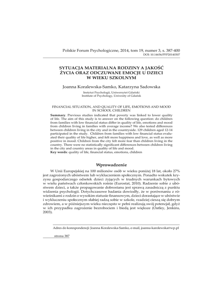 Polskie Forum Psychologiczne, 2014, tom 19, numer 3, s. 387-400 DZȱŗŖǯŗŚŜśŜȦŘŖŗŚŖřŖŝ ȱȱȱȱg)ȱ ȱȱȱȱȱȱ ȱȱ Joanna Koralewska-Samko, Katarzyna Sadowska ¢ȱ¢ǰȱ ¢ȱÚ ȱȱ¢¢ǰȱ¢ȱȱÚ FINANCIAL SITUATION, AND QUALITY OF LIFE, EMOTIONS AND MOOD IN SCHOOL CHILDREN ¢. Previous studies indicated that poverty was linked to lower quality ȱǯȱȱȱȱȱ¢ȱȱȱ ȱȱȱ ȱDZȱȱȱ ȱȱ ȱ ȱęȱȱěȱȱ¢ȱȱǰȱȱȱȱ ȱȱȱȱȱ ȱȱǵȱȱȱȱěȱ between children living in the city and in the countryside. 129 children aged 12-14 ȱȱȱ¢ǯȱȱȱȱȱ ȱ ȱęȱȱated their quality of life higher, and felt more happiness and love, as well as more positive in mood. Children from the city felt more fear than children living in the ¢ǯȱȱ ȱȱ¢ȱęȱěȱ ȱȱȱ in the city and country areas in quality of life and mood. ¢ȱ DZȱ¢ȱȱǰȱęȱǰȱǰȱ £ ȱȱȱȱŗŖŖȱà ȱàȱ ȱ ȱČȱŗŞȱǰȱÙȱŘŝƖȱ ȱ£Č¢ȱà ȱȱ ¢£ȱÙ£¢ǯȱȱ ȱ¢£¢ȱ £ȱ ȱ £ȱ Č¢¢ȱ ȱ ¢ȱ ȱ ¢ ¢ȱ ȱ ȱÚ ȱ£Ù ȱïȱǻǰȱŘŖŗŖǼǯȱ£ȱȱ£ȱà ȱ£ǰȱȱČȱ ȱȱȱ ȱ££ȱ£ȱȱ £ȱ¢ǯȱ¢£ ȱȱ Ù¢ǰȱČȱ ȱà ȱ£ȱà ïȱ£ȱ£ȱȱ ¢ȱȱę ¢ǰȱ£ȱȱ ȱà ȱ ȱ ¢£ȱÙ£¢ȱÙȱ£ȱȱ ȱ£ǰȱ££ȱ£ȱ¿ȱ¢ȱ £ ǰȱȱ ȱàĊ£¢ȱ ȱ£¿ȱ ȱÙȱ£ȱ àȱÙǰȱ¢Čȱ ȱ ȱ £¢ȱ £Čȱ £ȱ ȱ ȱ ȱ ¿£ȱ ǻ¢ǰȱ ǰȱ 2003). ȱȱDZȱȱ ȬǰȱȬǰȱȬ ȓwp.pl strona 387 ȱÙ£Ú ȱ¢ȱà ȱ££ȱȱ£¢ȱ£à ǰȱȱ Čȱ¿ȱ£ȱ£ ȱ ¢Č£ȱ£ȱȱǻĴȱȱǯǰȱŗşŝśǼǯȱ ȱ £Ù¢ȱ à Čǰȱ Čȱ ȱ ¢ȱ ¢ȱ £¢ȱ ȱ £woju jednostki jest odczuwanie stresu, które jest bardziej powszechne w ubogich £ǯȱȱ¿ȱ£ȱȱ£¿ȱȱ£ȱȱ ¿£ȱ¿ȱȱ negatywnych pod adresem dziecka (Radke-Yarrow, Richters, Wilson, 1988). Niski ȱę ¢ȱȱČȱ Ù¢ ȱȱ ȱ¿ȱà ȱ£ ¢ǯȱ£ȱ£ȱ£ȱ¢ȱȱ£ȱČ ïȱ£ȱ ¢££¢ȱ££ȱ ȱà ǯȱȱ àÙ£¢ȱï ȱȱȱ ¢ȱ£ǰȱ £ ȱ£¢ǰȱ¢ ïȱ¿ȱȱ£Č¢ȱàȱǻ¢ǰȱkins, 2003). ï £ȱ à ȱ ȱ Ù¢ȱ ȱ Čȱ °ȱ £ ¢ȱ Ù¢ ȱ ȱ ï°ȱČ¢ȱȱ£ àȱ¢ȱ£ǯȱ¢ȱȱę ¢ȱȱ££ȱȱ ¢£ȱ ££¿ïȱ £¢ǯȱ £Čȱ ȱ ȱ à ȱ ȱČȱ¢°ȱ£Č¢ǰȱČȱȱ¿ȱ ȱÙȱ£ ȱ£¢ȱ£Ù ȱ ȱ£ȱ¢ǰȱ£ ǰȱǯȱȱȱ¢ȱ£ ȱ£ȱČȱ £°ȱ£ ȱČ ïȱ ¢ȱ£ȱ£ȱȱ Ù ¢ £ àǰȱȱČȱ °ȱ¿ȱČȱȱ ¢Ù£ȱÙ£ȱǻȱȱǰȱŘŖŗŘǼǯ ȱ ȱ ¢ȱ ȱ ȱ ¢£Ù¢ǰȱ Čȱ ¢ ȱ £ȱ ££¿ïȱ £ȱȱï°ȱ ȱ£ȱ£ȱ¢ ¢ȱ Ċǰȱȱȱȱ£¢ÙȱàȱǻǰȱŘŖŗŘǼǯȱȱ ¿ǰ ¢ȱČ¢ȱȱȱ£ȱ£¢ǰȱȱ ȱȱÙàȱȱà ǰȱȱ ȱȱ°ȱ¢ ȱ¢¢ȱ£ȱȱǻ ȬǰȱǰȱŘŖŖŗǼǯȱ£Ù ȱ££¿ï ¢ȱ ȱ £ ¢ȱ £ȱ Č¢ȱ ȱ ¿ȱ ȱ ¢ǰȱ ȱ ǰȱ ȱ ȱ ȱ ¢ǰȱ ȱ ȱ (Diener, Lucas, Oishi, 2008). ȱ£ȱ ȱ ¢ȱ¿ȱ¢°ȱ ȱïȱČ¢ȱ ïàȱ£ȱ ȱ Ù£Č¢ȱ £ȱ £ ¢ȱ ££ȱ ȱ ǰȱ àȱ £ ȱ Čȱ ¿ȱ £ȱǯȱȱȱ ȱÙà ¢ȱȱ£ ČÚȱ ȱ£¢ȱ¢ǯȱ £ȱ£ȱ ¢à ȱÚȱ Ù¢ȱ ȱ °ǰȱČȱ£ £¢ȱȱ ȱŜŖǯȱÙȱȱ¢ȱïȱČ¢ȱàȱÙ¢ȱ ȱȱ£ ȱȱȱ¢ȱ¢Ùȱï°ȱ£ȱ ȱǻÚǰȱŘŖŖŘǼǯȱ£ȱȱ Úȱ ȱ ȱ ȱ £ȱ ȱ ȱ ȱ £ȱ ȱ Ù£Č¢ǯȱ £ȱ ȱ ¢£ǰȱ àȱ Ù¢ȱ ¿ȱ ȱ £Ùȱ ȱ ŝŖǯȱ ȱ ŞŖǯǰȱ ¢£¢Ù¢ȱ Ùà ȱ£ȱ£ȱÙ ïȱĊȱ¢ȱ¢£ǯȱ ȱÚȱ ȱ £ȱ ïàȱ¢ȱ£ ¢ǯ ȱȱ¢ȱȱ£ ȱ¿ȱ¢£ȱ¿£¢ȱ¢ȱ¢ȱ£ǰȱ ȱ Ù ȱ ǰȱ ȱ ïȱ £¢ȱ Ù ȱ ǯȱ ȱ £¢ȱ ȱ ȱ£ Čȱ¿ȱ££ ȱȱ£¿£ǰȱ£ȱȱà¢ȱČȱ¢ȱ £¢°ȱȱ£ ¢ȱ¢ȱȱȱ£ ȱ£¢ǯȱï°ȱČ¢ȱ£ȱ ȱ Ù£Č¢ȱ £ ȱ Čȱ ¿ȱ £ȱ ïȱ £ ȱ ǻÚǰȱ ŘŖŖŘǼǯȱ ȱ ȱ £ȱ£Ú ȱ£ ¢ȱ¢ȱ£¢ȱ ¢ȱ£ àȱ ȱ ï°ȱ Č¢ȱ ȱ ¿Ċȱ ȱ £ȱ ǯȱ ȱ ȱ £ȱ Úȱ ȱȱ¿¢ȱ ȱȱȱȱ ȱ¢£ȱ£Ù ȱ ¿ȱ Čïȱ £ȱ ǯȱ ȱ £¢ȱ Úȱ £¢ȱ ȱ ¢ȱ strona 388 szarach tematycznycǰȱ ȱ ȱ¢£¢ȱȱ£¢ȱȱ£Ùȱ ££ȱ££¢¿¢ǯȱȱȱ££¢ȱ ¢¢£¢ȱȱȱȱę ȱȱȱïȱČ¢ȱǻïǰȱŘŖŗŖǼǯȱȱ ¿ǰȱČ¢ ȱ¿ȱ ¢ȱ à ǰȱȱȱǰȱ£ ȱ£ȱČ¢ǰȱ¢ǰȱ ȱȱïȱ ǰȱ£¢ȱȱï°ȱČ¢ǯȱ à¿ȱ£ ȱ ȱ£¢ȱÙȱ ȱǻŘŖŗŗǼǯȱ¢àČÙȱ ȱ ¢ ȱ ï°ȱ Č¢ǰȱ £ȱ ¿ȱ ȱ Ù£Ȭ£¢ȱ à ȱ£ȱ¢ ȱï°ȱČ¢ȱȱ£ȱ¢£¢ǯȱȱȱȱȱČȱà °ȱȱĚ¢ȱȱ£Č¢ ȱïȱČ¢ǯȱ £ȱ £ȱȱ£ȱȱȱ ȱ ¢Čȱȱȱȱ Č¢ȱ ££ǯȱ£Č¢ ȱï°ȱČ¢ȱȱ ¢Čȱ¿ȱ ȱȱï £Úȱ negatywnych do pozytywnych w danym czasie (Gilman, Huebner, 2003). Dodat ȱ£ ȱȱÙ ȱï°ȱ¢ȱ£ȱ¢£¢ȱàĊ£¢ȱ ČȱĊȱà ȱ£ǯȱ¢ȱȱïȱČ¢ȱȱ ¢ȱǰȱà¢ȱ £££ȱ£à ȱ£ȱȱ¢ ȱȱàČȱ£ȱ ¢ȱ¢ǯȱȱÙ ȱ ȱ¢ ¢ȱ£ÙÚȱ ¢ȱȱ£ £ȱȱǻ¢ǰȱŘŖŖŘǼǯȱÙȱȱǻŘŖŖŖǼȱĚ¢ȱȱïȱČ¢ȱ ¢ȱ £¿ȱ££ȱ£ȱȱȱ£ȱà DZȱȱ ¢ȱǻ£¢ȱȱČǼǰȱ à ȱï ¢ȱǻ£ǰȱà ï¢ǰȱ£ÙǼȱ£ȱ¢ ïȱ Ùȱǻǰȱ£¢ ǰȱȱ Ǽǯȱ Ù£ȱ¢ȱ£ȱ£à ȱ£ ȱȱ £ȱ¿ȱȱ£ȱï £Úǰȱ àȱ£ȱȱ¿ȱïȱČ¢ǯ ȱ ȱȱ àÙ à ȱǻŘŖŖŚǼȱ ¢£Ù¢ǰȱČȱĚ¢ȱï°ȱ Č¢ȱȱȱ£àČ ȱ ǯȱȱȱ £ȱ¢ȱ¢ǰȱČȱ ȱȱ ȱ ¿£ïȱ££¿ï ǯȱȱ £ȱà ČȱàČȱ¿£¢ȱ £ £¿ȱ ȱ Ùȱ ȱ £ȱ £ ȱ ïȱ Č¢ǯȱ Čȱ à ČǰȱČȱČȱĚ¢ȱï°ȱČ¢ȱȱȱ£ȱǰȱ¿ȱ £ȱ¿ȱȱȱ¢¢ ǯ ȱ £ȱ ȱ ȱ ŗŖȬŗřȱ ȱ £ ǰȱ Čȱ £¢¢ ȱ ȱ ïȱ Č¢ȱ ȱ £ȱ £ȱ Ùȱ £ïǰȱ ǰȱ ¢ȱ ǰȱ ¿£¢ȱ £ȱ ȱ £ȱ ȱ ¢£ȱ ǻǰȱ ǰȱ 2003). ¢ȱ ȱ ȱ Ù¢ ¢ȱ ȱ ï°ȱ Č¢ȱ ȱ ȱ £ȱ £ǯȱȱ£¢ ȱȱà ȱ£ȱȱ ¿£ȱȱ£¢¢ ȱ Ù¢ ȱȱ£ȱïȱČ¢ȱ£ȱǻǰȱǰȱŗşşŘǼǯȱ ȱ¿ȱïȱČ¢ȱ£ȱȱÙ£Č¢ȱ Čȱ Ù¢ ȱàČȱ£ȱ £ ȱ ¢£ǯȱ¢ ȱï £ǰȱȱȱ£ àȱ£à ǰȱ ££ȱ ȱ ïȱ ¢ £¢ȱ £¢ȱ ï°ȱ ȱ ¢ǰȱ ȱ £°ȱ ȱ Ù ȱ ȱ £ ȱ £ȱ Č¢ǰȱ ȱ ¢ ï°ȱ ȱàČȱ£ȱǰȱ£¢ȱȱï ǰȱ£Ùï°ȱ¢¢ ȱȮȱ£¢¢ ȱ Ù¢ ȱȱȱǻ ǰȱŘŖŗŗǼǯȱ ȱ¢ ȱï £ȱ£ £ȱȱ£ȱ£Č¢ ȱ££ȱ £ȱȱ£¢¢ǰȱȱ££ȱ£¢¢ ȱ Ù¢ ȱȱȱ strona 389 ¢£¢ȱ£ȱȱ£¢ǯȱȱČȱ £ïȱ ǰȱ£ȱȱïȱČ¢ȱ£ ȱ£ £ȱȱ£ ȱ¢ȱǯ ȱȱȱ£ę °ǯȱČȱ£ Čȱ¢ȱǻřŞŚȬřŘŘȱǯǯǯǼȱ £ǰȱ Čȱ ȱ ȱ 