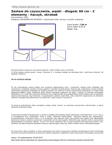http://www.domer.pl Zestaw do czyszczenia, wąski - długośc 60 cm - 2 elementy - haczyk, skrobak kod produktu: 2192 kategoria: AKCESORIA DO KOTŁÓW > czyszczenie kotła, wyciory, szczotki, preparaty Cena brutto: 7,80 zł Cena netto: 6,34 zł Waga: 1kg Dwuelementowy zestaw do czyszczenia palenisk i wnętrz kotłów, piecy, kominków. W sk?ad zestawu wchodzi gracka i haczyk. Wykonane s? z mocnego prostego lub plecionego drutu i zako?czone drewnian? lub plastikow? r?koje?ci?. PO CO CZYŚCIĆ KOCIOŁ W celu oszczędnego zużycia paliwa oraz uzyskania deklarowanej mocy i sprawności cieplnej kotła niezbędne jest utrzymanie w należytej czystości komory spalania i kanałów konwekcyjnych. Podczas gdy użytkowanie naszej instalacji centralnego ogrzewania przebiega we właściwy sposób, nie możemy w stanie powstrzymać zabrudzeniu w środku kotła będącego źródłem ciepła. Wypalanie paliw stałych powoduje osadzanie się sadzy i popiołu na ścianach przewodów spalinowych. To z kolei jest przyczyną obniżenia mocy cieplnej kotła oraz podwyższenia zużycia paliwa. Jest to wywołane poprzez pomniejszony ciąg kominowy i przyspieszenie spalania opału.Więc, żeby udaremnić pogorszenia się własności cieplnych naszego kotła powinniśmy nie zapomnieć o jego częstym czyszczeniu. W komorze paleniskowej kotła szczególną uwagę należy zwrócić na okresowe oczyszczanie mikroszczelin w płycie paleniska automatycznego. Czyszczenia kanałów konwekcyjnych, w których osiadają lotne popioły należy dokonywać systematycznie, co 3÷7 dni, a w szczególności przy użytkowaniu kotła w trybie „paleniska tradycyjnego". Znaczącą kwestią jest częstotliwość przeprowadzania czyszczenia kotła c.o. W przypadku, gdy palonym przez nas paliwem jest węgiel albo odpowiednie gatunkowo drewno, powinno wystarczyć czyszczenie raz na parę tygodni. Natomiast gdy spalamy koks to powinniśmy przeprowadzać to wyraźnie częściej - raz na 7 do 10 dni. Natomiast raz na parę lat powinno się przeczyścić kocioł z tzw. kamienia. Do tego stosujemy specjalne roztwory rozpuszczające osad (np. wodny roztwór kwasu chlorowodorowego). Do czyszczenia służą narzędzia, w które wyposażony jest kocioł. Czyszczenie kanałów konwekcyjnych kotła umożliwiają drzwiczki wyczystne przednie oraz drzwiczki rozpalno-zasypowe. Dodatkowo należy dokonywać okresowego oczyszczania strona: 1/2 wydrukowano: 04-03-2017 http://www.domer.pl/zestaw-do-czyszczenia-waski-dlugosc-60-cm-2-elementy-haczyk-skrobak.html znajdującej się w tylnej części kotła komory powietrznej, w której gromadzi się pył spadający z płyty paleniska automatycznego. Czyszczenia takiego dokonuje się poprzez wyczystkę boczną. Do porządkowania kotłów na paliwa stałe stosujemy druciane szczotki lub pogrzebacze. Duże kotły mozna porządkować sprężonym powietrzem. Czyszczenieprzeprowadza się przez otwory wyczystne kotła, pamiętając o tym, żeby przepustnica spalin w czopuchu była otwarta. Kotły mogą mieć bogatą liczebność tych otworów i rozmaicie je zlokalizowane (u góry, z boku lub z tyłu). Pozostały popiół sprzątamy przez wyczystkę w dolnej części kotła z pomocą wygarniacza. Po ukończeniu pracy musimy pamiętać o tym, żeby hermetycznie zamknąć wszelkie otwory wyczystne. Istotnym również dla prawidłowej eksploatacji kotła jest czyszczenie przewodu kominowego. Po zako?czeniu sezonu grzewczego lub w innych przypadkach planowanego wy??czenia kot?a nale?y doprowadzi? do wypalenia si? zasypanej porcji paliwa. Po wygaszeniu kot?a i ostudzeniu nale?y usun?? z paleniska wszystkie pozosta?o?ci po spalonym paliwie i dokona? czyszczenia oraz konserwacji ca?ego kot?a. Nale?y dokona? konserwacji (poprzez przesmarowanie olejem) wewn?trznych przegród komory paleniskowej oraz wszystkich elementów ruchomych. Na okres przerwy w funkcjonowaniu kot?a w szczególno?ci zabezpieczy? nale?y mechanizm podaj?cy paliwo do komory paleniskowej poprzez przesmarowanie poziomych prowadnic. strona: 2/2 wydrukowano: 04-03-2017 http://www.domer.pl/zestaw-do-czyszczenia-waski-dlugosc-60-cm-2-elementy-haczyk-skrobak.html