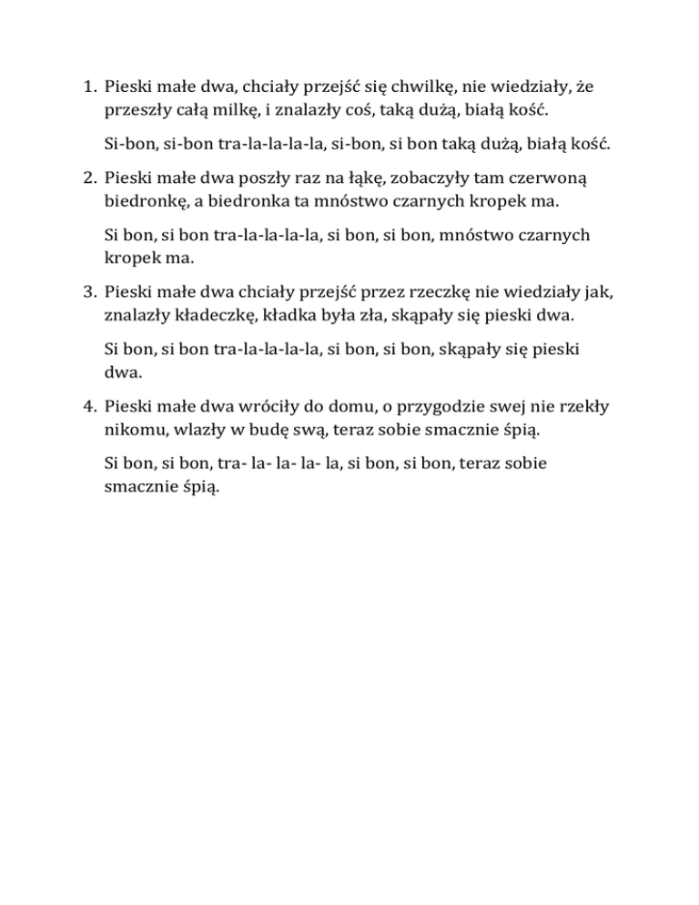 1. Pieski małe dwa, chciały przejść się chwilkę, nie wiedziały, że przeszły całą milkę, i znalazły coś, taką dużą, białą kość. Si-bon, si-bon tra-la-la-la-la, si-bon, si bon taką dużą, białą kość. 2. Pieski małe dwa poszły raz na łąkę, zobaczyły tam czerwoną biedronkę, a biedronka ta mnóstwo czarnych kropek ma. Si bon, si bon tra-la-la-la-la, si bon, si bon, mnóstwo czarnych kropek ma. 3. Pieski małe dwa chciały przejść przez rzeczkę nie wiedziały jak, znalazły kładeczkę, kładka była zła, skąpały się pieski dwa. Si bon, si bon tra-la-la-la-la, si bon, si bon, skąpały się pieski dwa. 4. Pieski małe dwa wróciły do domu, o przygodzie swej nie rzekły nikomu, wlazły w budę swą, teraz sobie smacznie śpią. Si bon, si bon, tra- la- la- la- la, si bon, si bon, teraz sobie smacznie śpią.