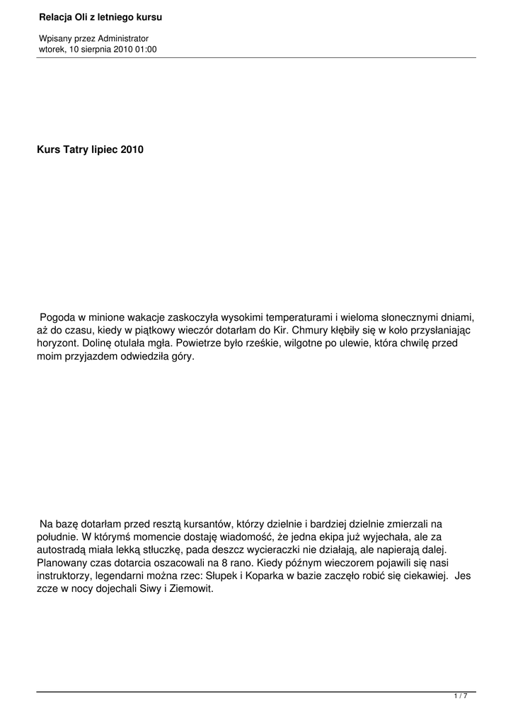 Relacja Oli z letniego kursu Wpisany przez Administrator wtorek, 10 sierpnia 2010 01:00 Kurs Tatry lipiec 2010 Pogoda w minione wakacje zaskoczyła wysokimi temperaturami i wieloma słonecznymi dniami, aż do czasu, kiedy w piątkowy wieczór dotarłam do Kir. Chmury kłębiły się w koło przysłaniając horyzont. Dolinę otulała mgła. Powietrze było rześkie, wilgotne po ulewie, która chwilę przed moim przyjazdem odwiedziła góry. Na bazę dotarłam przed resztą kursantów, którzy dzielnie i bardziej dzielnie zmierzali na południe. W którymś momencie dostaję wiadomość, że jedna ekipa już wyjechała, ale za autostradą miała lekką stłuczkę, pada deszcz wycieraczki nie działają, ale napierają dalej. Planowany czas dotarcia oszacowali na 8 rano. Kiedy późnym wieczorem pojawili się nasi instruktorzy, legendarni można rzec: Słupek i Koparka w bazie zaczęło robić się ciekawiej. Jes zcze w nocy dojechali Siwy i Ziemowit. 1/7 Relacja Oli z letniego kursu Wpisany przez Administrator wtorek, 10 sierpnia 2010 01:00 Sobota Rano w pokoju obok leżeli półprzytomni nocni napieracze: Tworke, Darek, Kropa i skądś dojechał Paweł. Cała ekipa kursowa była w komplecie. Po sprawdzeniu wróżek meteo okazało się, iż wczorajsze pogodowe zmiany mogą okazać się dłuższymi fanaberiami. Koło południa Słupek z Koparką poinformowali, że idziemy do Jaskini Czarnej na trawers. Zasugerowali, że będzie to dobre na początek skoro jesteśmy zmęczeni podróżą. Dojście do otworu biegnie Doliną Kościeliską, aż do polany od długopisów, ( czyli Polany Pisanej) dalej trzeba odbić ostro pod górę. Rozgrzewka wprawiła kilka osób o zadyszkę. Przy otworzę wstępnie ustaliliśmy, co i jak kto ma robić, jak się w trakcie akcji okazało nie mieliśmy dopracowanego tego zbyt szczegółowo, co nieznacznie spowolniło akcję. Jaskinia jest warta trudów, jakie w niej czekają. Czemu od razu trudów? Trawersy, wspinanie, kilka zjazdów. Cały czas z worem na plecach. Przynajmniej mnie to zmęczyło. Wypadałoby w kilku słowach opisać atmosferę naszej ekipy, ale to mi bardzo ciężko przychodzi, jeśli mam być cenzuralna. I wcale nie mam nic negatywnego na myśli. Specyfika chodzenia po jaskini z Słupkiem i Koparką można poczuć tylko na własnych uszach. Kto z obecnych pamięta o tym jak Słupek rozmawiał z własnym echem? Tak, nasz instruktor tak bardzo chciał, aby wszyscy go słuchali, że do przodu krzyczał swoje uwagi a do tyłu „ cicho tam” nie zważając, że ucisza własne słowa. Gdzieś w połowie drogi przed zjazdem ślimakiem, coś za długo czekamy na tych z tyłu. Po chwili okazało się, że nie bez powodu. Siwy spadł z małego progu całe szczęście wprost w ręce Koparki Niestety to go całkowicie nie uchroniło i uszkodził sobie stopę. Na początku przemawiało to za skręceniem. Tempo z „kuśtykiem” było i tak lepszym scenariuszem niż jak by się cos poważniejszego stało. Tuż przed wyjściem w czasie ostatniej wspinaczki Darek niechcący zapragną eksplorować nowe korytarze i zapędził się w lewo w ślepy zaułek. W tamtym momencie, postanowiłam zostać i zdeporęczować jedną z lin. Chwilę potem odebrało mi całkiem siły i dotarło do mnie cale zmęcz. Jeszcze przez chwilę chciałam zacisnąć zęby i mały kawałek wejść z dwoma worami, kiedy Darek zaproponował swoją pomoc. Długo nie musiał mnie namawiać abym zostawiła mu na przepince wór. W takich chwilach wychodzi jak bardzo zespołowe jest chodzenie po jaskiniach. Chyba koło 23 a może już bliżej północy 2/7 Relacja Oli z letniego kursu Wpisany przez Administrator wtorek, 10 sierpnia 2010 01:00 wyszliśmy z dziury. Byłam wymęczona i myślałam tylko o tym jak znaleźć się szybko w bazie. Padał deszcz. Schodząc po poręczówkach usłyszałam z dołu, że chyba nie do końca wiemy którędy iść. Schodziliśmy w dół, później odbiliśmy w lewo. Po pewnym czasie staliśmy na wielkiej polanie najpewniej Upłaziańskiej. W tamtej chwili chyba nikt nie był na tyle mądry, aby w 100% określić, w którą stronę powinniśmy iść. Dlatego wykorzystują power Koparki czekaliśmy, aż pobiegnie na zwiady. Za jakiś czas widać było światła jakiś ludzi to dało do myślenia gdzie może być szlak. Na bazę dotarliśmy koło drugiej w nocy. Niedziela Na reście każdy mógł odespać swój deficyt snu. Za oknem leje, leje, leje. Plan na dzień Krupowi i uzupełnienie zapasów, bo ponoć o ile na to pogoda pozwoli kolejny wyjście miało być z biwakiem w górach. Batoniki i inne szturm żarcie wpadało do sklepowych koszyków. Poniedziałek 3/7 Relacja Oli z letniego kursu Wpisany przez Administrator wtorek, 10 sierpnia 2010 01:00 Leje, leje, leje. Skoro lało to poszliśmy się pomoczyć. Koło południa powstał plan, aby odwiedzić J. Wodna Pod Pisaną. Suchym wąskim korytarzem wchodzimy. Chwilę penetrujemy wąskie zakamarki. Paweł pokazuje się od strony znajdywacza zacisków i mistrza chodzenia bez zamoczenia. Ja wczołguję się na jakieś kości. Ogólnie jaskinia się nam podoba i rozbawieni postanawiamy opuścić dziurę razem z potokiem. Na zewnątrz wita nas grupa fotoreporterów kursowych i turystów :) Wtorek Mamy przygotowane wory, aby odwiedzić dwie jaskinie: Małą i Marmurową. Dojście pod otwór zajęło około dwie godziny. Tym razem będziemy oglądać jaskinie w masywie Czerwonych Wierchów, dokładnie w Dolinie Mułowej. Pierwsza jaskinia, do której wchodzimy ma ciekawą historię eksploracji. Jak na Małą jest bardzo duża, nawet bez największej w Tatrach Sali Fakro. Nie wiem czy trzeba tą Jaskinię reklamować. Kto był ten wie, że warto, kto nie był pewnie już planuje, aby tam iść. Chyba na każdym zrobi wrażenie jak usłyszy, że do ostatniej Sali można zmieścić kościół Mariacki z Krakowa. Z jaskini wyszłam ostatnia. Nie zdążyłam jeszcze powitać dziennego światła i słyszę: „Szybcie