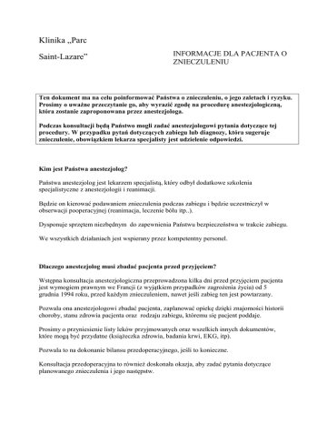 Klinika „Parc Saint-Lazare” INFORMACJE DLA PACJENTA O ZNIECZULENIU Ten dokument ma na celu poinformować Państwa o znieczuleniu, o jego zaletach i ryzyku. Prosimy o uważne przeczytanie go, aby wyrazić zgodę na procedurę anestezjologiczną, która zostanie zaproponowana przez anestezjologa. Podczas konsultacji będą Państwo mogli zadać anestezjologowi pytania dotyczące tej procedury. W przypadku pytań dotyczących zabiegu lub diagnozy, która sugeruje znieczulenie, obowiązkiem lekarza specjalisty jest udzielenie odpowiedzi. Kim jest Państwa anestezjolog? Państwa anestezjolog jest lekarzem specjalistą, który odbył dodatkowe szkolenia specjalistyczne z anestezjologii i reanimacji. Będzie on kierować podawaniem znieczulenia podczas zabiegu i będzie uczestniczył w obserwacji pooperacyjnej (reanimacja, leczenie bólu itp..). Dysponuje sprzętem niezbędnym do zapewnienia Państwu bezpieczeństwa w trakcie zabiegu. We wszystkich działaniach jest wspierany przez kompetentny personel. Dlaczego anestezjolog musi zbadać pacjenta przed przyjęciem? Wstępna konsultacja anestezjologiczna przeprowadzona kilka dni przed przyjęciem pacjenta jest wymogiem prawnym we Francji (z wyjątkiem przypadków zagrożenia życia) od 5 grudnia 1994 roku, przed każdym znieczuleniem, nawet jeśli zabieg ten jest powtarzany. Pozwala ona anestezjologowi zbadać pacjenta, zaplanować opiekę dzięki znajomości historii choroby, stanu zdrowia pacjenta oraz rodzaju zabiegu, któremu się pacjent poddaje. Prosimy o przyniesienie listy leków przyjmowanych oraz wszelkich innych dokumentów, które mogą być przydatne (książeczka zdrowia, badania krwi, EKG, itp). Pozwala to na dokonanie bilansu przedoperacyjnego, jeśli to konieczne. Konsultacja przedoperacyjna to również doskonała okazja, aby zadać pytania dotyczące planowanego znieczulenia i jego następstw. Pozwoli to anestezjologowi, który będzie się Państwem opiekował w dniu zabiegu, na dysponowanie kompletną wiedzą niezbędną do zapewnienia Państwu bezpieczeństwa. Ponadto konsultacja przedoperacyjna zostanie przeprowadzona w miejscu hospitalizacji na kilka godzin przed zabiegiem. Ze względu na harmonogram operacji, istnieje możliwość, że znieczulenie przed zabiegiem wykona Państwu inny anestezjolog niż ten który przeprowadzał z Państwem konsultację. Będzie on posiadał wszystkie elementy niezbędne do realizacji zabiegu, uzyskane podczas konsultacji i/lub wstępnej wizyty anestezjologicznej, jak również wyniki wywiadu przedoperacyjnego jeśli miał miejsce. Dlaczego należy pozostać na czczo? Bycie na czczo przed znieczuleniem (bez jedzenia, bez picia, bez tytoniu itd.) jest niezbędne, aby bezpiecznie przejść zabieg operacyjny. Warunki powstrzymania się od jedzenia i picia zostaną Państwu przedstawione w trakcie konsultacji. CZYM JEST ZNIECZULENIE? Znieczulenie pozwala na realizację zabiegu chirurgicznego, położniczego lub medycznego (endoskopia, badanie radiologiczne itp.) z wyłączeniem lub zmniejszeniem dolegliwości bólowych. Istnieją dwa główne rodzaje znieczulenia: znieczulenie ogólne i znieczulenie miejscowe. Znieczulenie ogólne jest porównywalne do snu, spowodowanego przez podanie specyficznych środków medycznych (dożylnie lub wziewnie) przy pomocy odpowiedniej aparatury. Znieczulenie miejscowe pozwala, za pomocą różnych technik, znieczulić tę część ciała, na której będzie przeprowadzona operacja. Zasada działania tego znieczulenia polega na blokowaniu nerwów wokół operowanego miejsca poprzez wstrzykiwanie środka znieczulającego miejscowo. Znieczulenie ogólne może być brane pod uwagę lub stać się konieczne, zwłaszcza w przypadku nieskuteczności znieczulenia miejscowego. Znieczulenie podpajęczynówkowe i znieczulenie zewnątrzoponowe stanowią dwa szczególne rodzaje znieczulenia miejscowego, gdy znieczulenie jest wstrzykiwane w pobliżu rdzenia kręgowego i nerwów z niego wychodzących. Wszelkie znieczulenia, ogólne lub miejscowe w przypadku planowanego zabiegu wymagają konsultacji na kilka dni wcześniej i wizyty anestezjologicznej w przeddzień lub kilka godzin przed znieczuleniem zgodnie z zasadami hospitalizacji. Tak jak samo znieczulenie, konsultacje i wizyty są przeprowadzane przez lekarza anestezjologa. Podczas konsultacji i wizyty zachęcamy Państwa do zadawania pytań przydatnych dla Państwa wiedzy. Rodzaj znieczulenia zostanie ustalony na podstawie planowanego zabiegu, Państwa stanu zdrowia i wyników badań dodatkowych, jeśli były zlecone. Ostateczny wybór jest decyzją i odpowiedzialnością anestezjologa który będzie wykonywał znieczulenie. Jak będą Państwo monitorowani podczas trwania znieczulenia i procesu wybudzania? Znieczulenie, bez względu na rodzaj, odbywa się w pomieszczeniu wyposażonym w odpowiedni sprzęt, dostosowanym do potrzeb Państwa zabiegu i sprawdzanym przed każdym użyciem. Wszystkie urządzenia i wyroby medyczne używane w trakcie znieczulenia są albo jednorazowe albo zdezynfekowane lub wysterylizowane zgodnie z obowiązującymi normami. Po zakończeniu operacji zostaną Państwo przeniesieni na salę nadzoru pooperacyjnego (sala wybudzeń), gdzie będą Państwo monitorowani w sposób ciągły przed udaniem się do swojej sali lub opuszczaniem placówki. Podczas znieczulenia i przejścia na salę nadzoru pooperacyjnego będą Państwo pod opieką wykwalifikowanego personelu pielęgniarskiego oraz pod nadzorem lekarza anestezjologa. Co w przypadku transfuzji krwi? W przypadku prawdopodobieństwa przetaczania krwi w trakcie zabiegu (transfuzja homologiczna, transfuzja autologiczna), otrzymają Państwo informacje o technikach i ryzyku transfuzji. Jakie jest ryzyko znieczulenia? Każdy zabieg, nawet przeprowadzony kompetentnie i zgodnie z wiedzą medyczną wiąże się z ryzykiem. Obecne możliwości monitorowania znieczulenia i czasu wybudzenia pozwalają szybko wykryć nieprawidłowości i je leczyć. J
